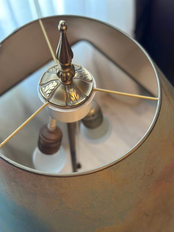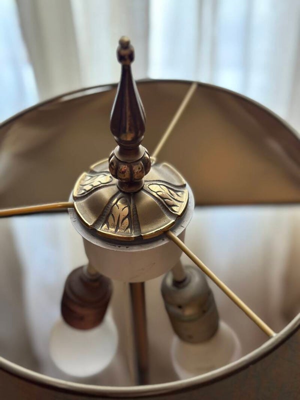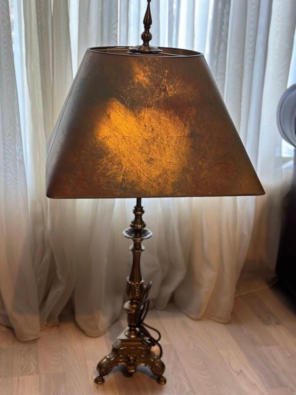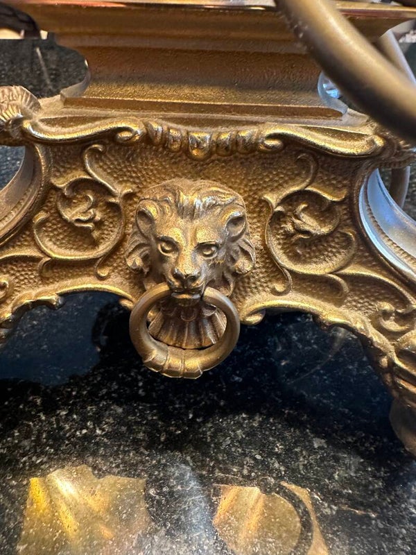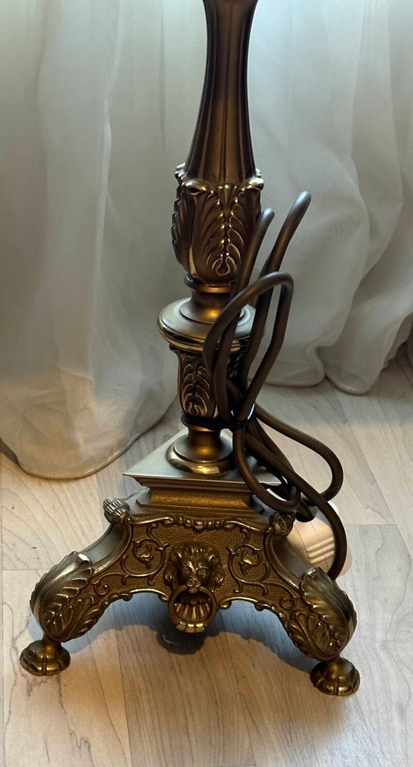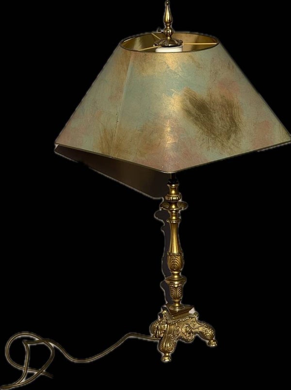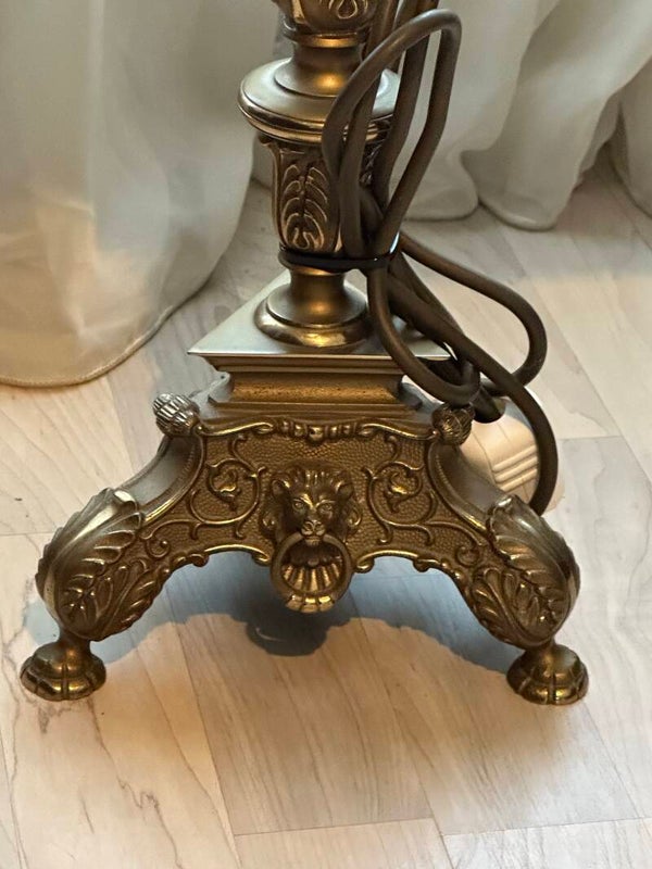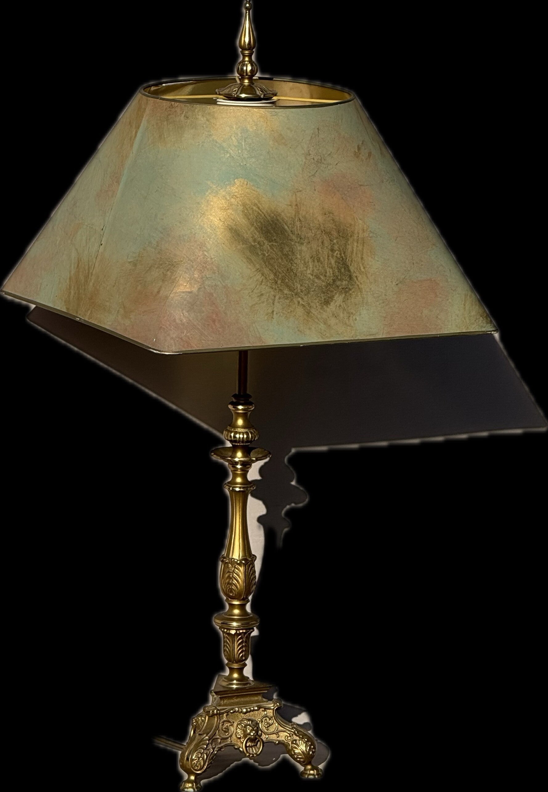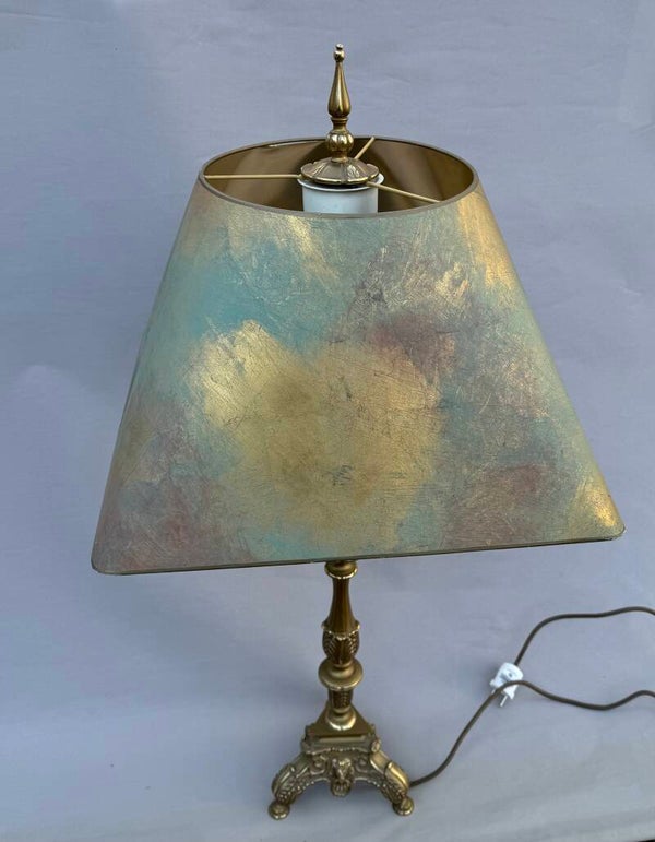Beautiful French table lamps in Empire style, made of a green tole tapered column on a wooden footh with lion heads, and stylish ornate brass details.This has a great appearance and is probably from the 50s or earlier.