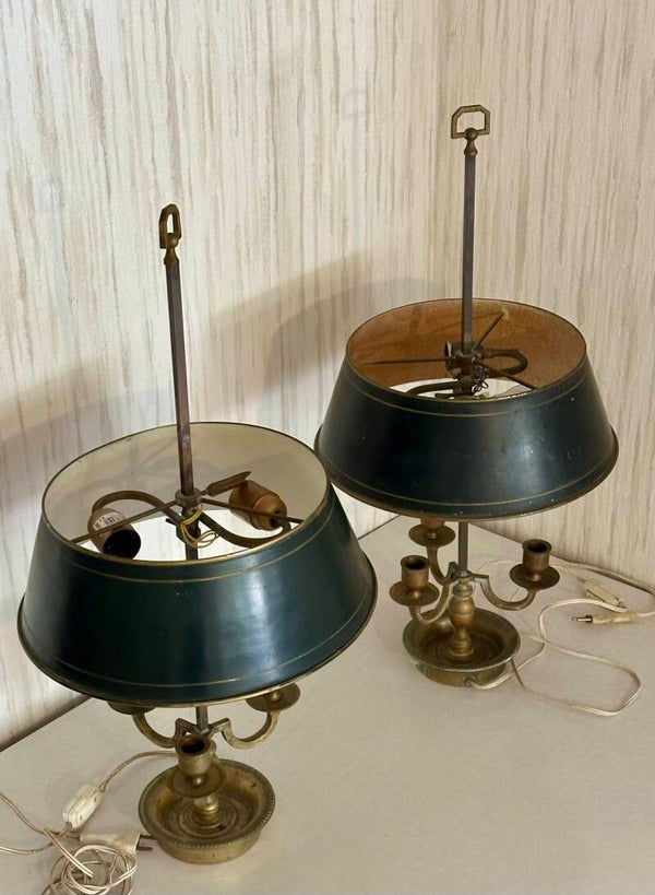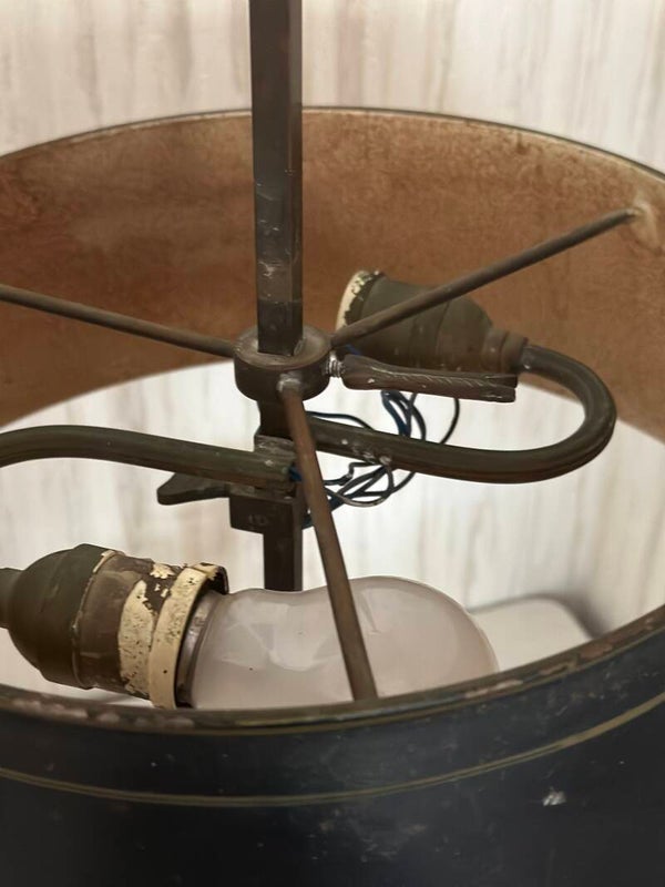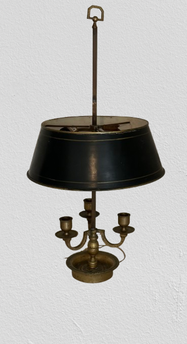 A chiseled bronze three-light bouillotte lamp with a lacquered metal sheet lampshade.