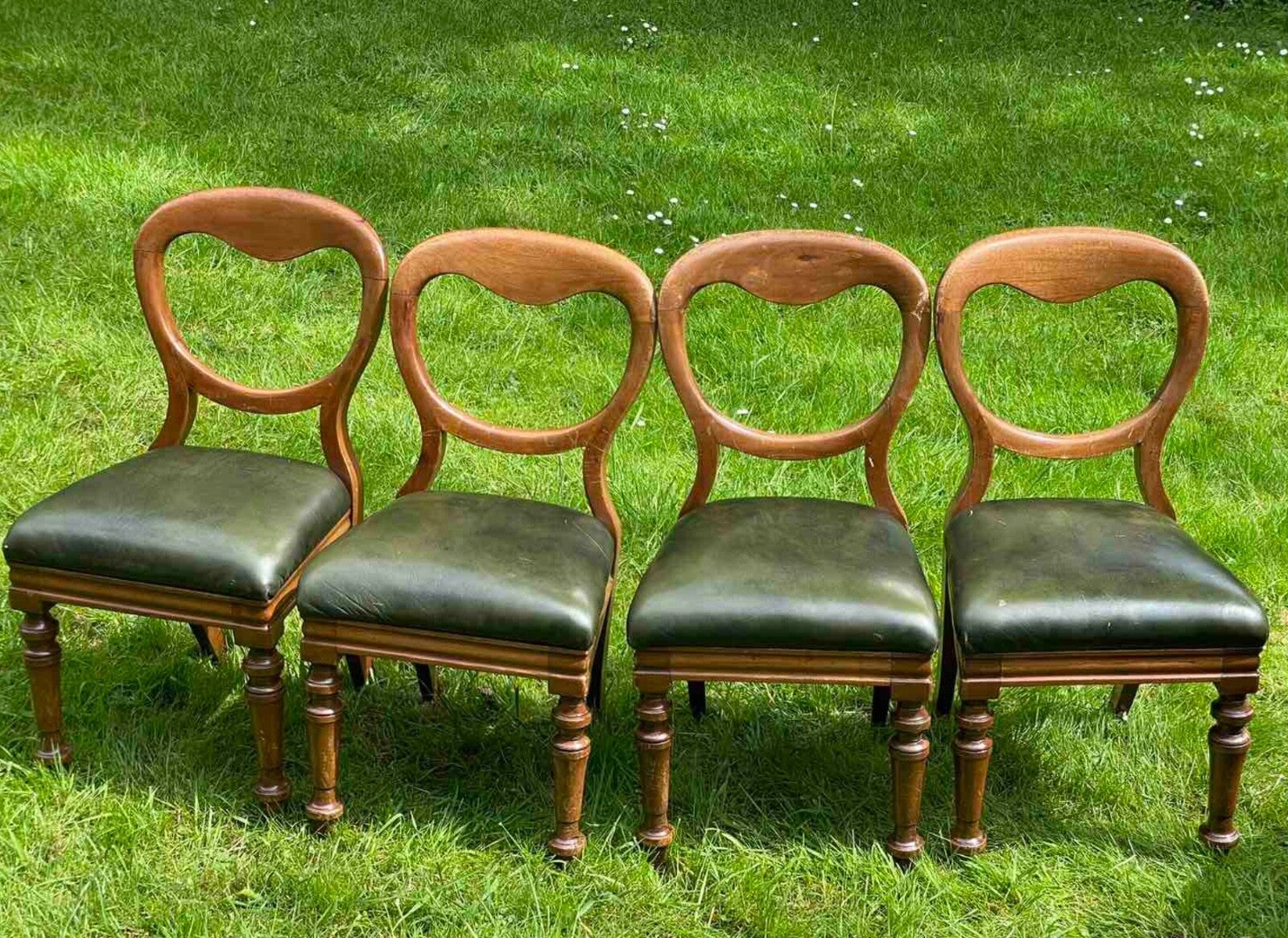 Antieke Eettafel Set Rond, Leren Stoelen Ballon Rug