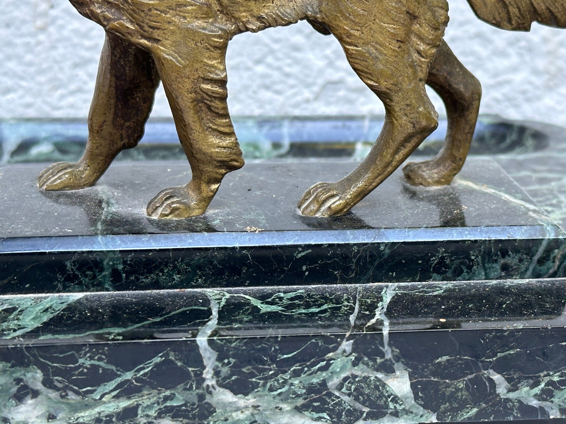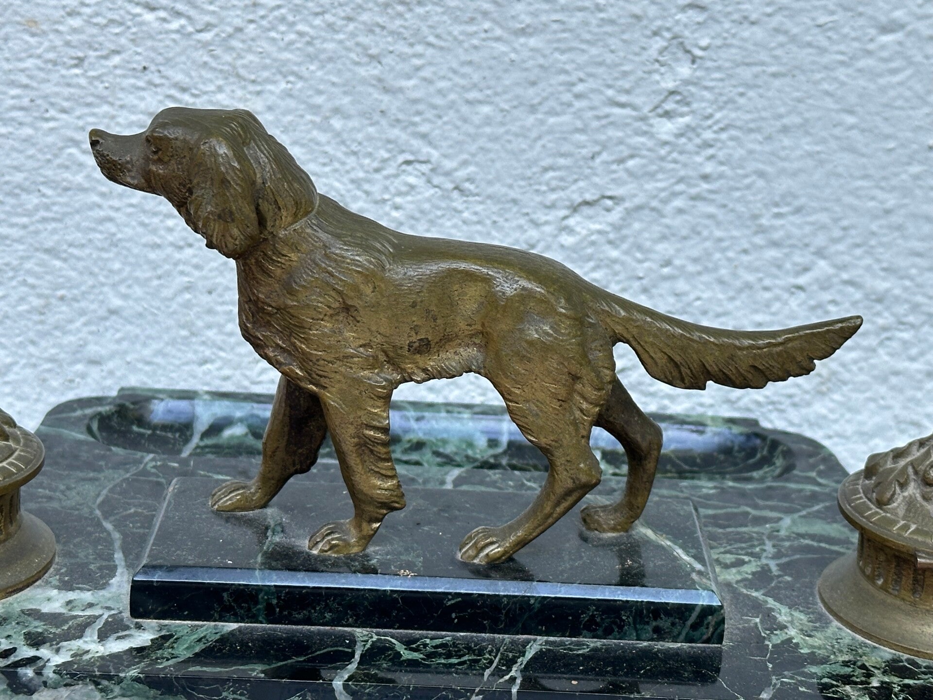 Antique French Empire Style Figurative Bronze and Marble Desk Inkwell with Hunting Dog