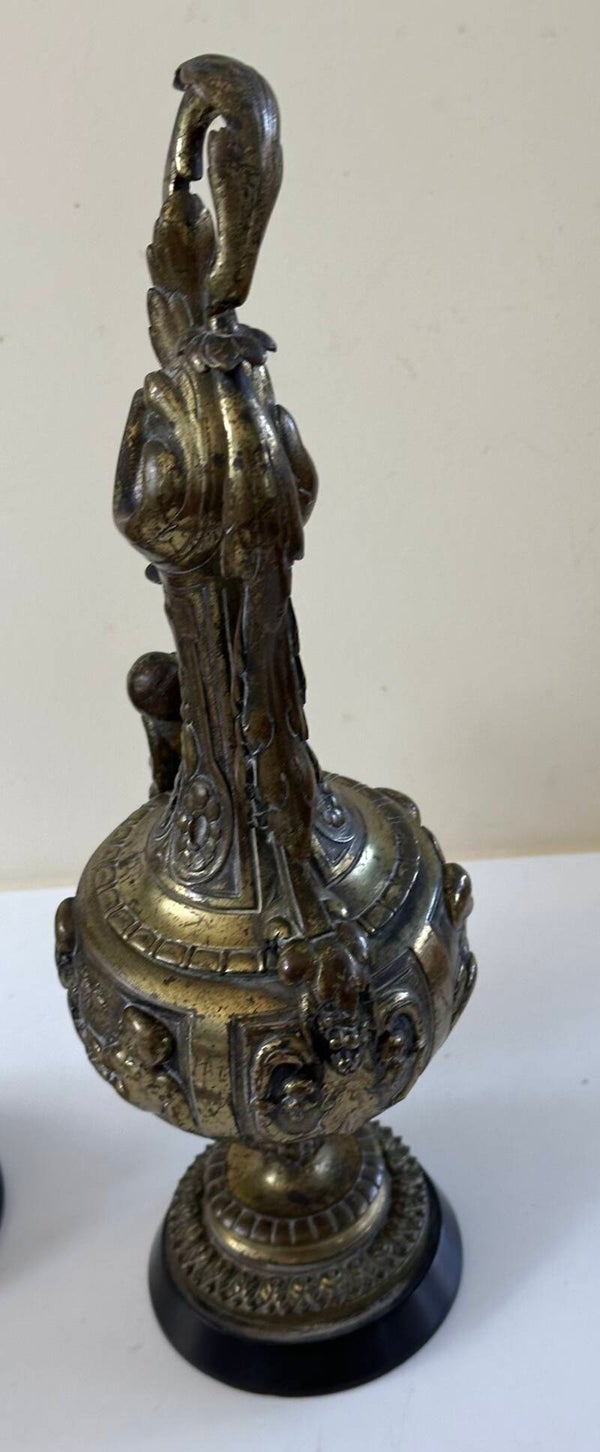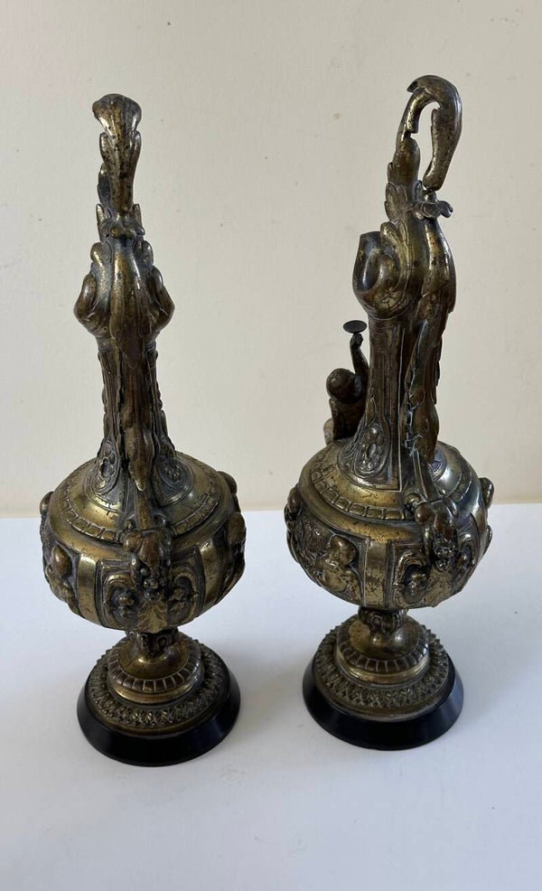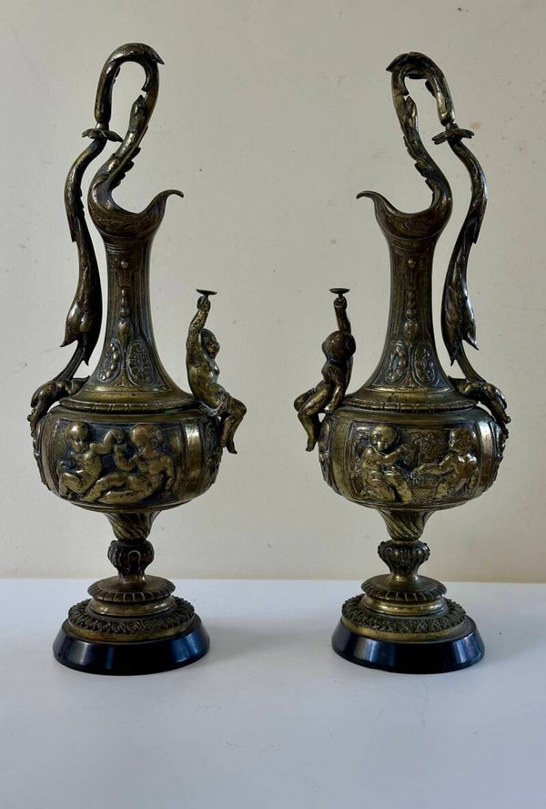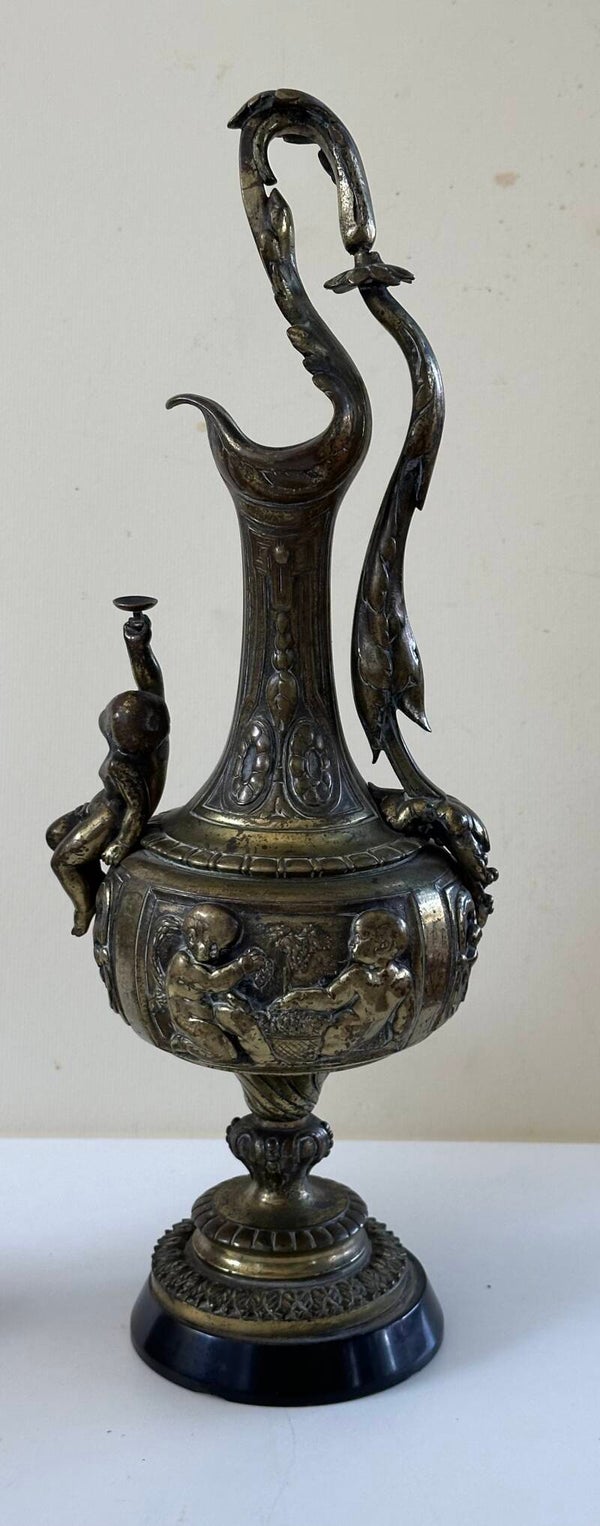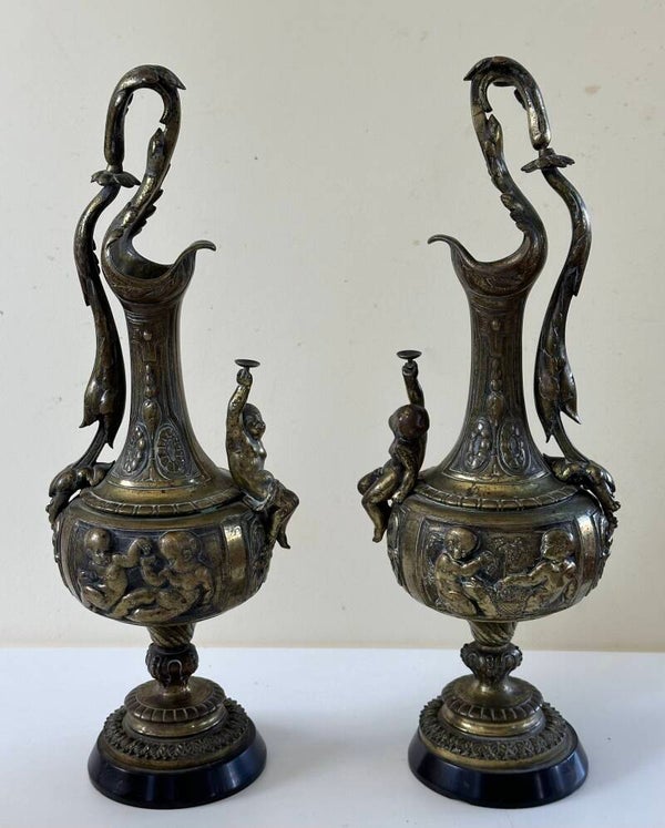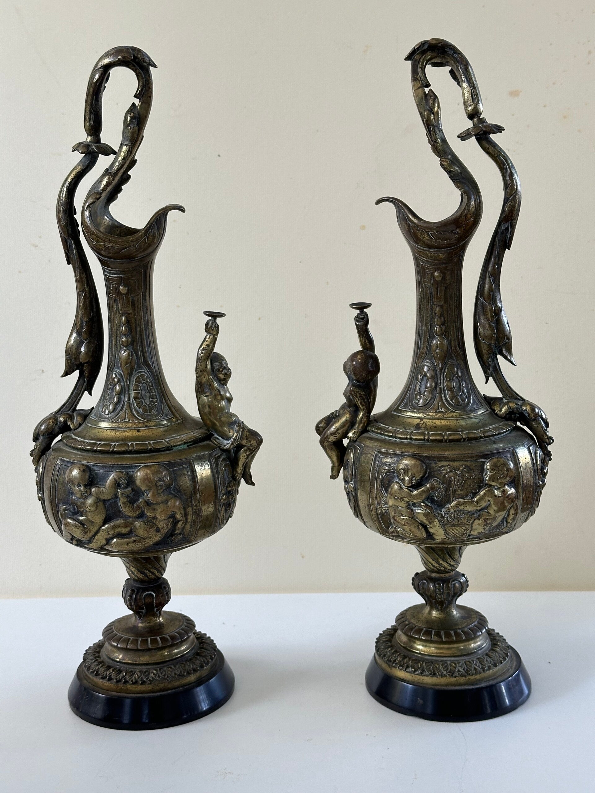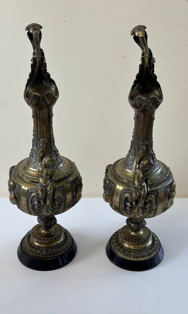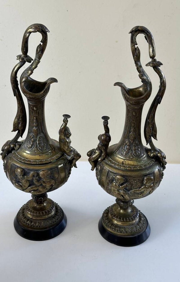 Pair of French Classical Bronze Slate Ewer Cherubs Putti Pitcher