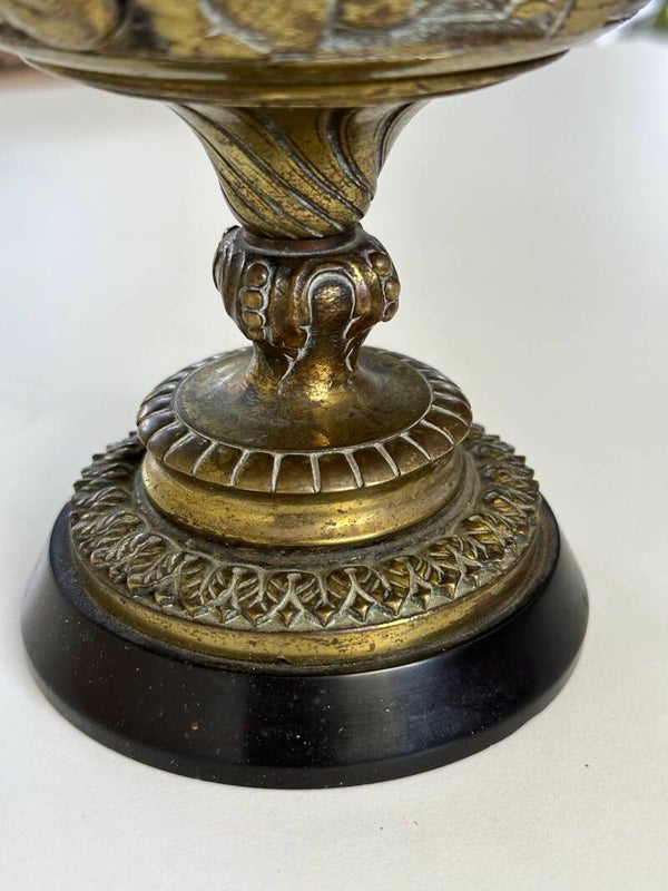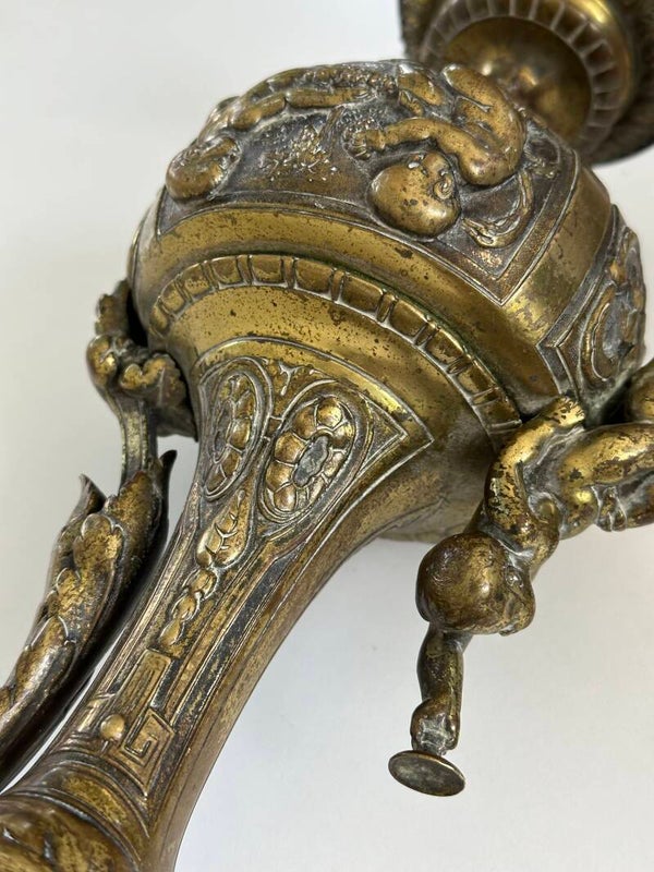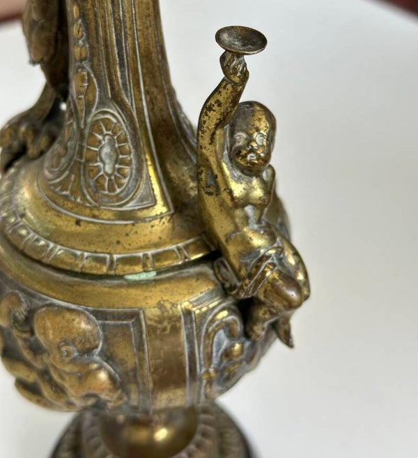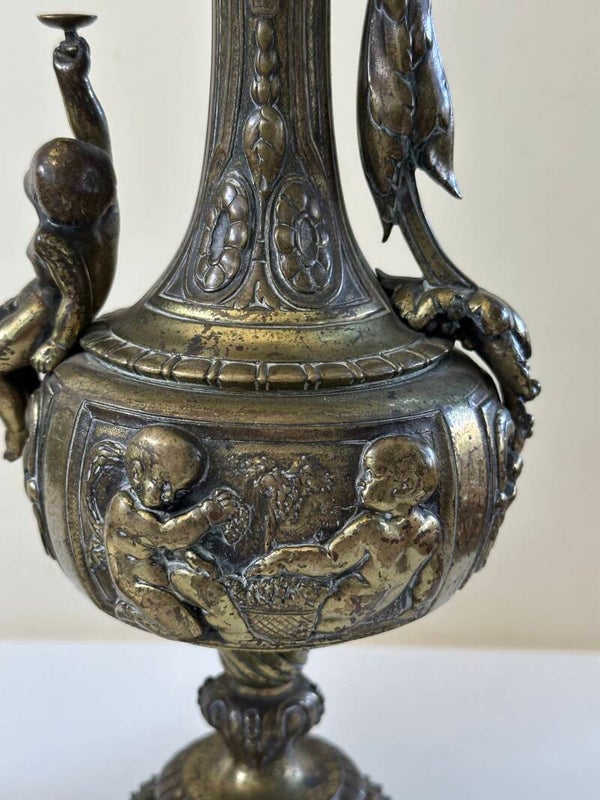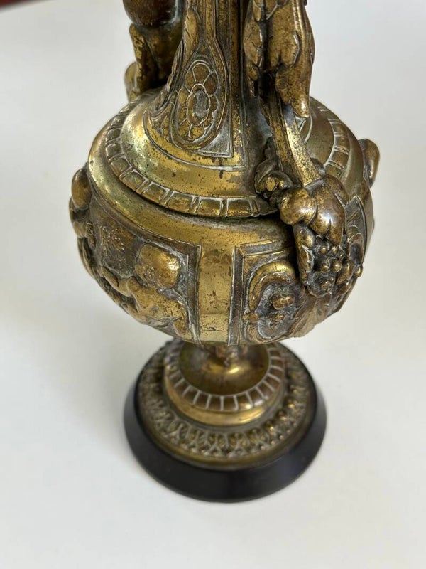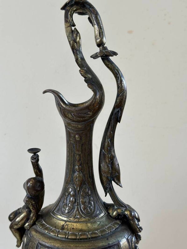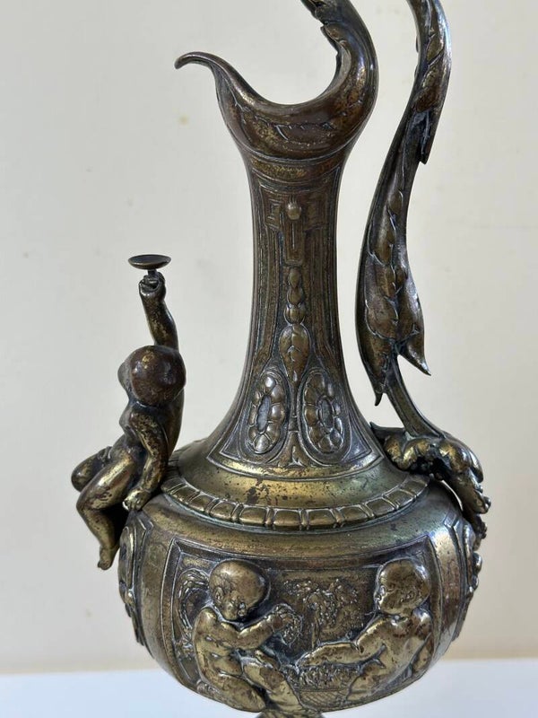 Traditional French décor of the 19th century, a bronze and black slate ewer. This pitcher would have been placed on the mantle most likely originally there was a pair. Today we are offering a single ornamental jug made in France in the mid 1800’s. It is made from solid bronze and depicts a cherub holding a cup towards the sky. One side it has two cherubs crushing grapes, the other side another relief panel cherubs holding grapes. The handle is tall and slender acanthus grape leaves. It is done in the renaissance revival style, repousse and elaborate decoration. It is very heavy.