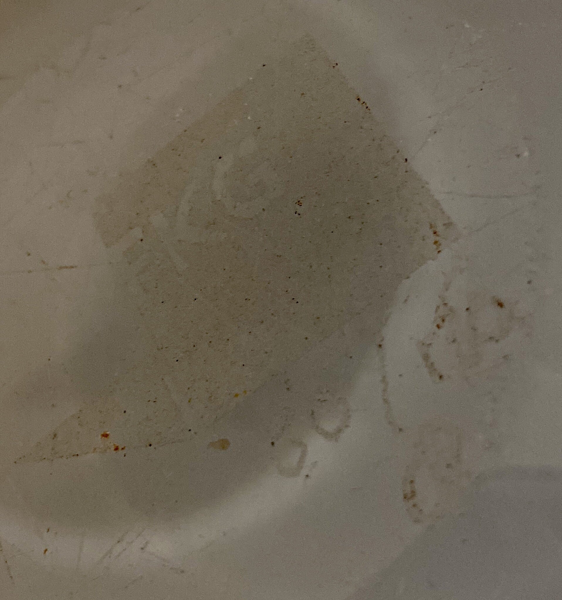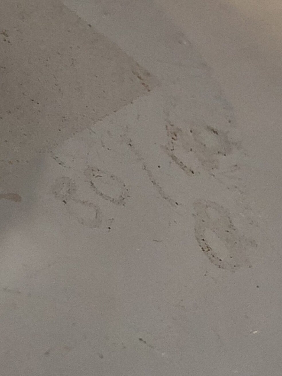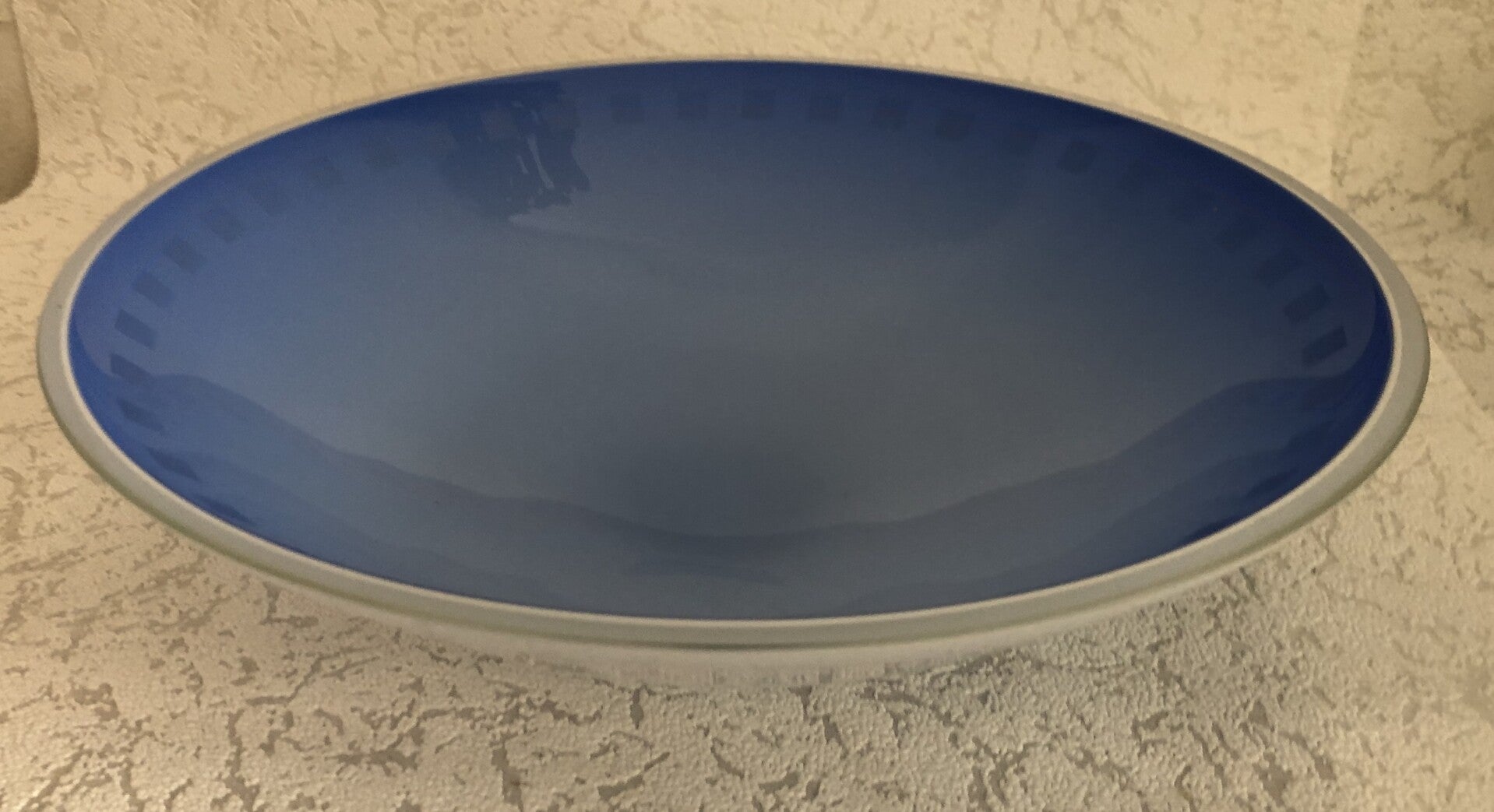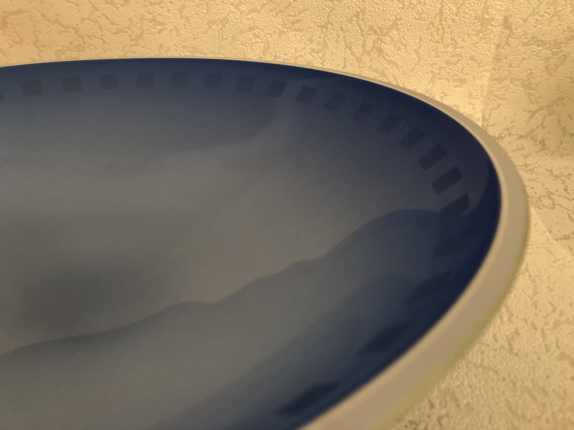 Buitenkant van de schaal is opaline blauw en de binnenkant bevat een licht blauw verloop. Hierin zijn langs de rand kleine vierkantjes uitgespaard.