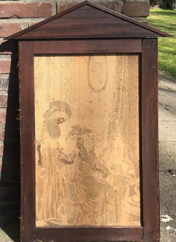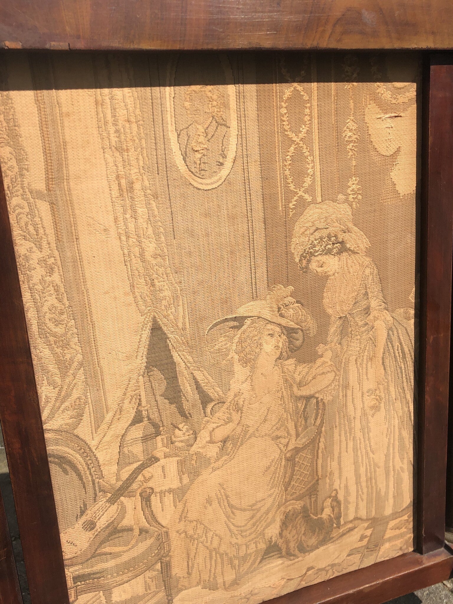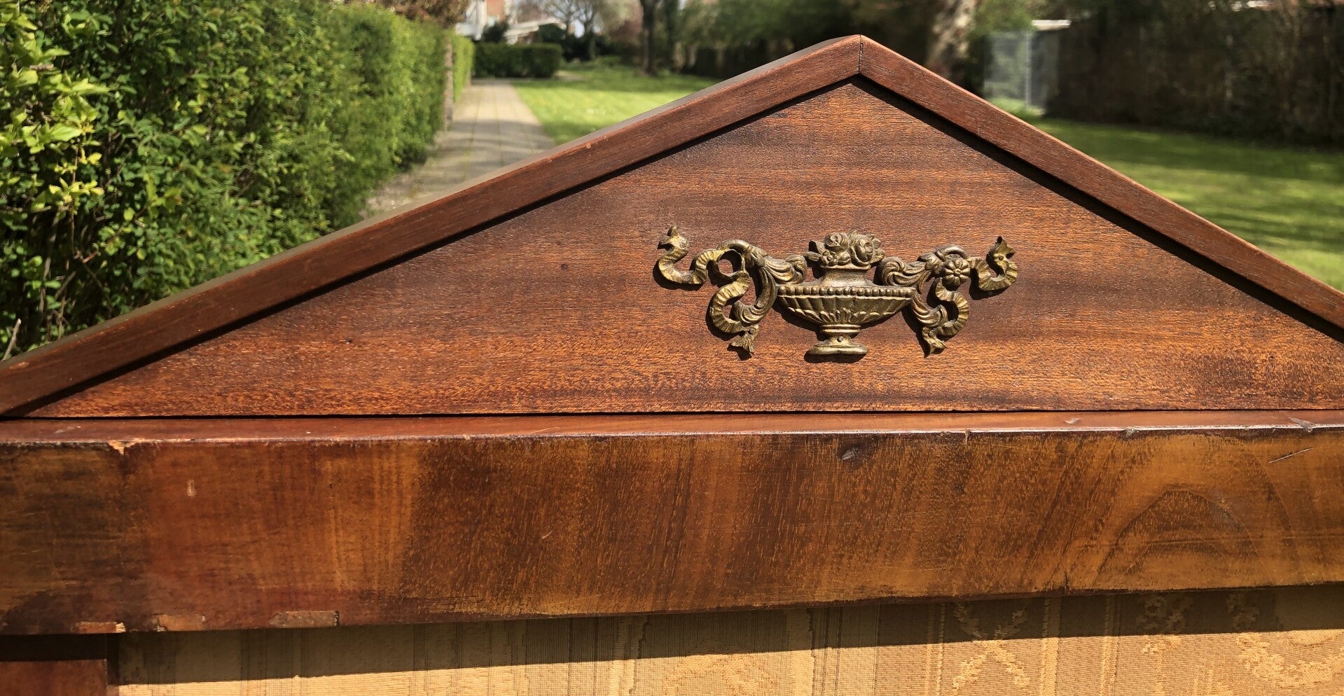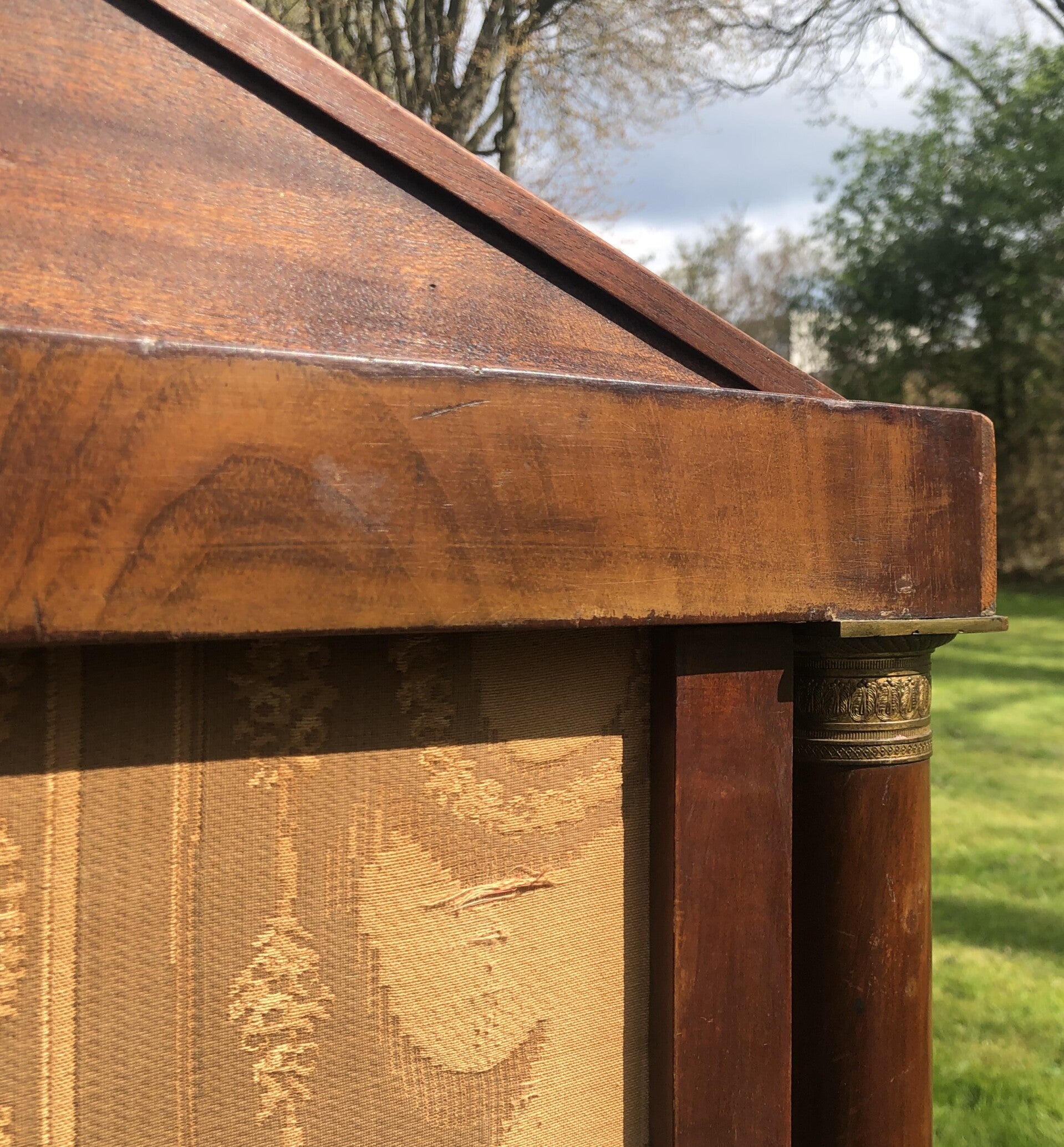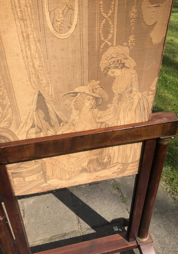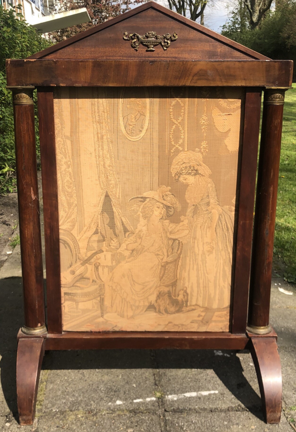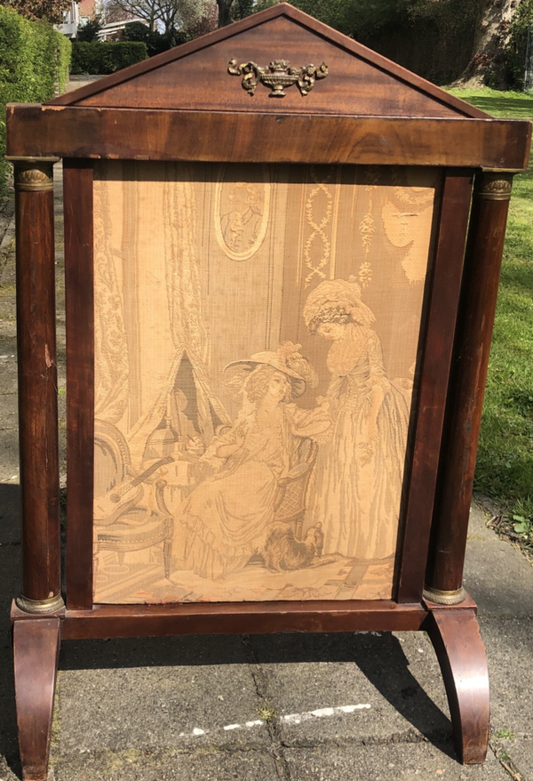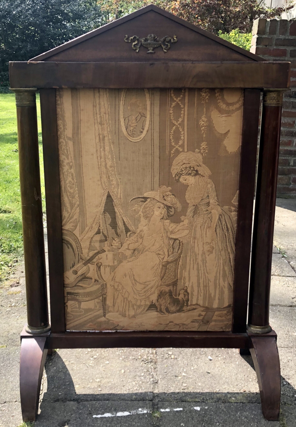 Antieke openhaardscherm in empire stijl. Brandscherm gemaakt van mahonie, met uitschuifbare wandplaat. De palen en steunpoten zijn glad. De dorpel is geschulpt in de vorm van een beugel en de bovenste dorpel wordt in een platte boog gestoken. Afmetingen: hoogte 95cm, lengte 64cm en breedte 35cm.