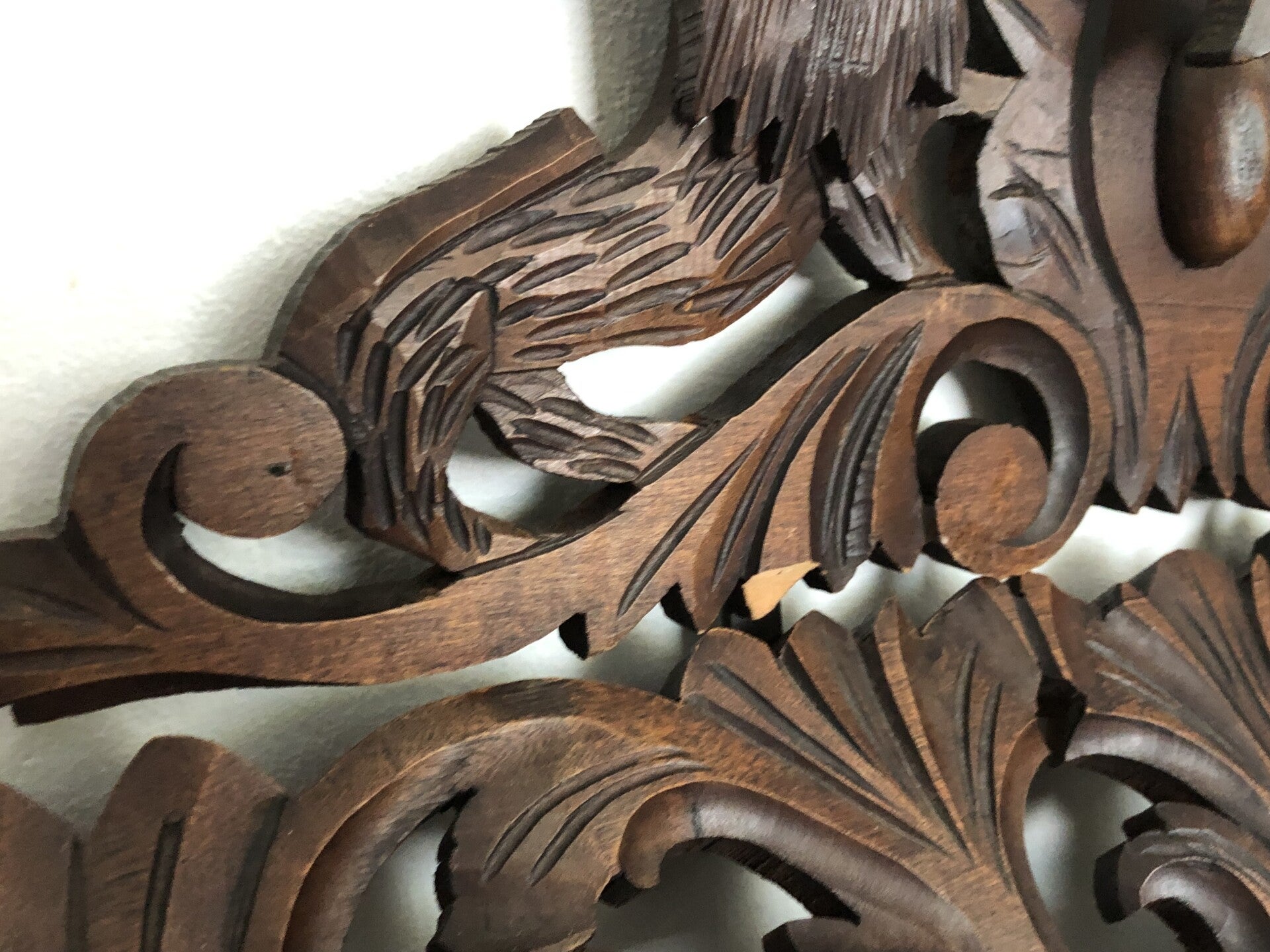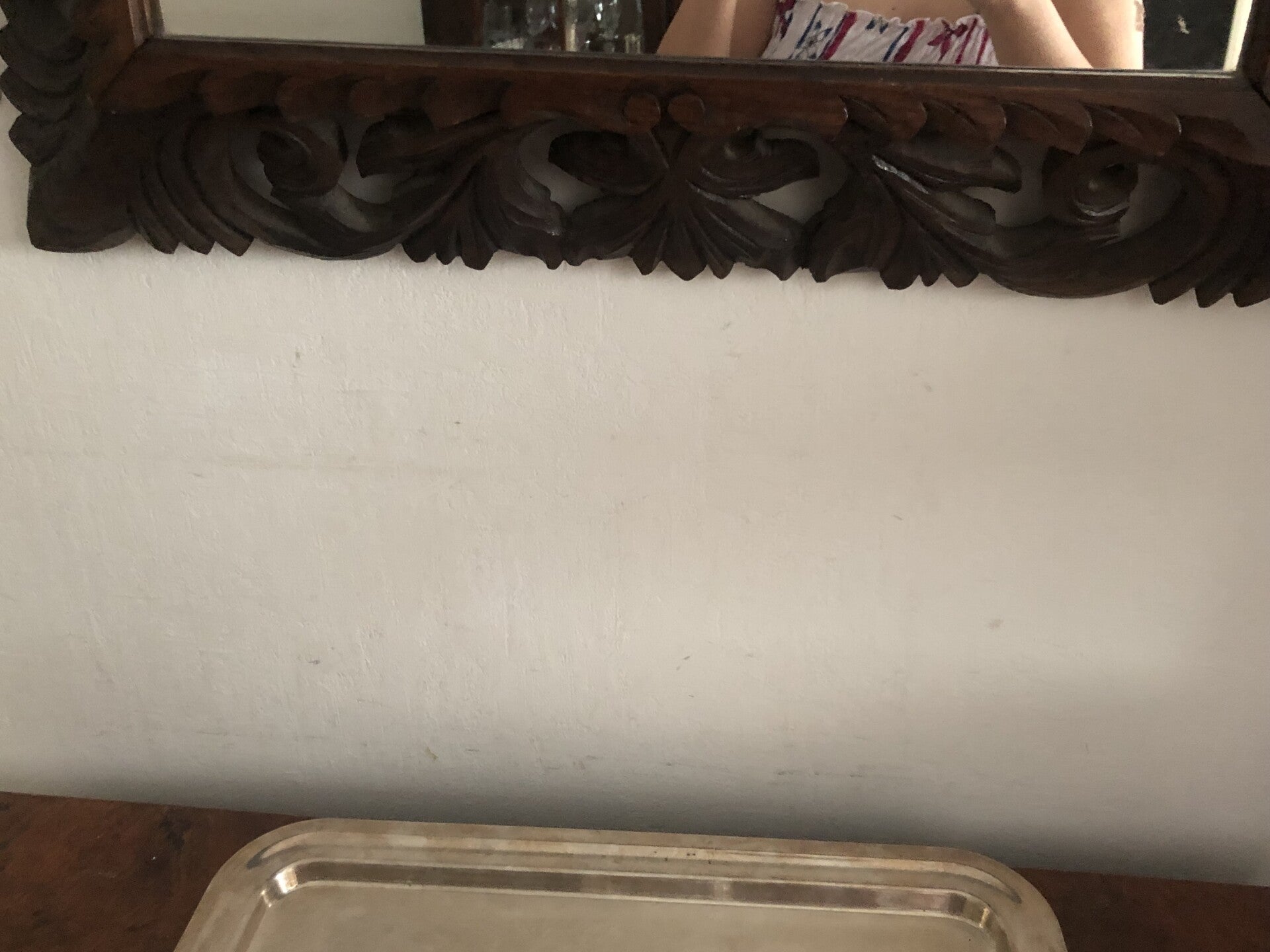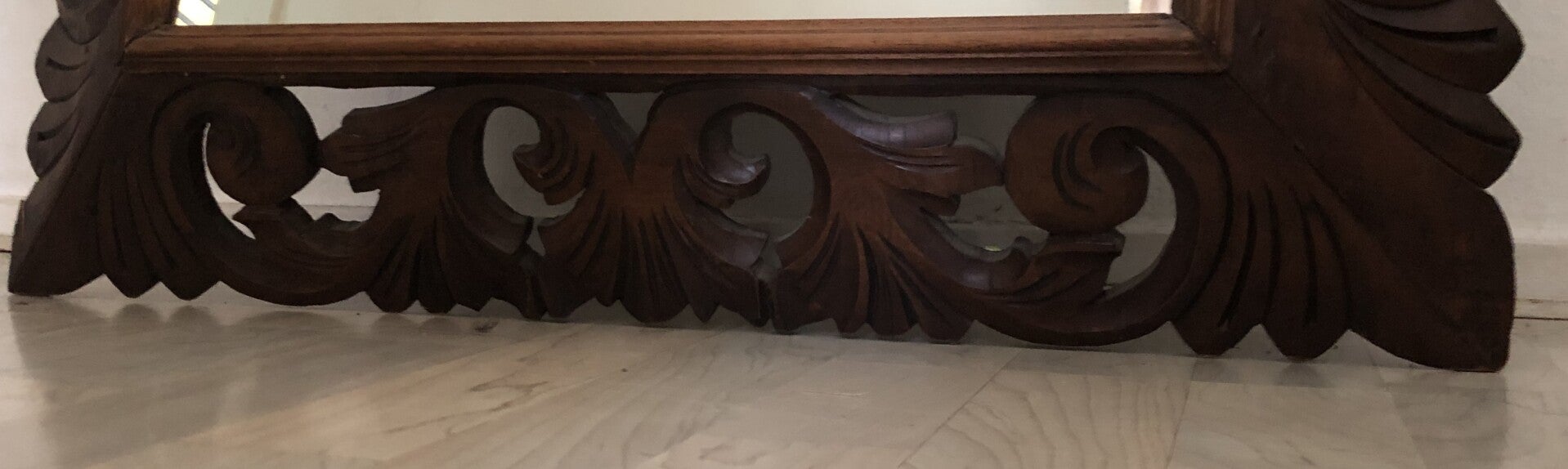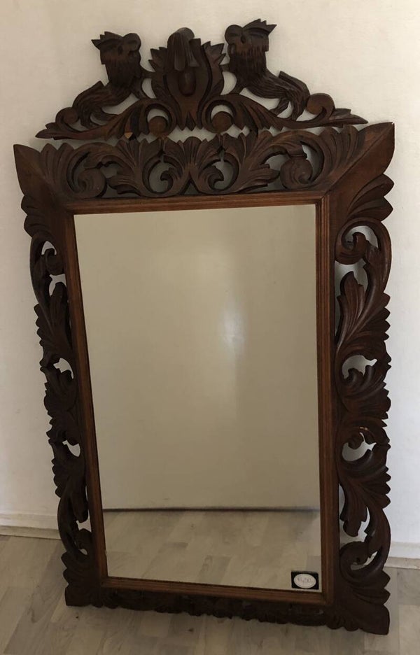 Spiegel met veel houtsnijwerk. Afmetingen: hoogte: 107cm x lengte: 77cm x dikte: 2cm.