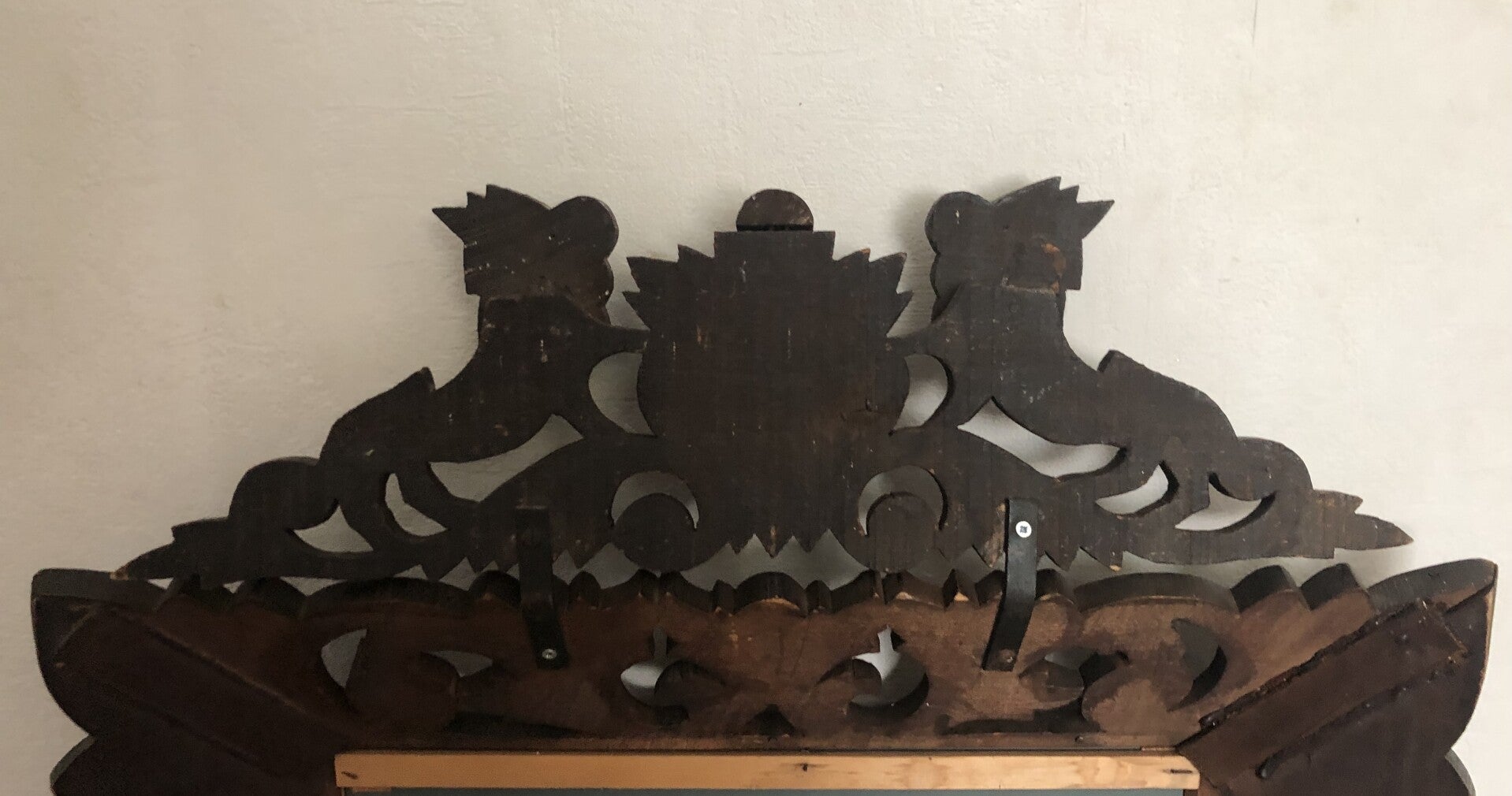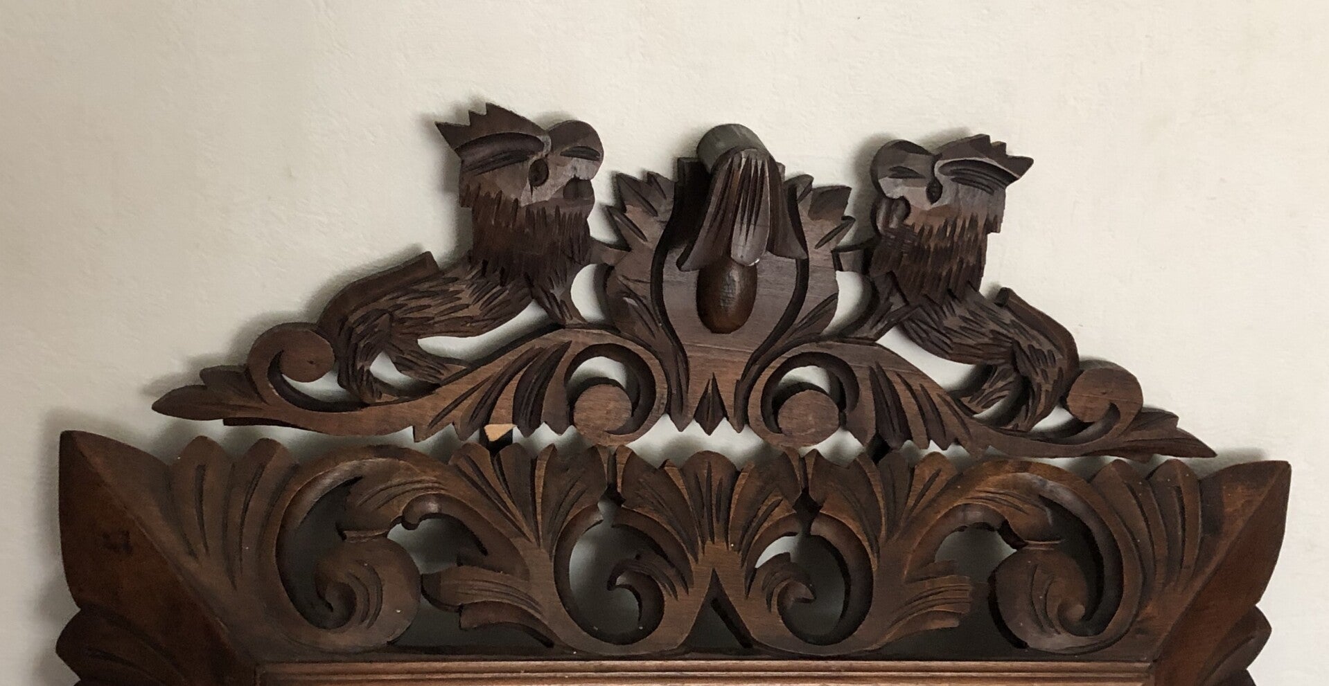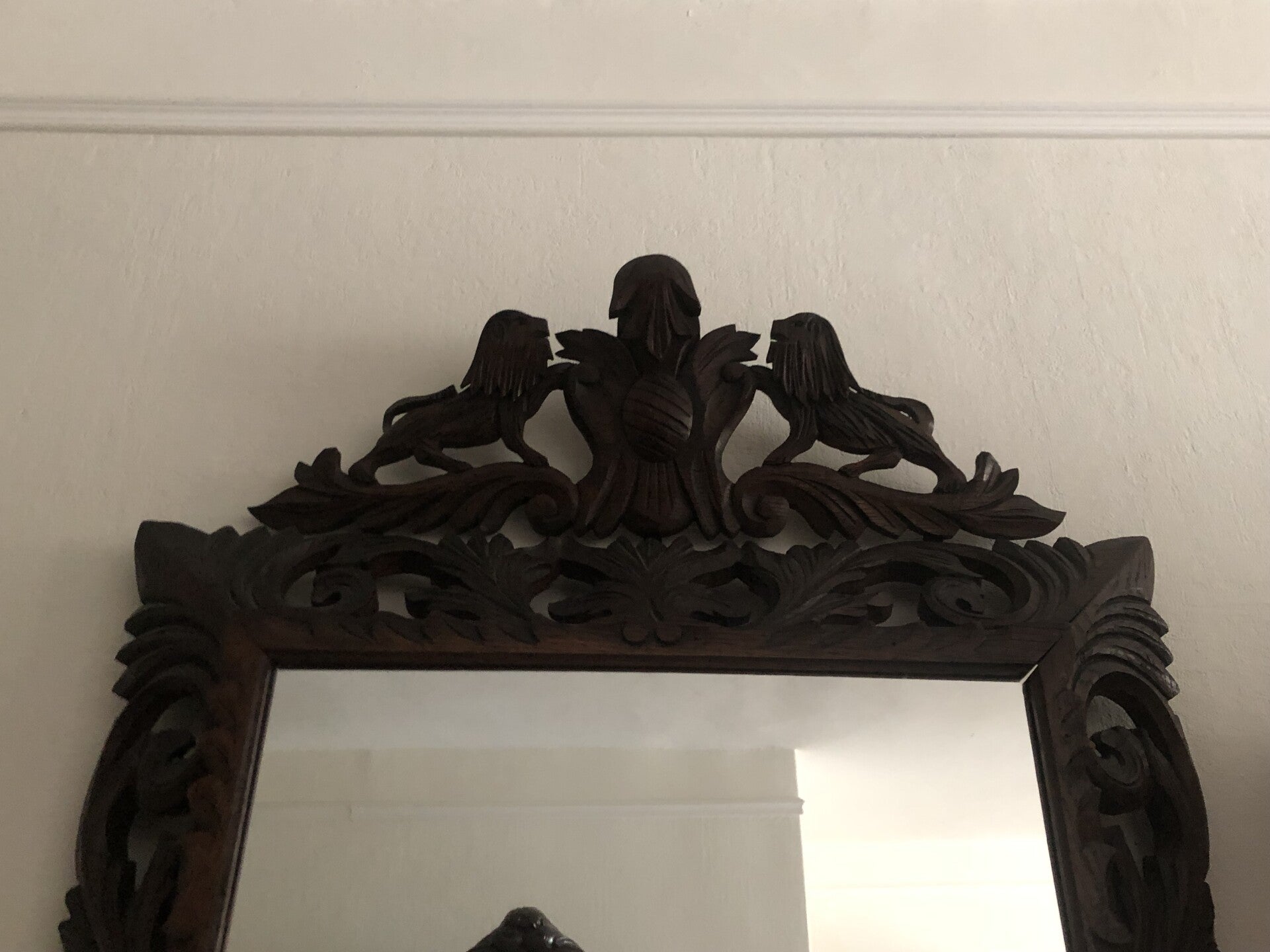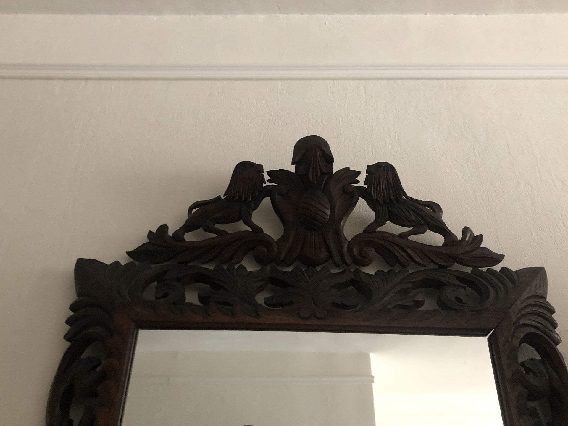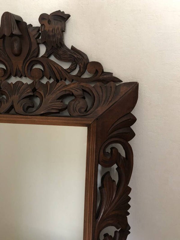 Houten spiegel met houtgesneden leeuwen