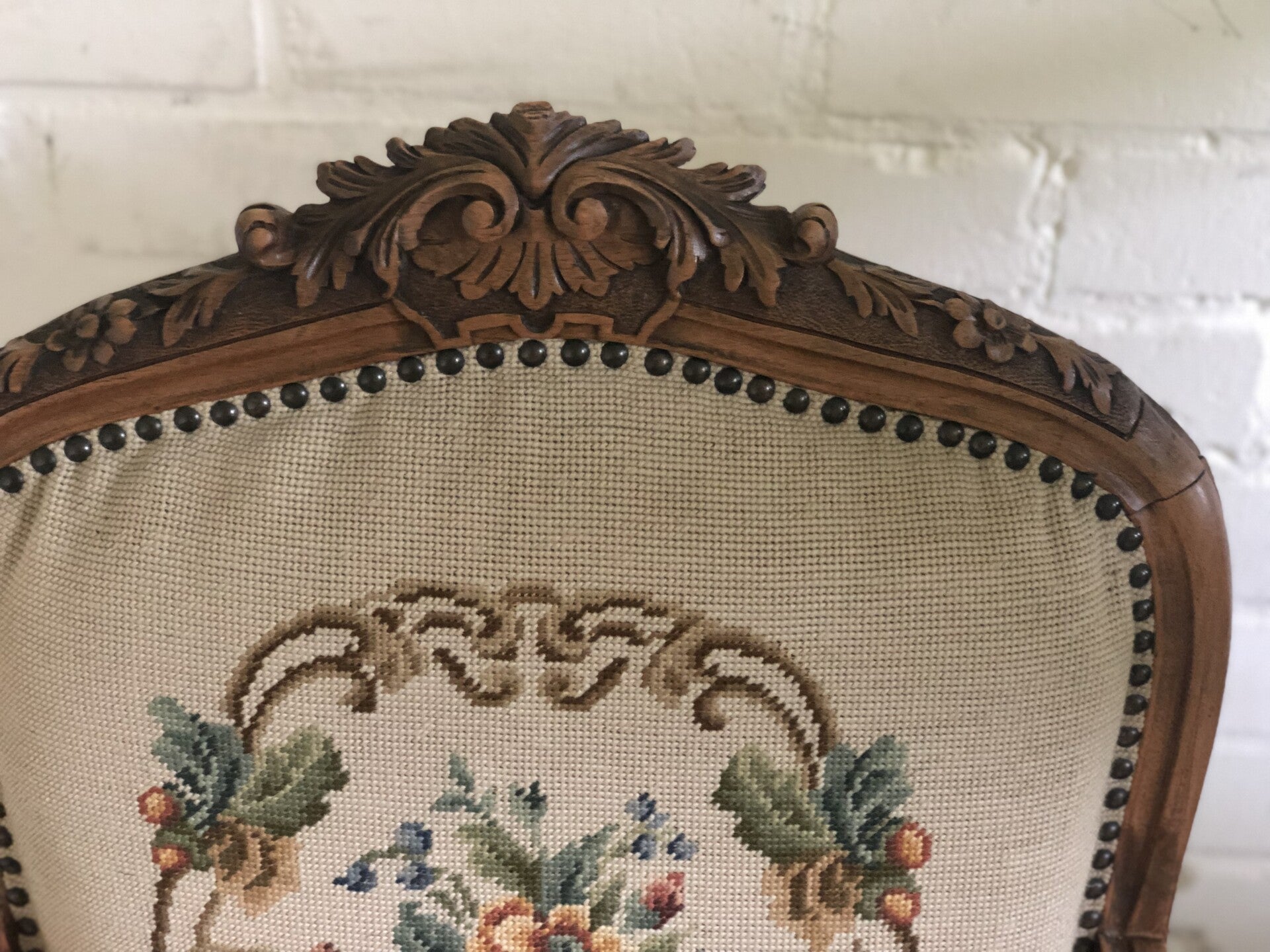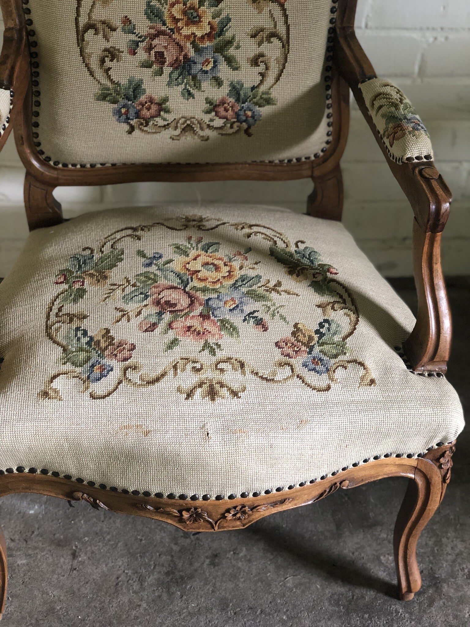 Louis Quinze stijl armleuning stoeltje met geborduurde bekleding.
