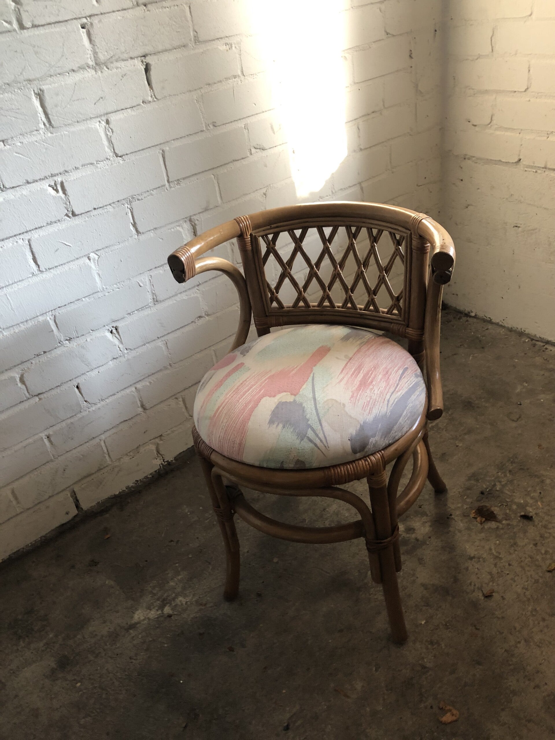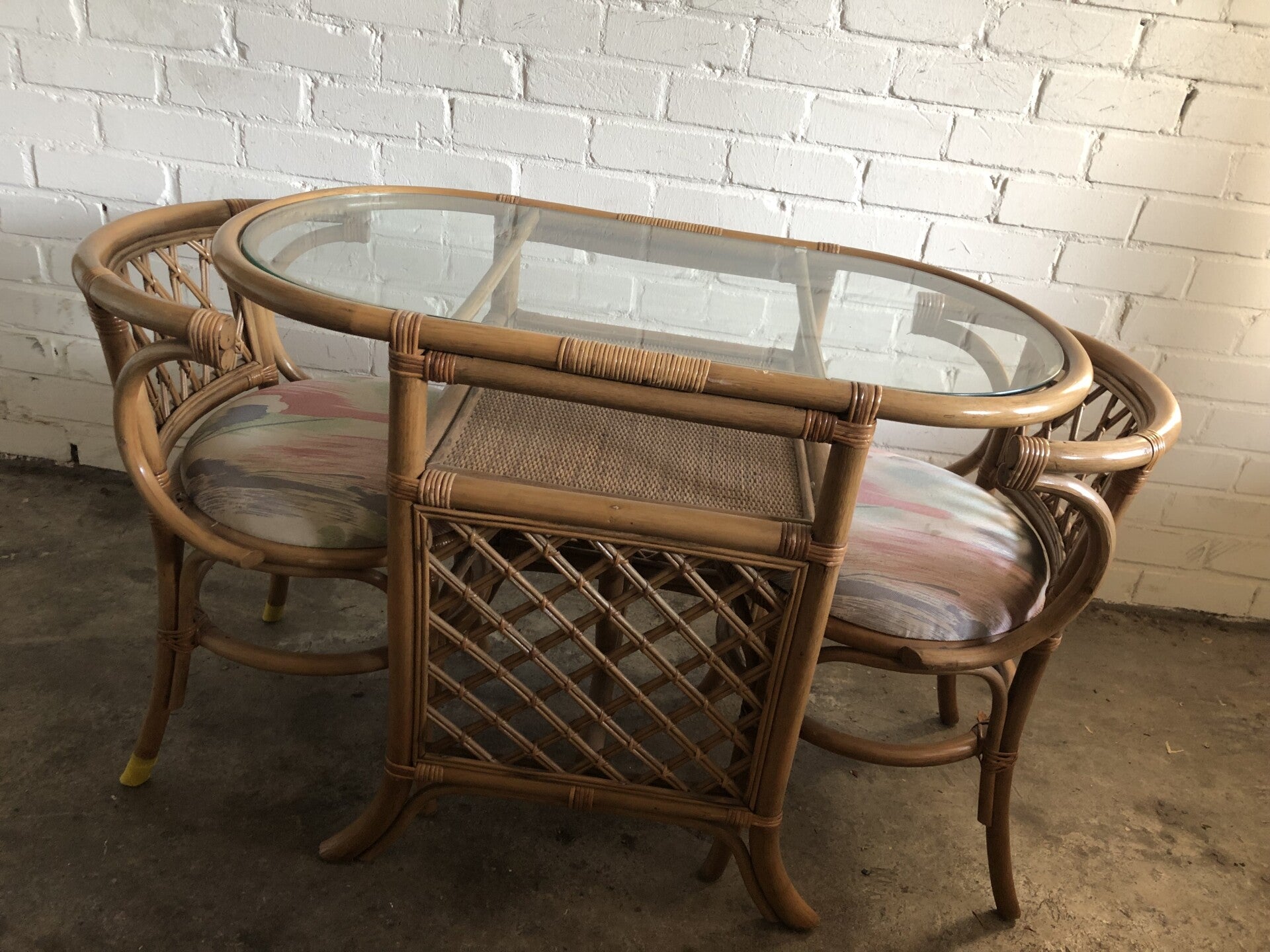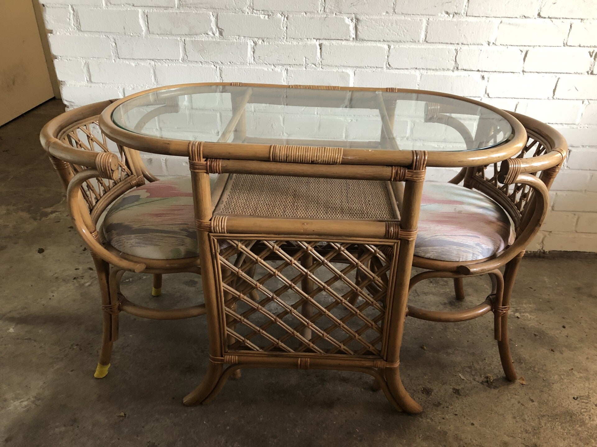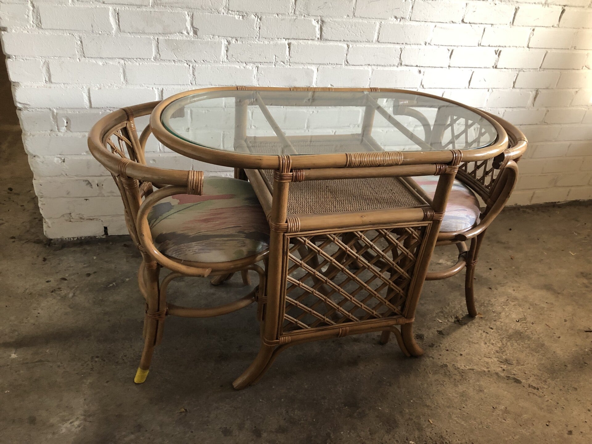 2 rieten tuinstoelen met kussentjes en een rieten tafel met glas.