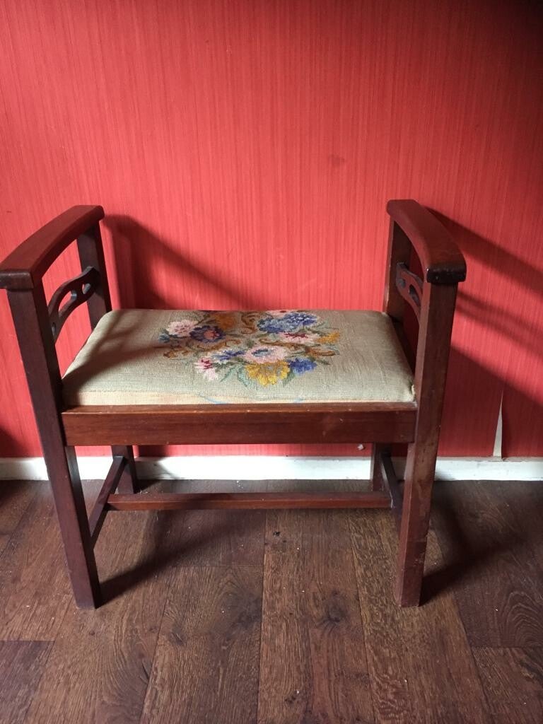 Antieke houten fateuil en bijbehorende voetleuning met geborduurde bekleding.