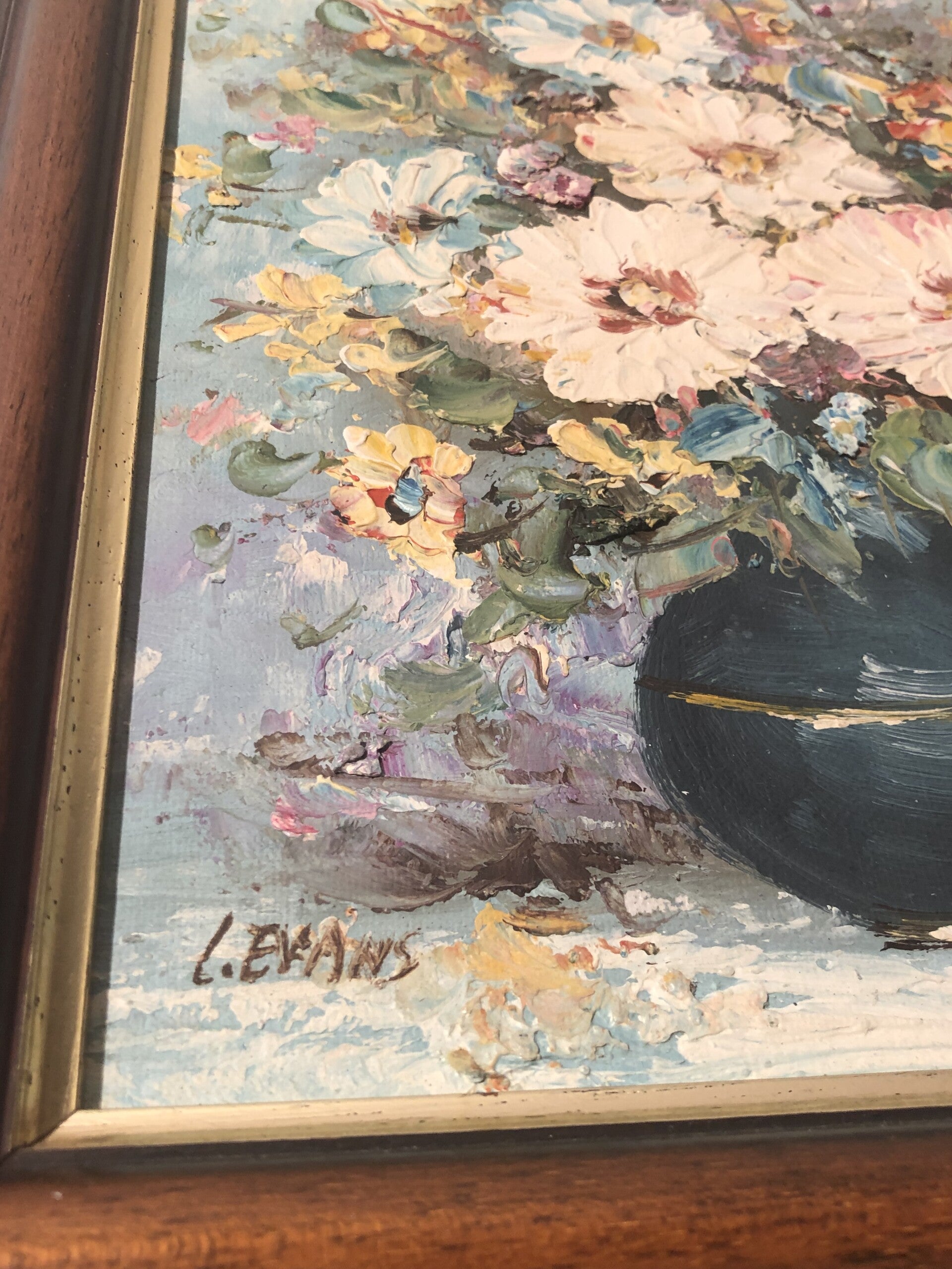 Olieverf schilderij van bloemen in vaas.