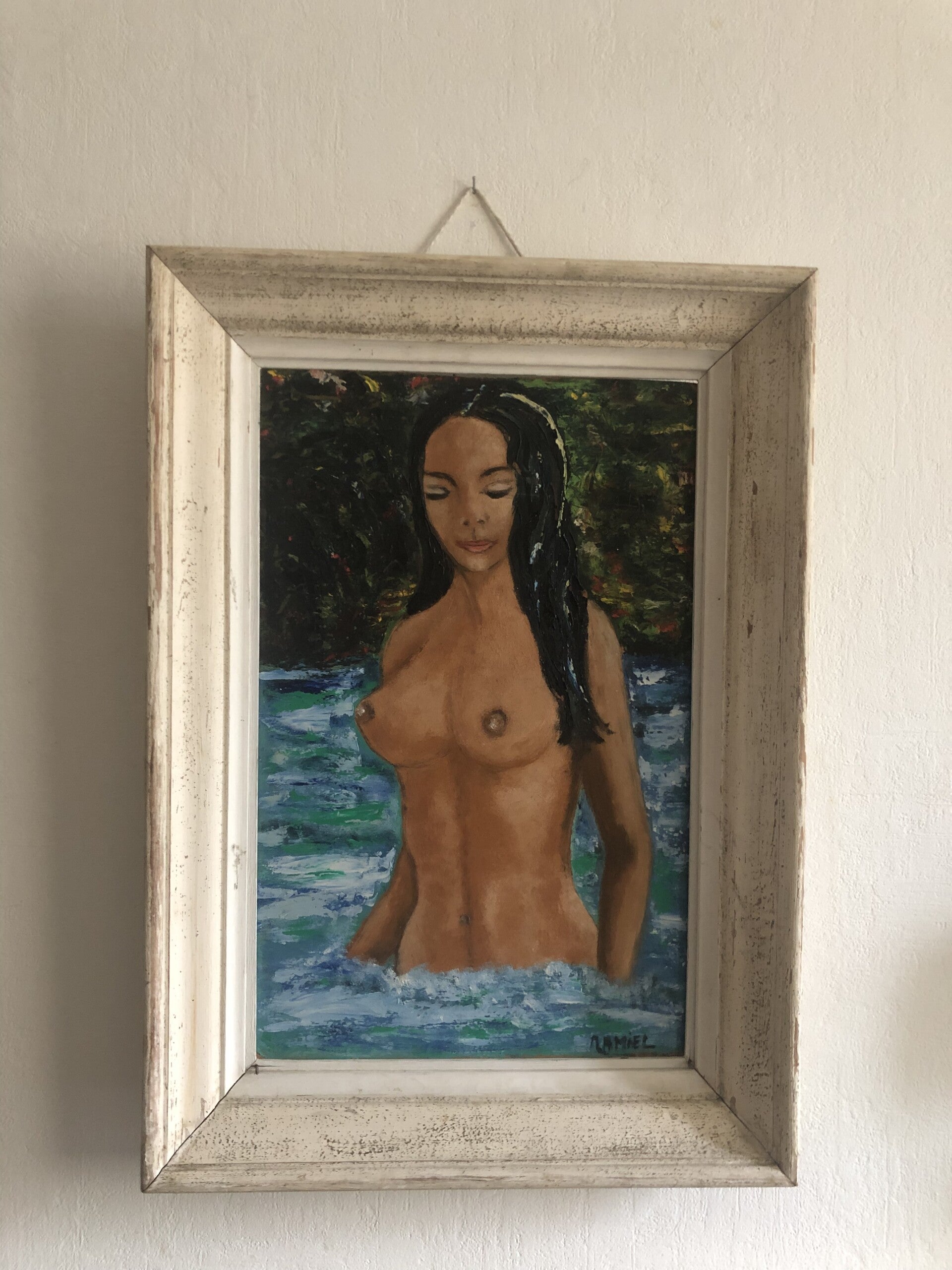 Olieverf schilderij van blote vrouw.