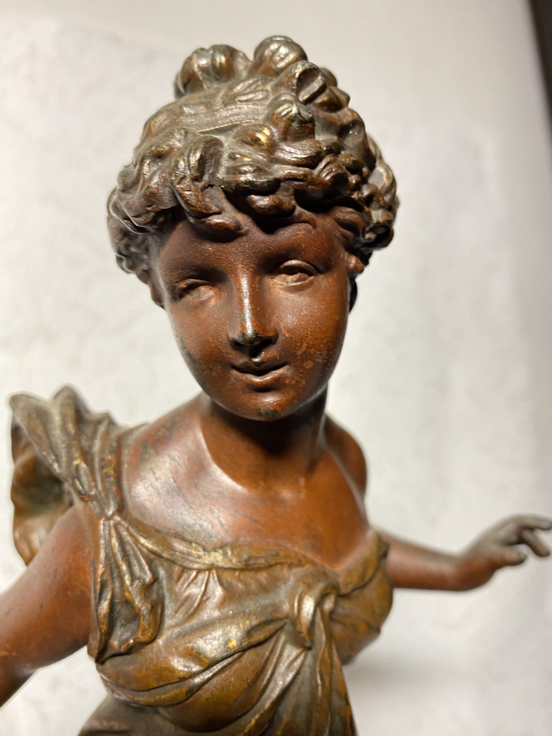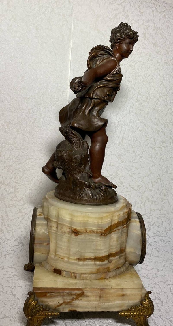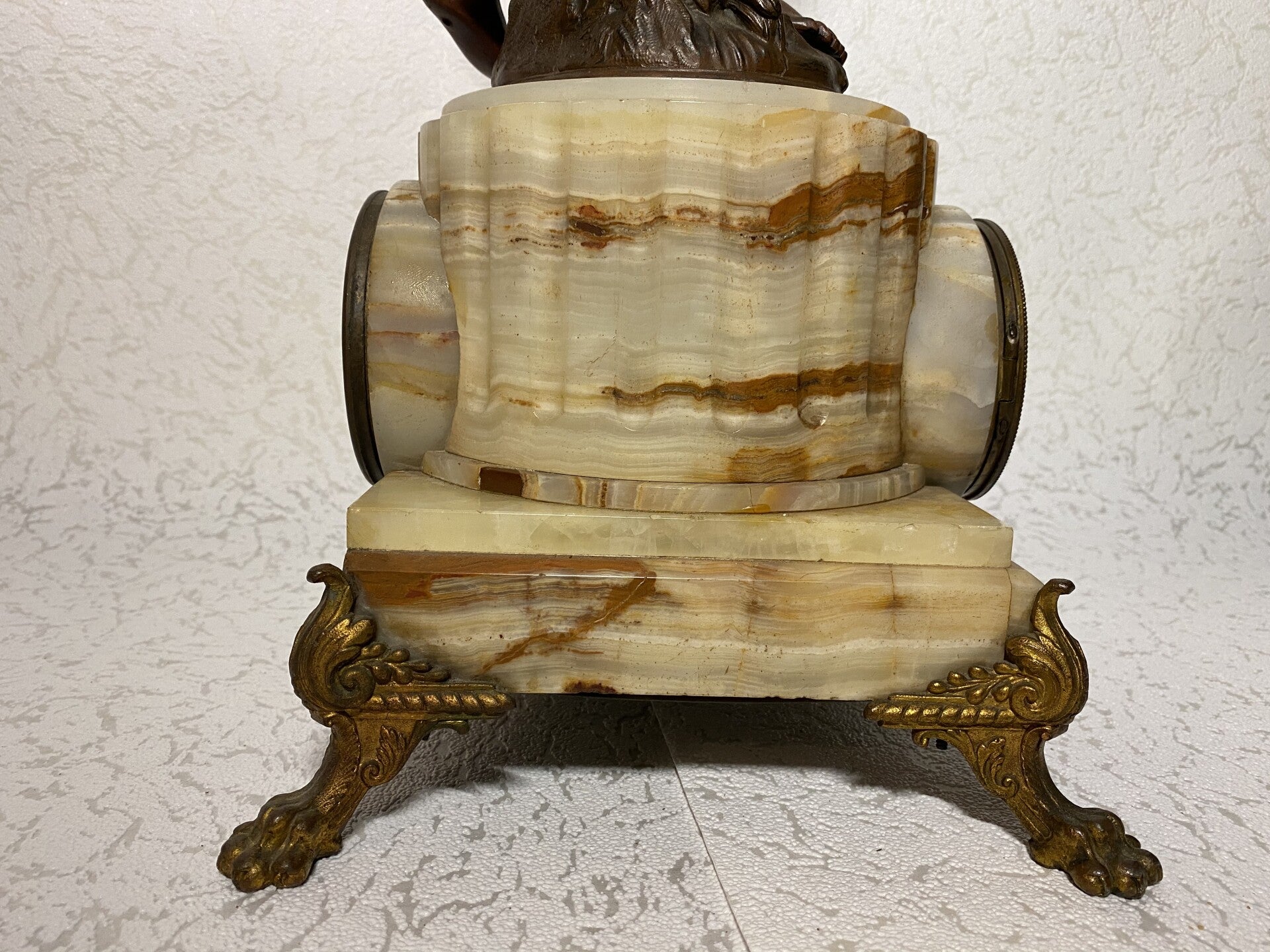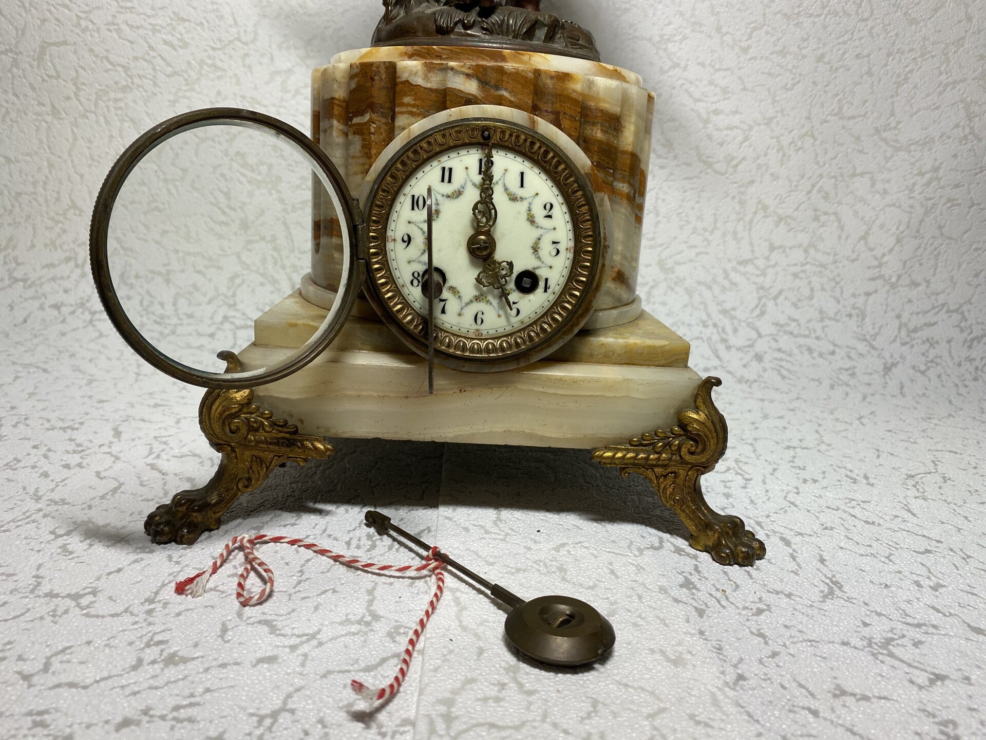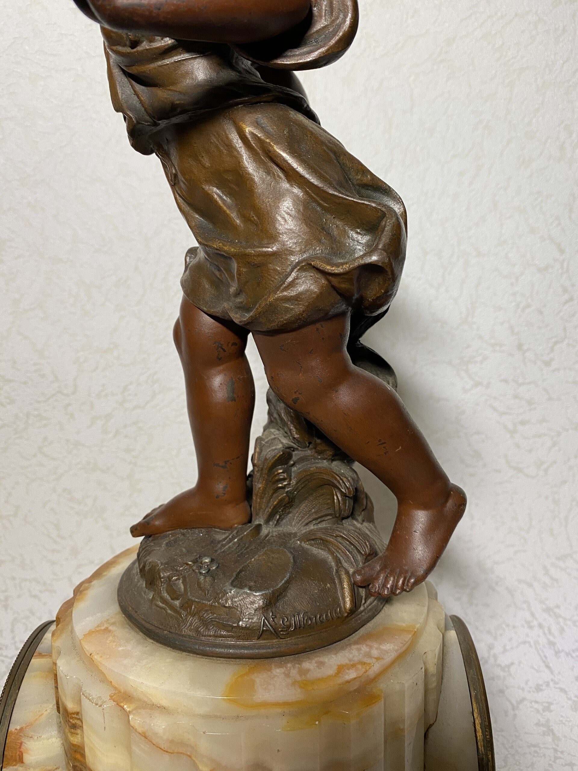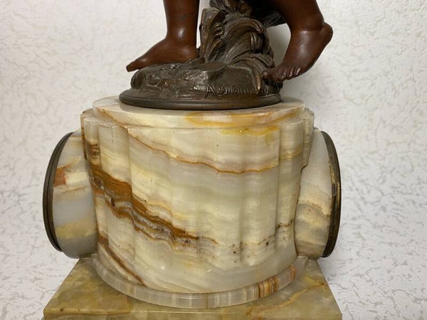 Pendule met staande dame, gemarkeerd: At e Morelli. Op marmeren voet en leeuwen poten.