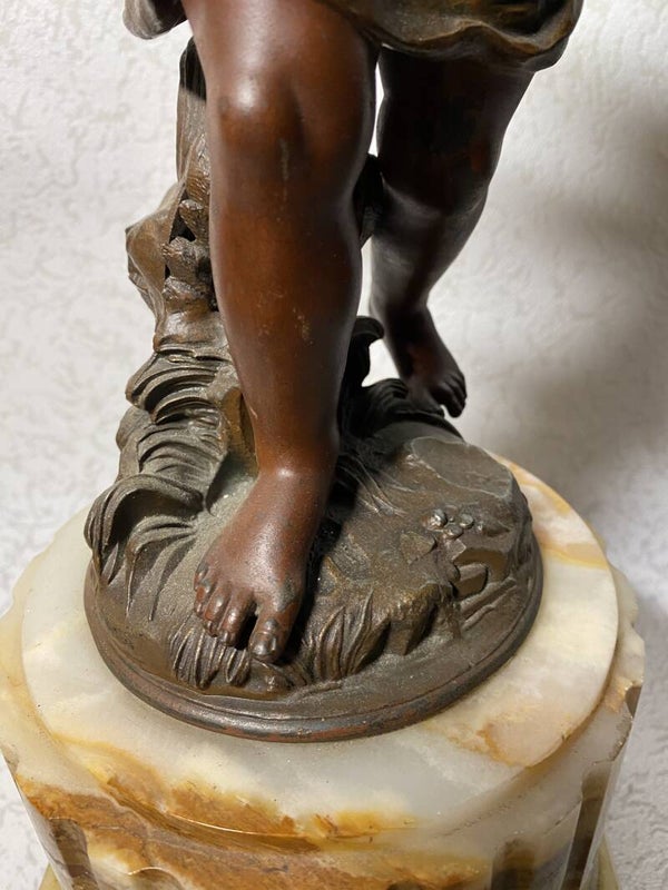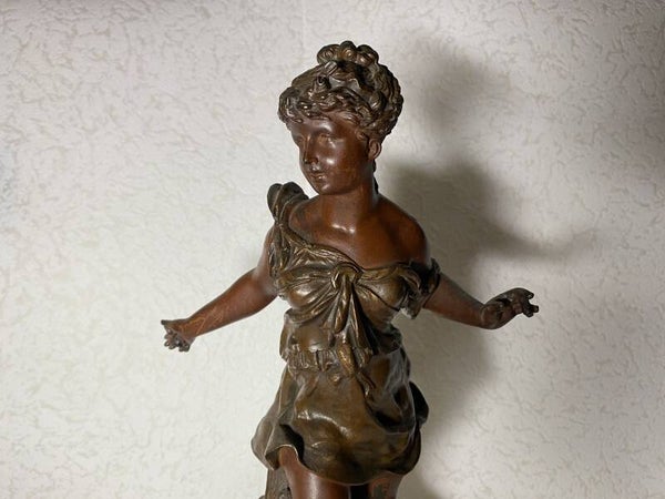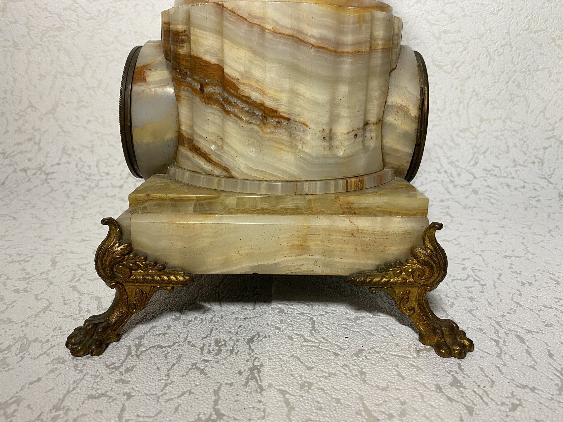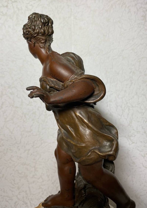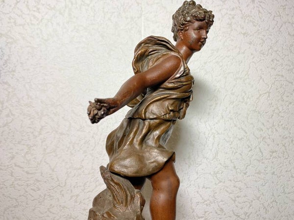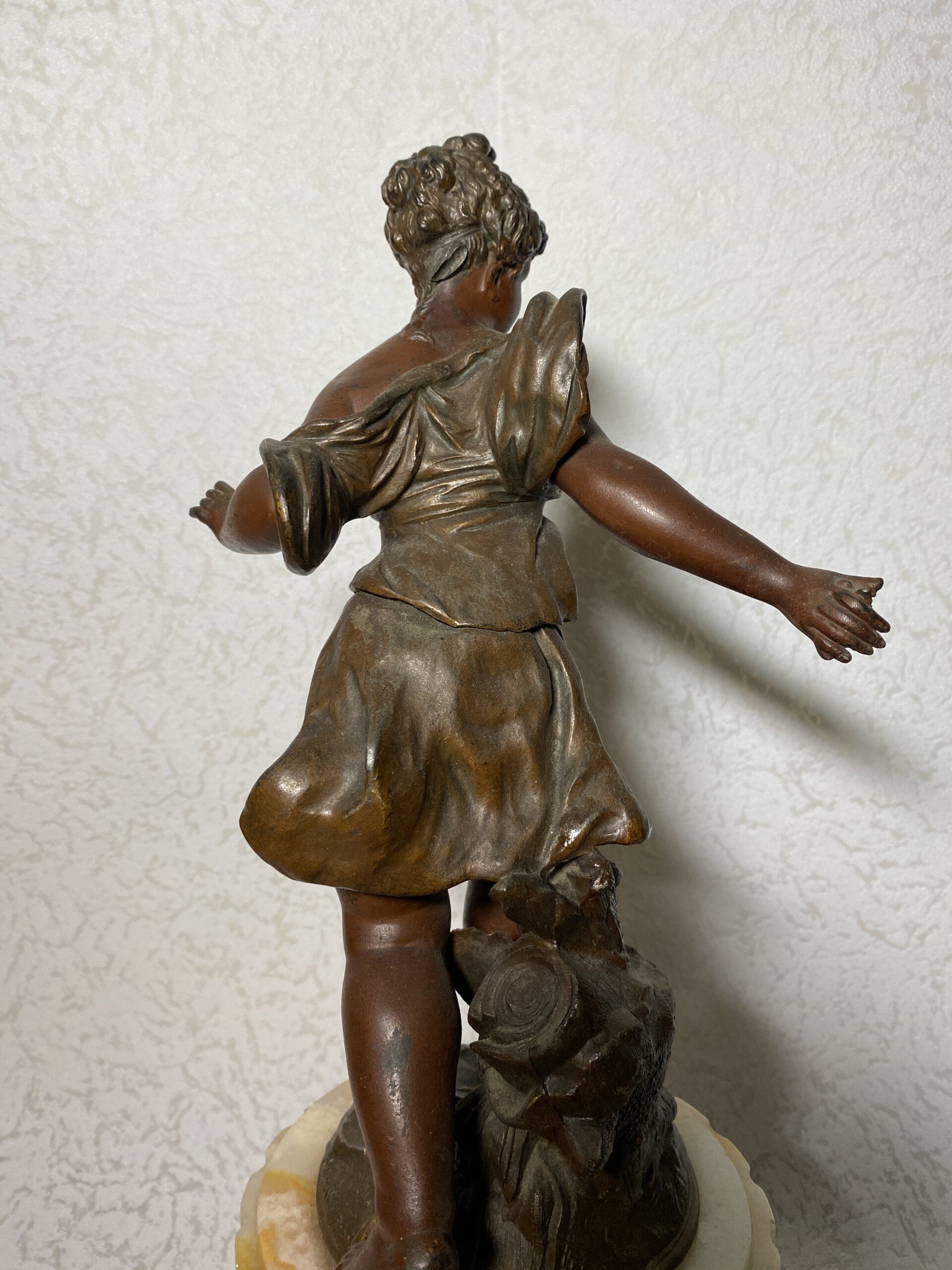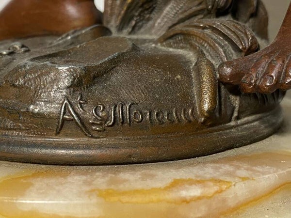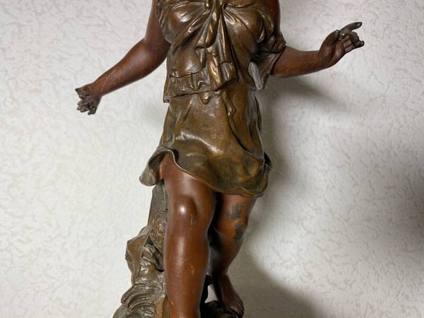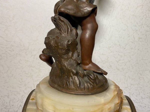 Pendule met staande dame, gemarkeerd: At e Morelli. Op marmeren voet en leeuwen poten.