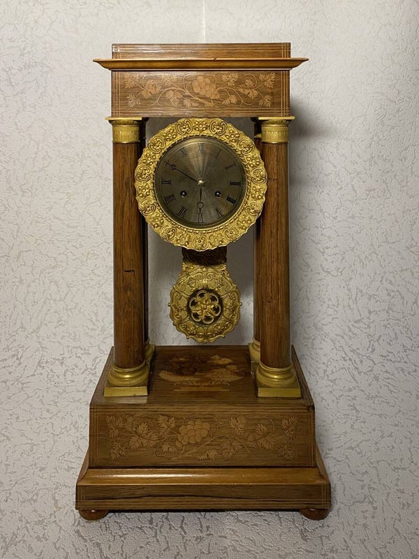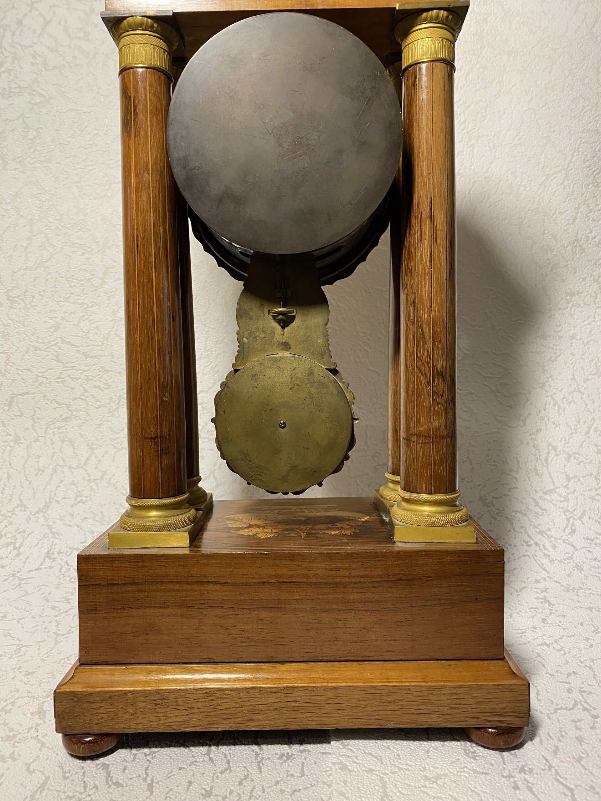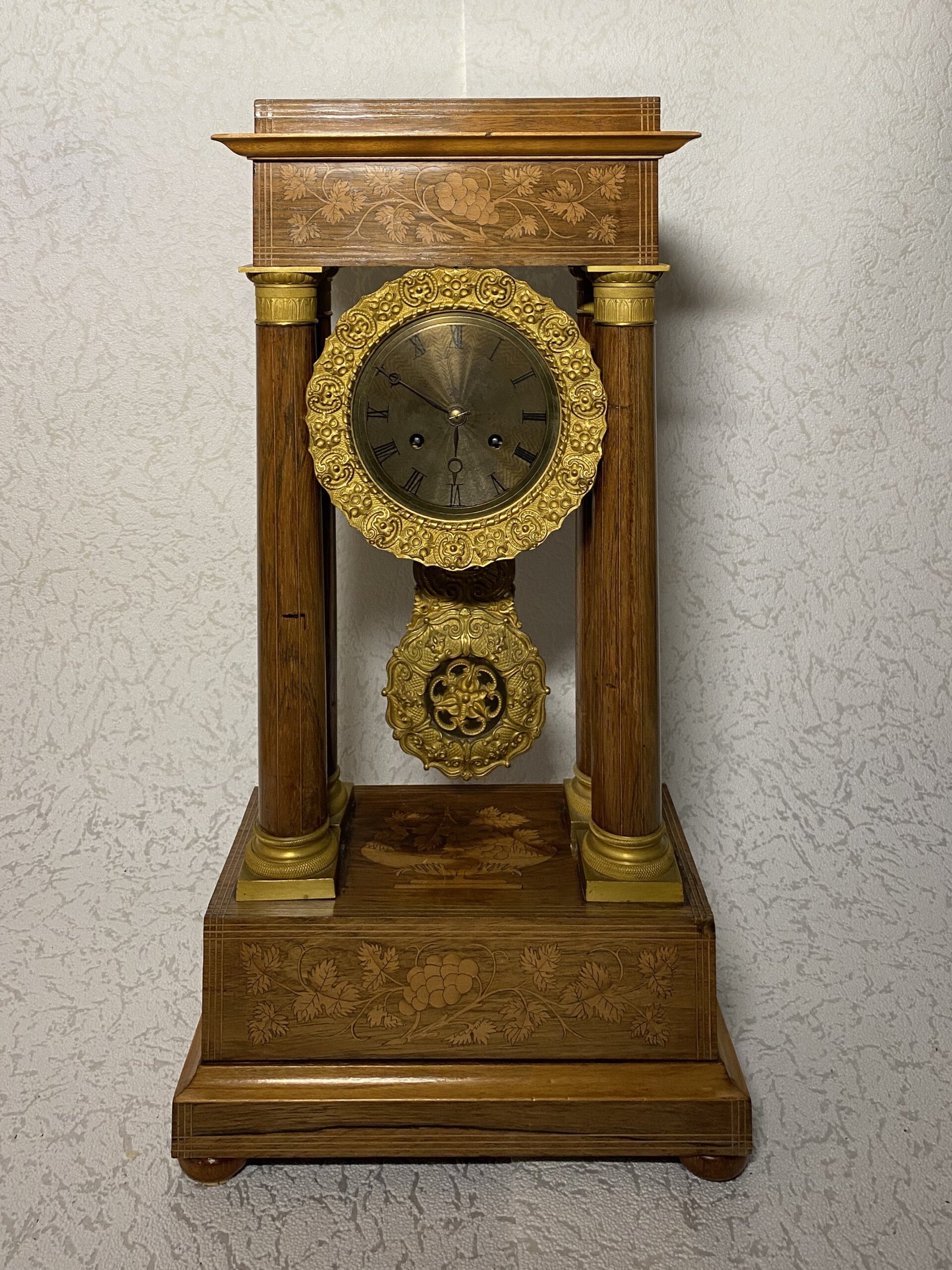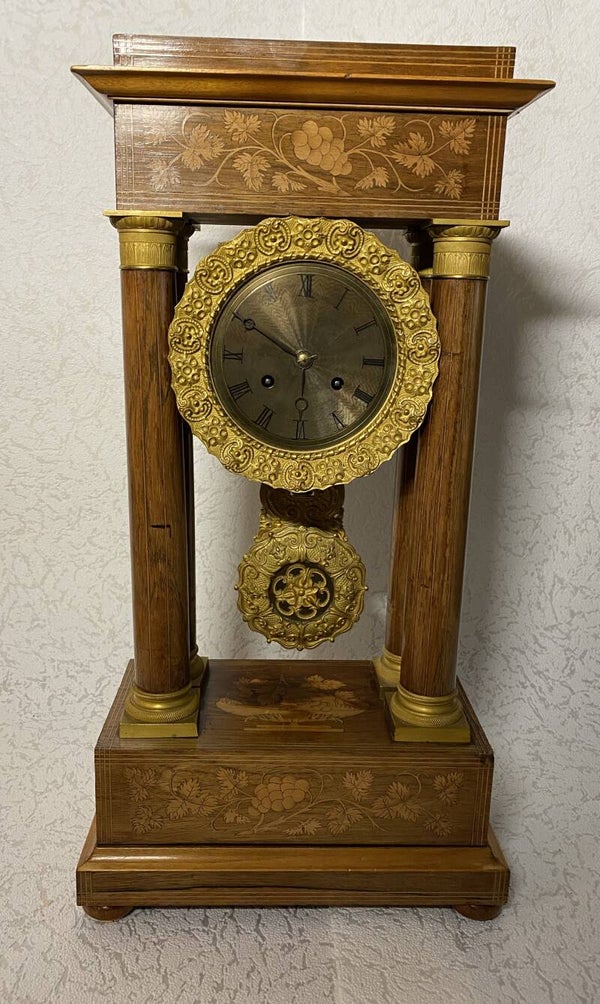 Franse kolompendule in notenhouten kast met inlegwerk en verguld.