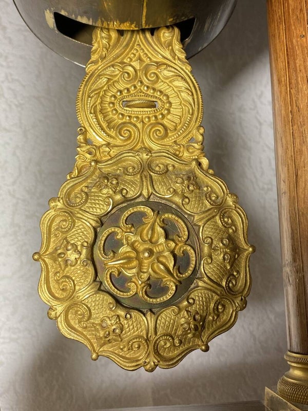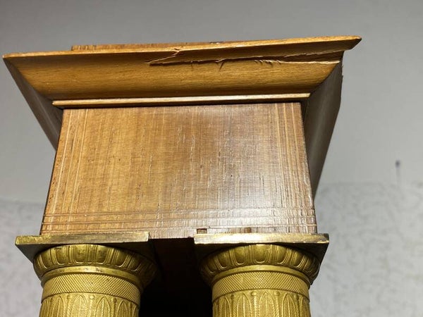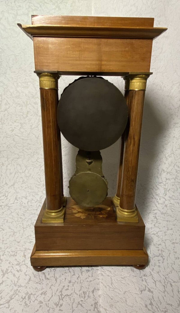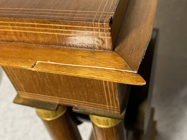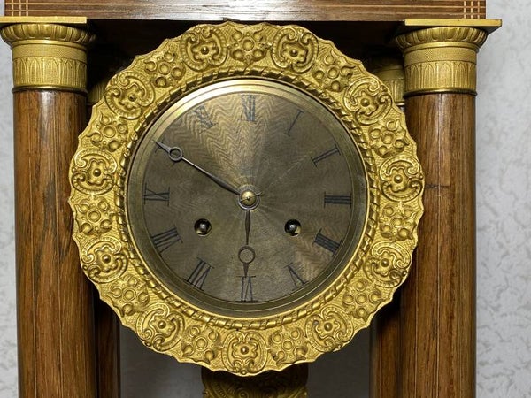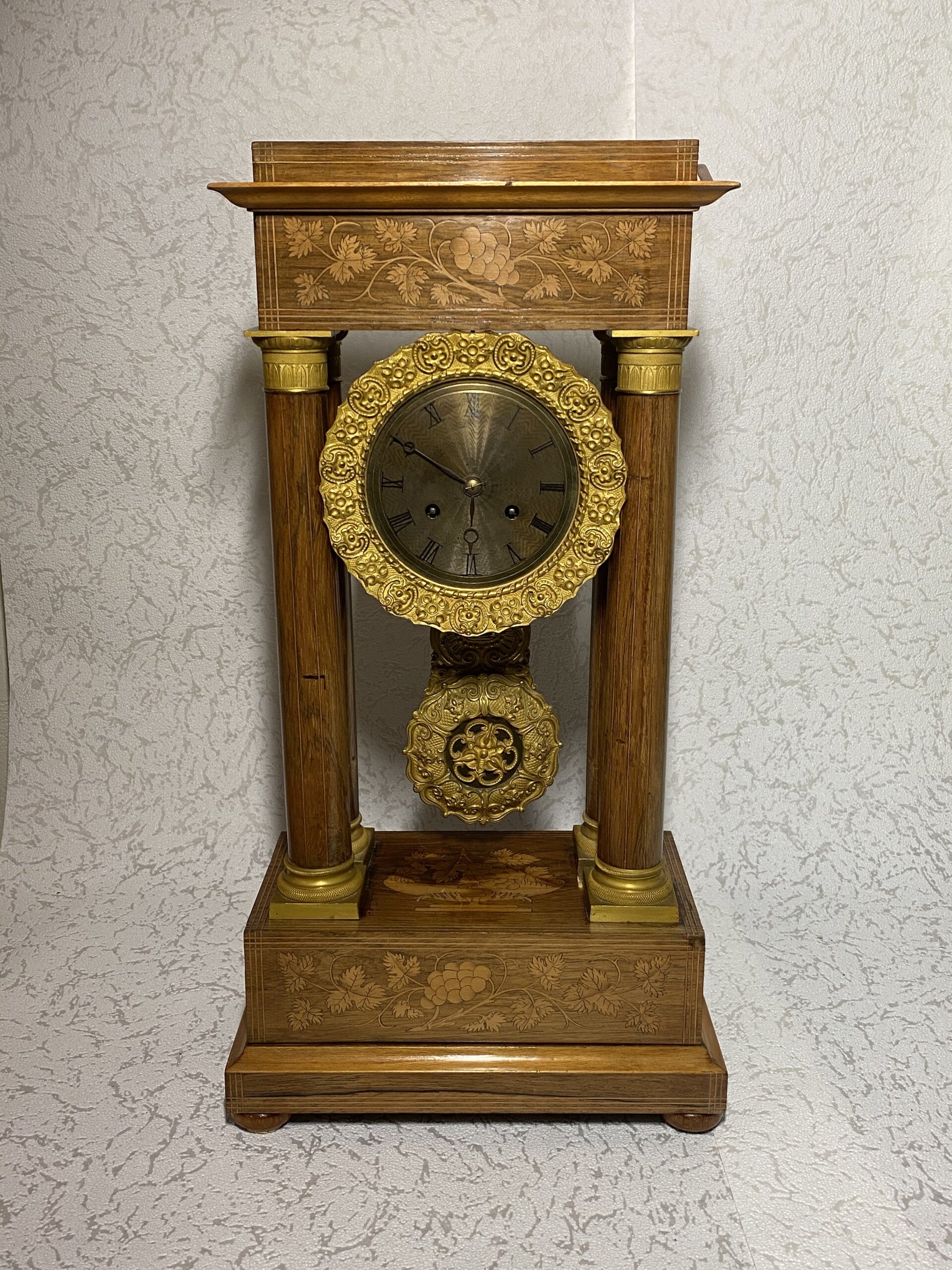 Franse kolompendule in notenhouten kast met inlegwerk en verguld.