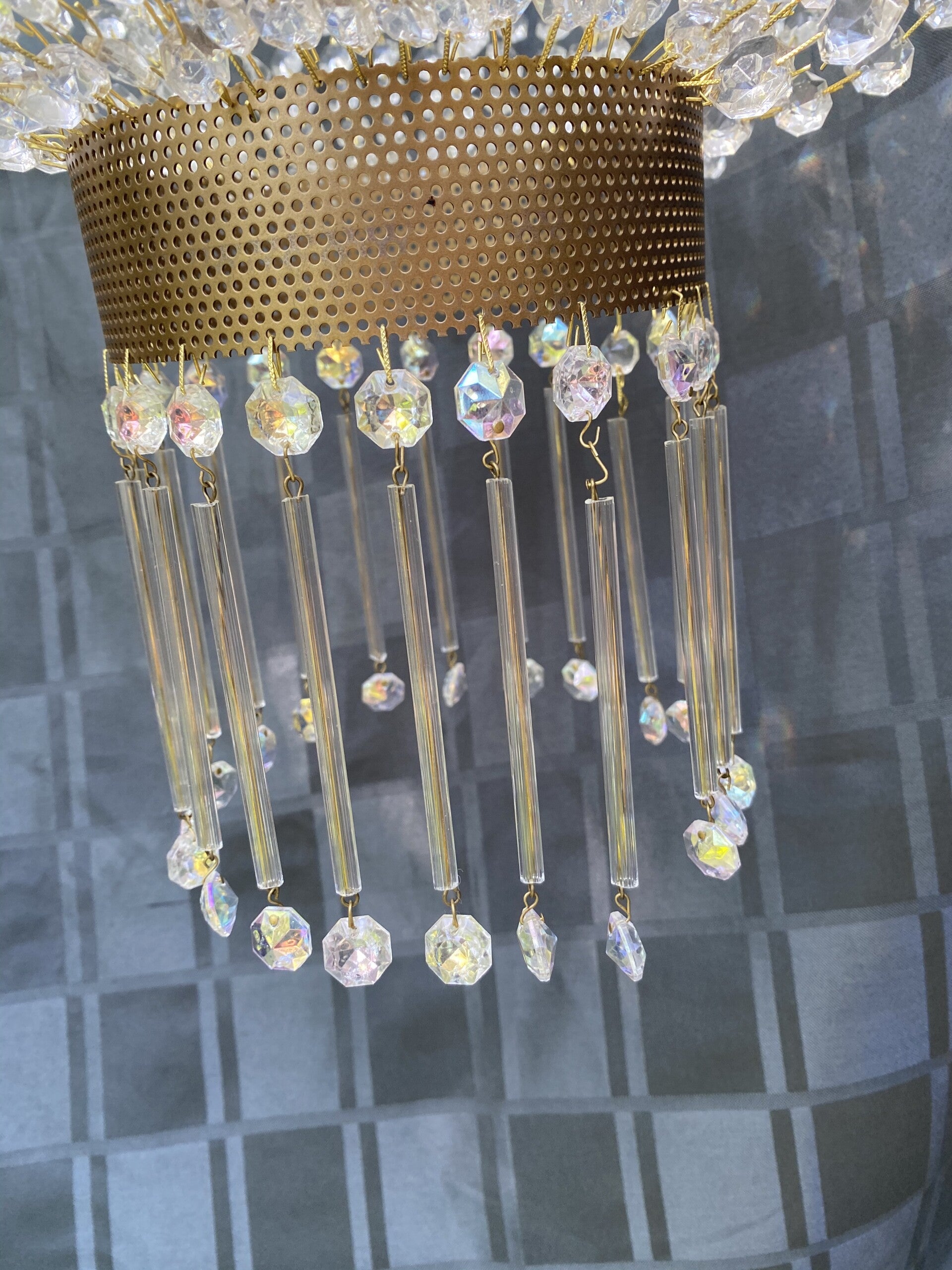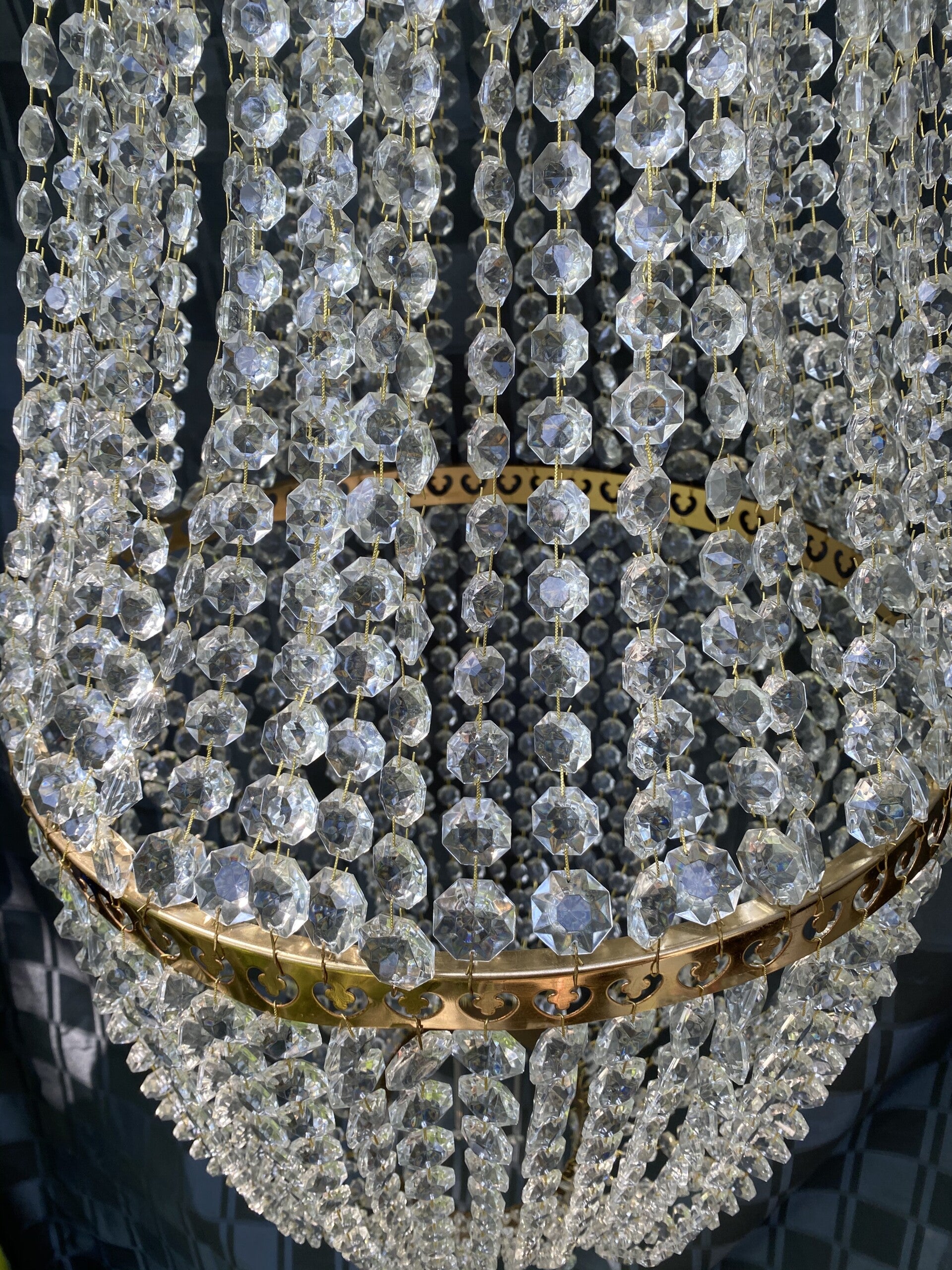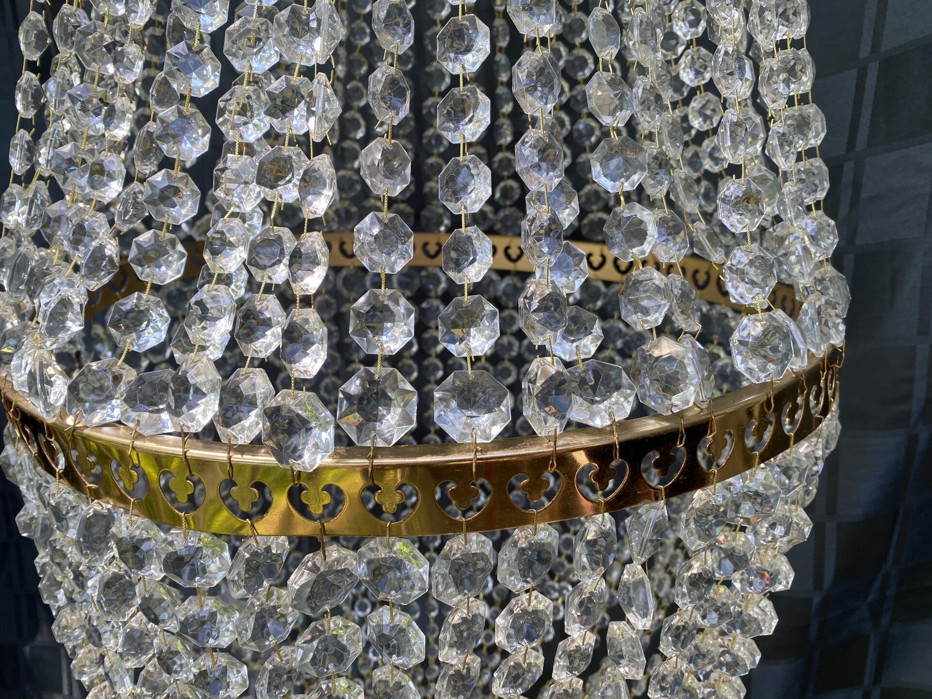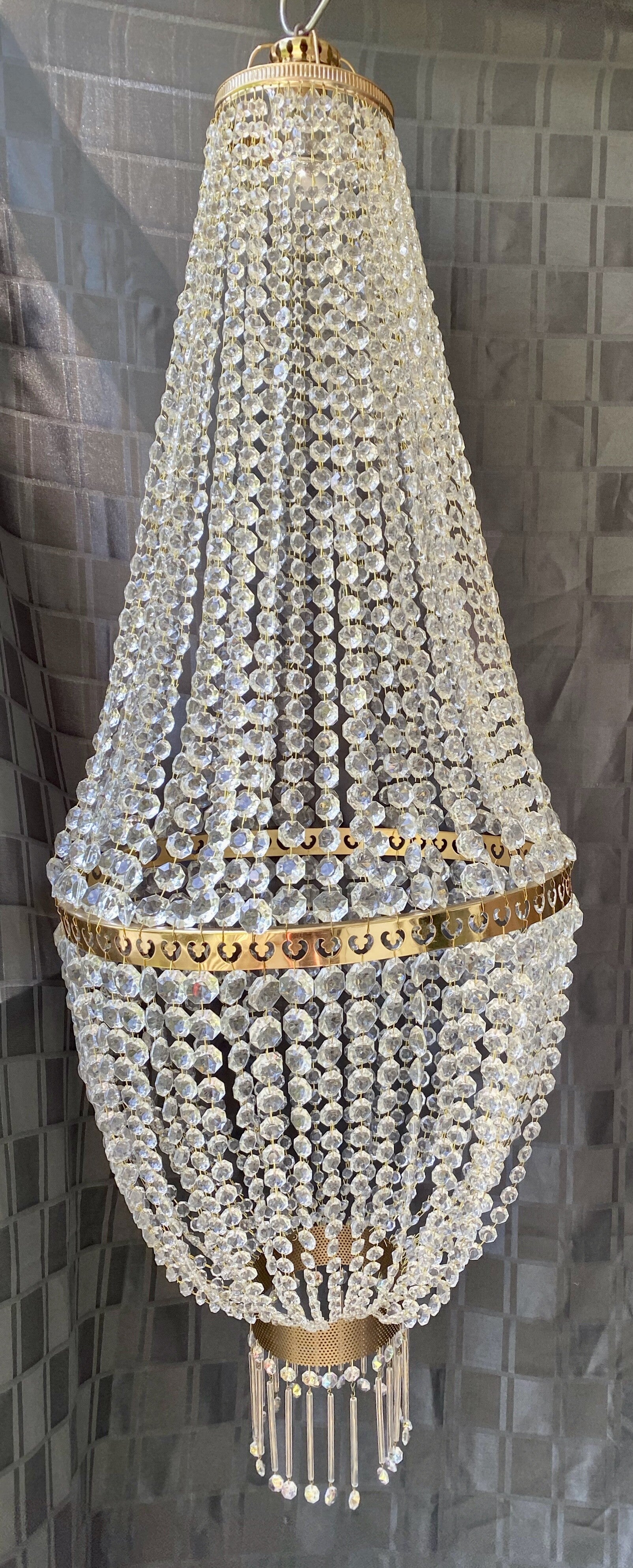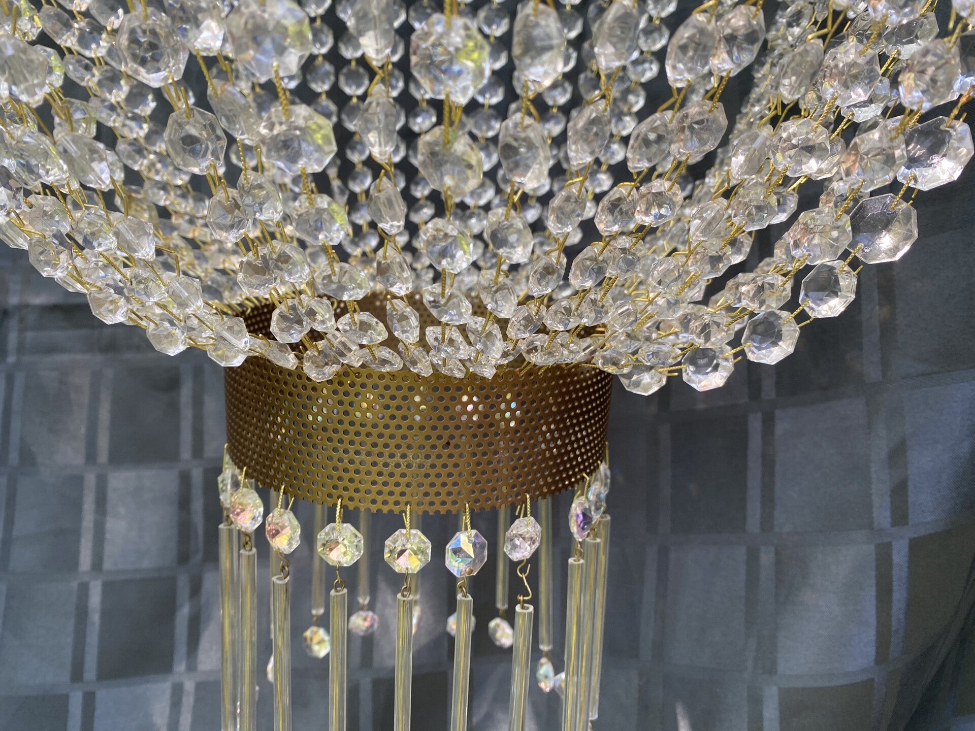 Kroonluchter zakkroon. Materialen: Kristal en metaal. Afmetingen: totale hoogt: 130cm, doorsnede: 45cm.