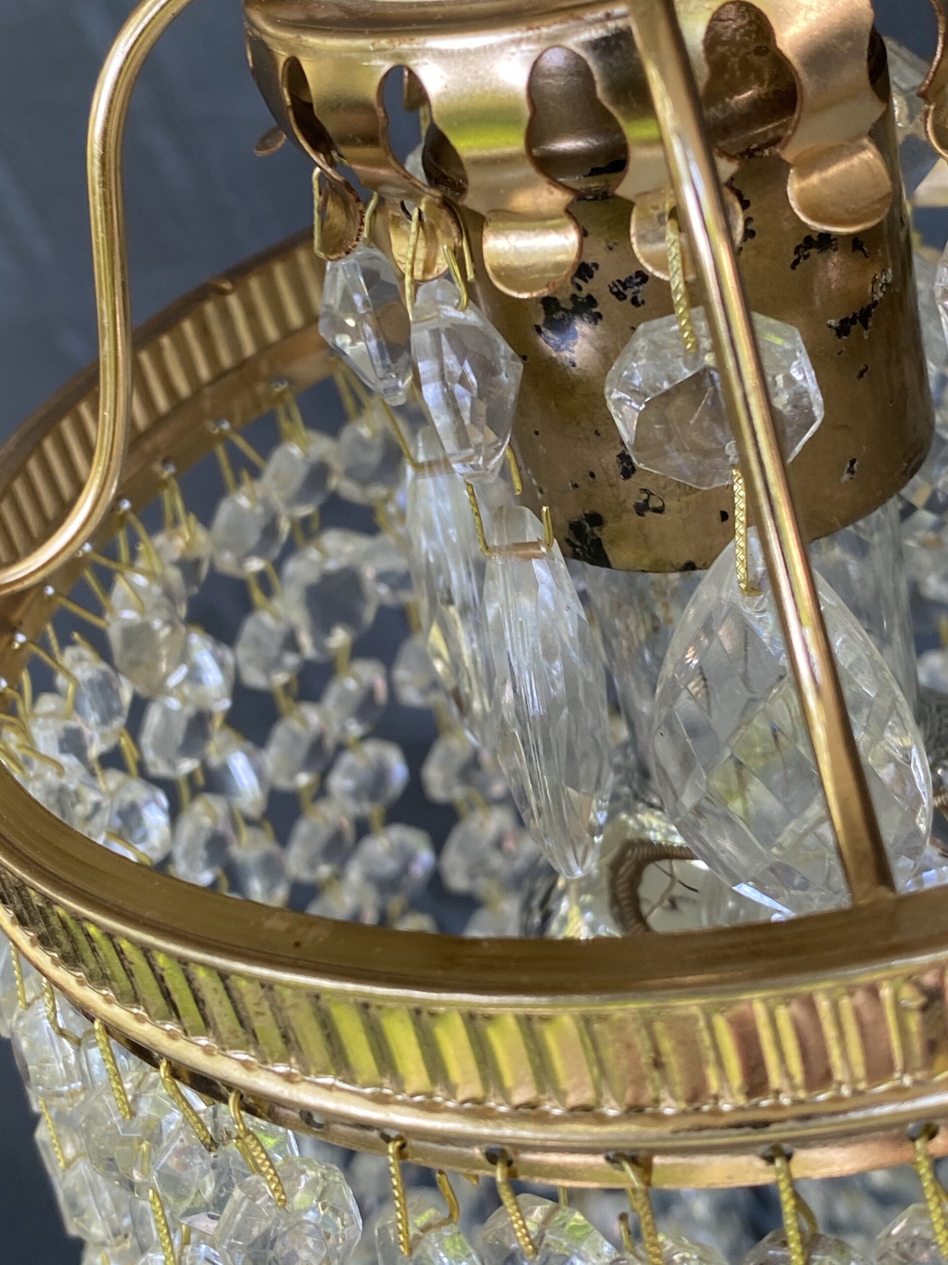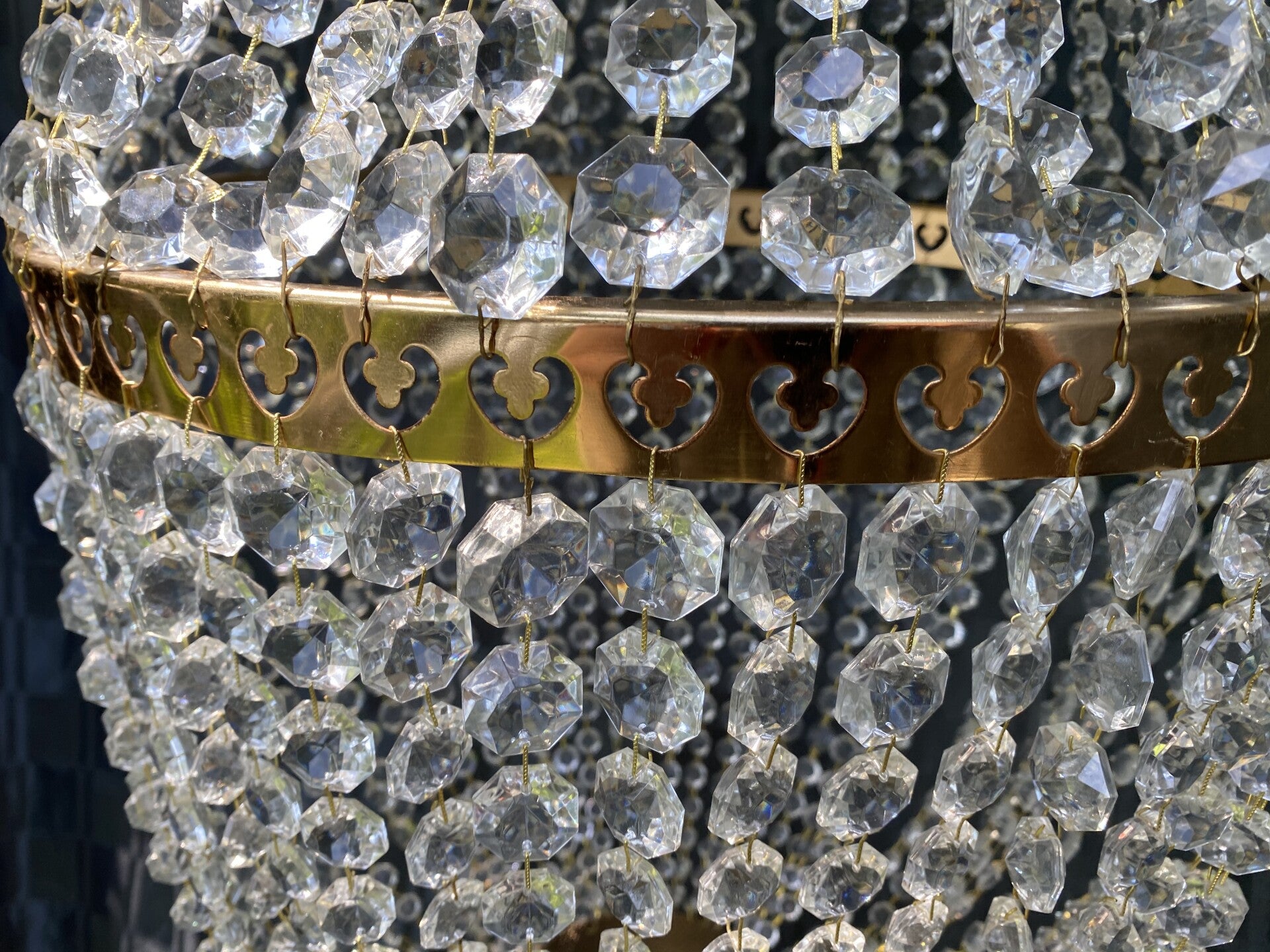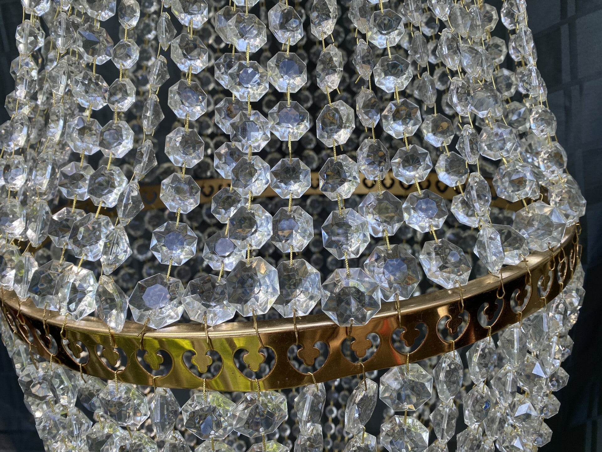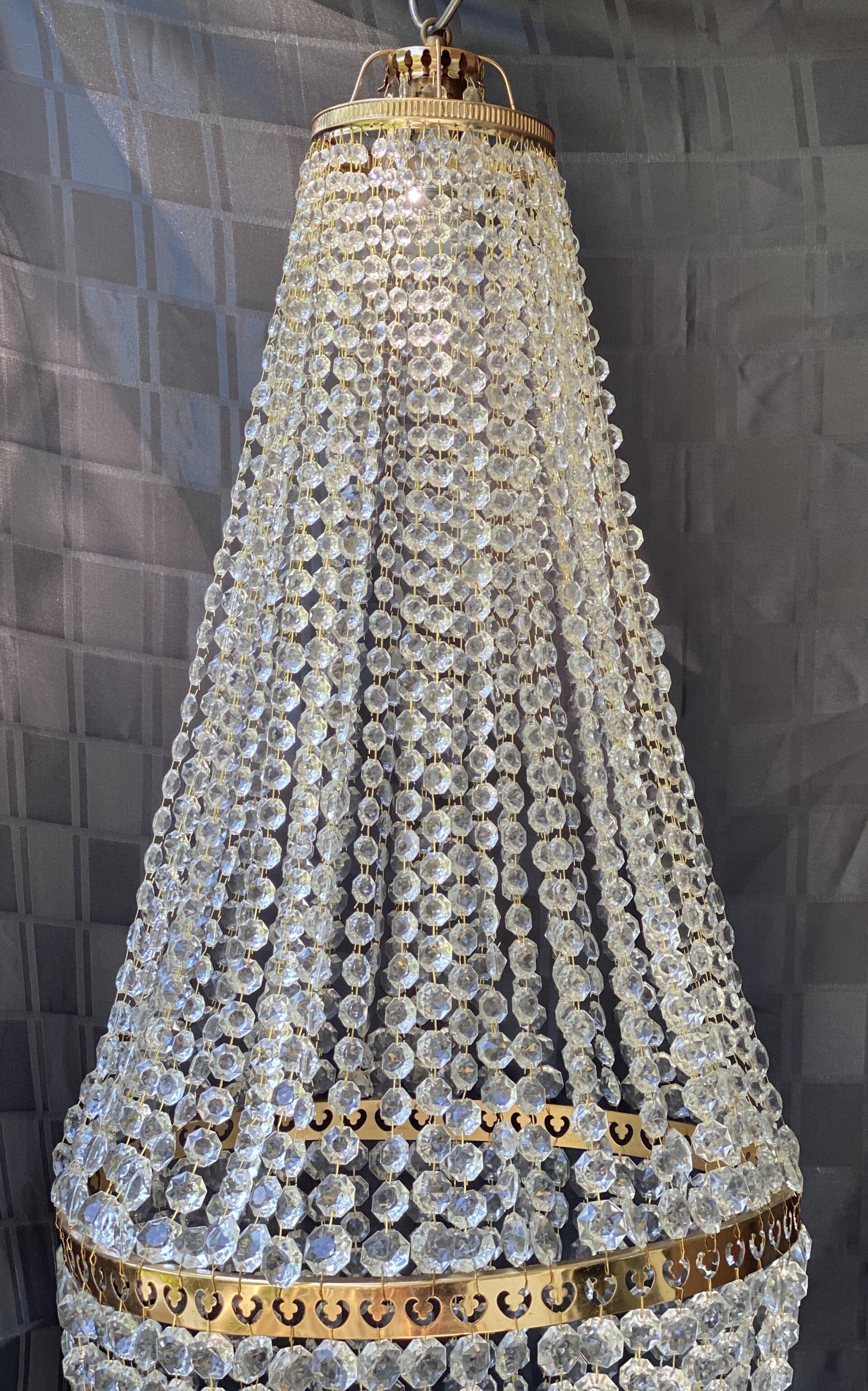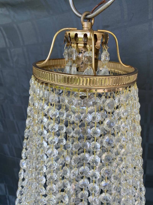 Kroonluchter zakkroon. Materialen: Kristal en metaal. Afmetingen: totale hoogt: 130cm, doorsnede: 45cm.