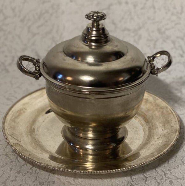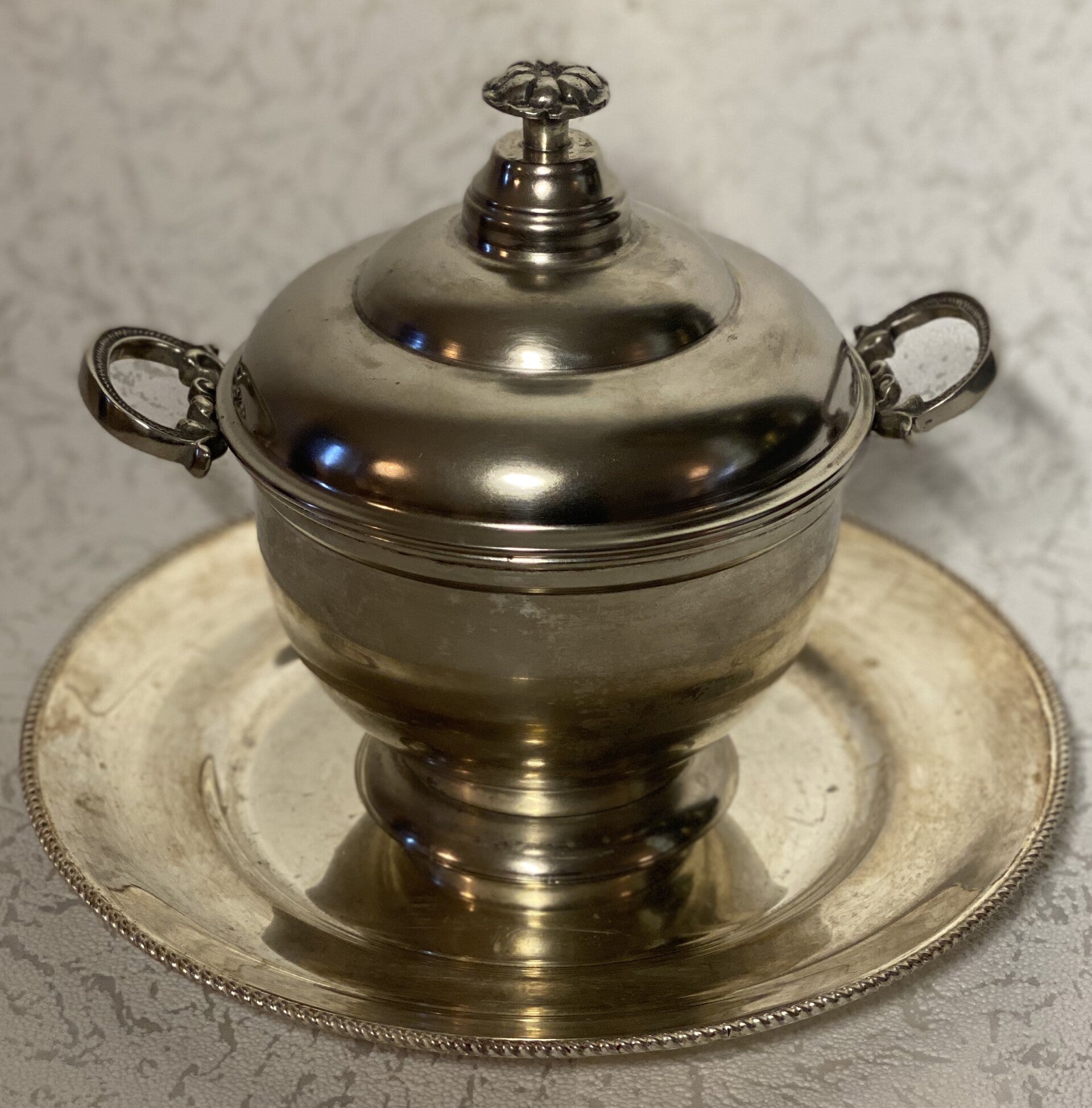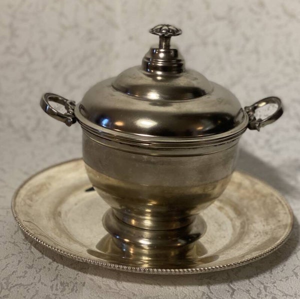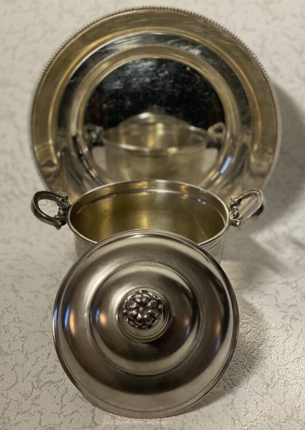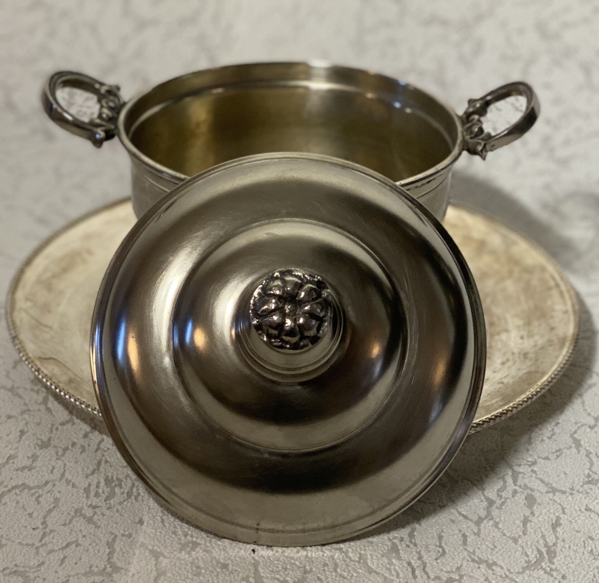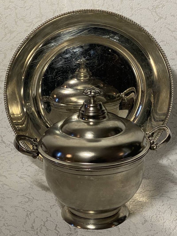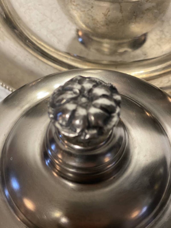 Verzilverd gedecoreerde serveershotel met deksel op verzilverde dienblad.