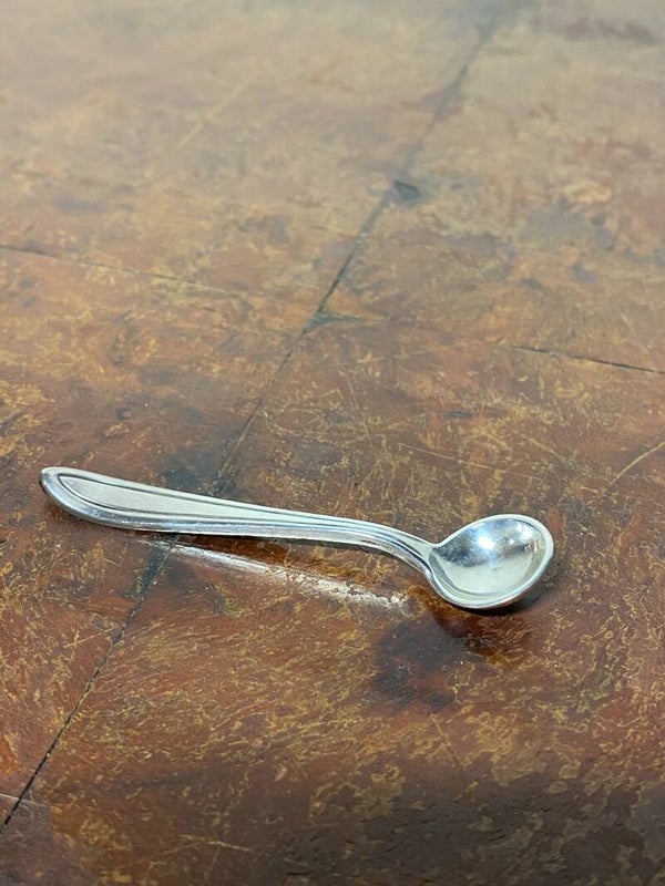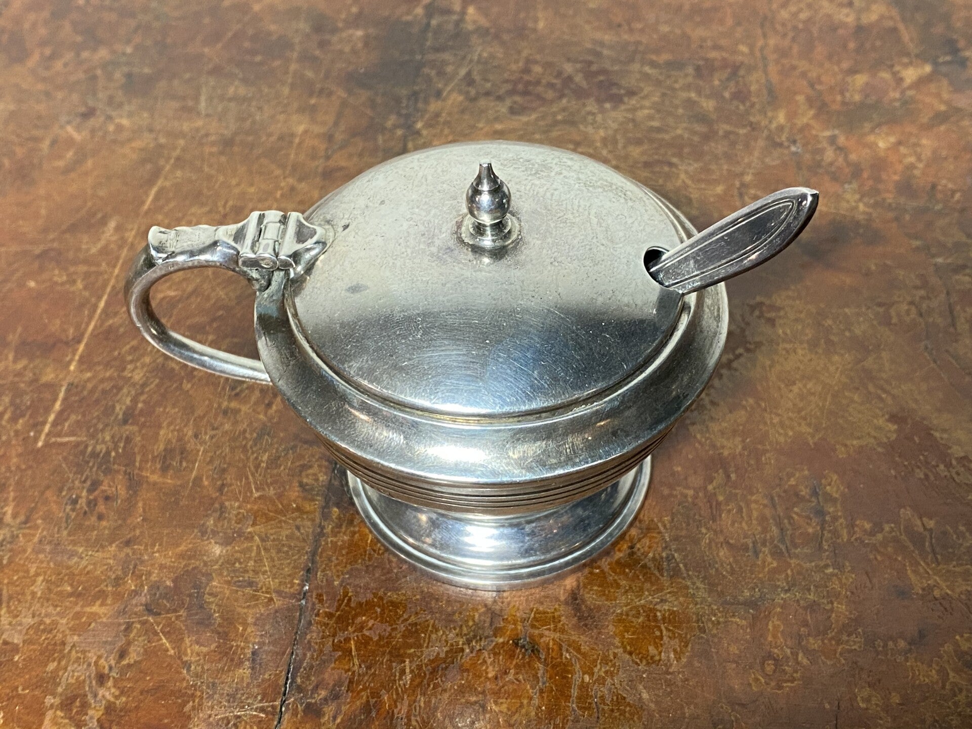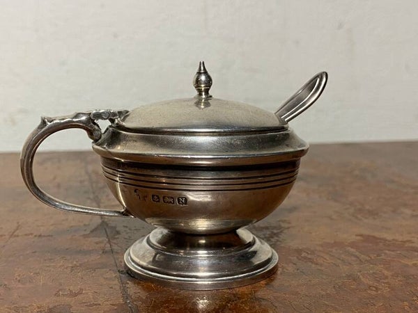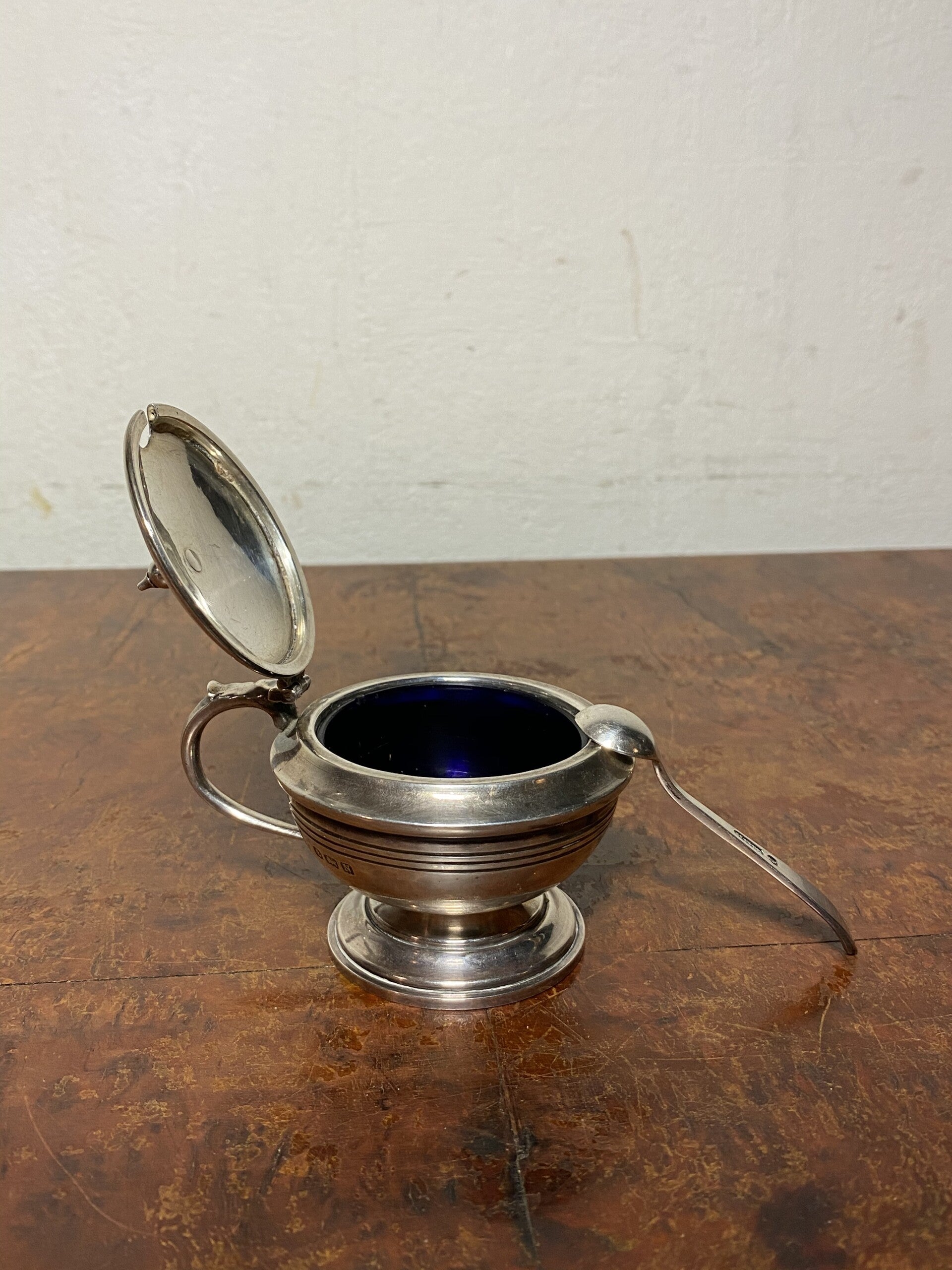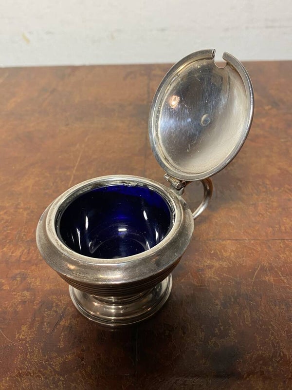 -Zilveren mosterdpot met kobaltblauw glas erin, keurmerken: zilversmeden keurmerk dat onleesbaar is, anker: Birmingham Engeland, de passieve leeuw: sterling zilver en de letter N staat voor 1785. En zilveren Keltum lepel Afmetingen: 7,5 cm x 7 cm en 7 cm.