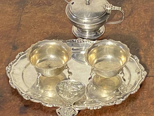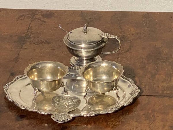 Zilveren dienblad met zout en pepervaten en mosterd pot met individuele verzilverde lepel