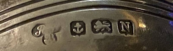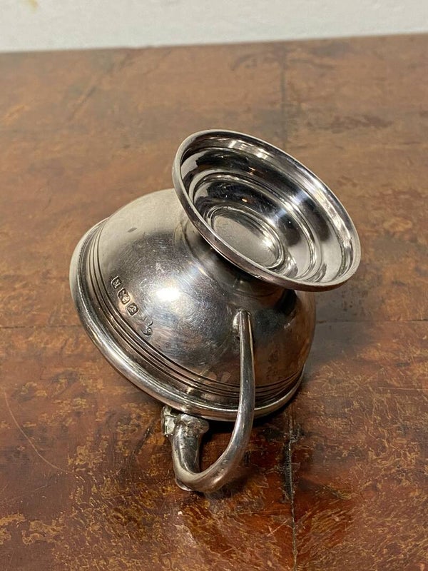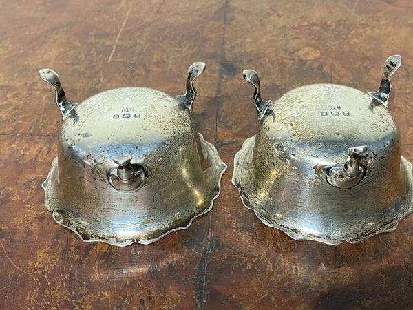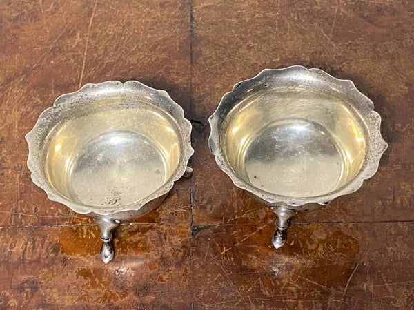 -Twee zilveren zoutvaten staan op drie elegant gedecoreerde voeten, met een keurmerk zilversmid G.U. = George Unite, anker = Birmingham Engeland, passant leeuw = sterling zilver en de letter g die staat voor ca. 1804. Afmetingen: 3,5 cm x 6,5 cm.