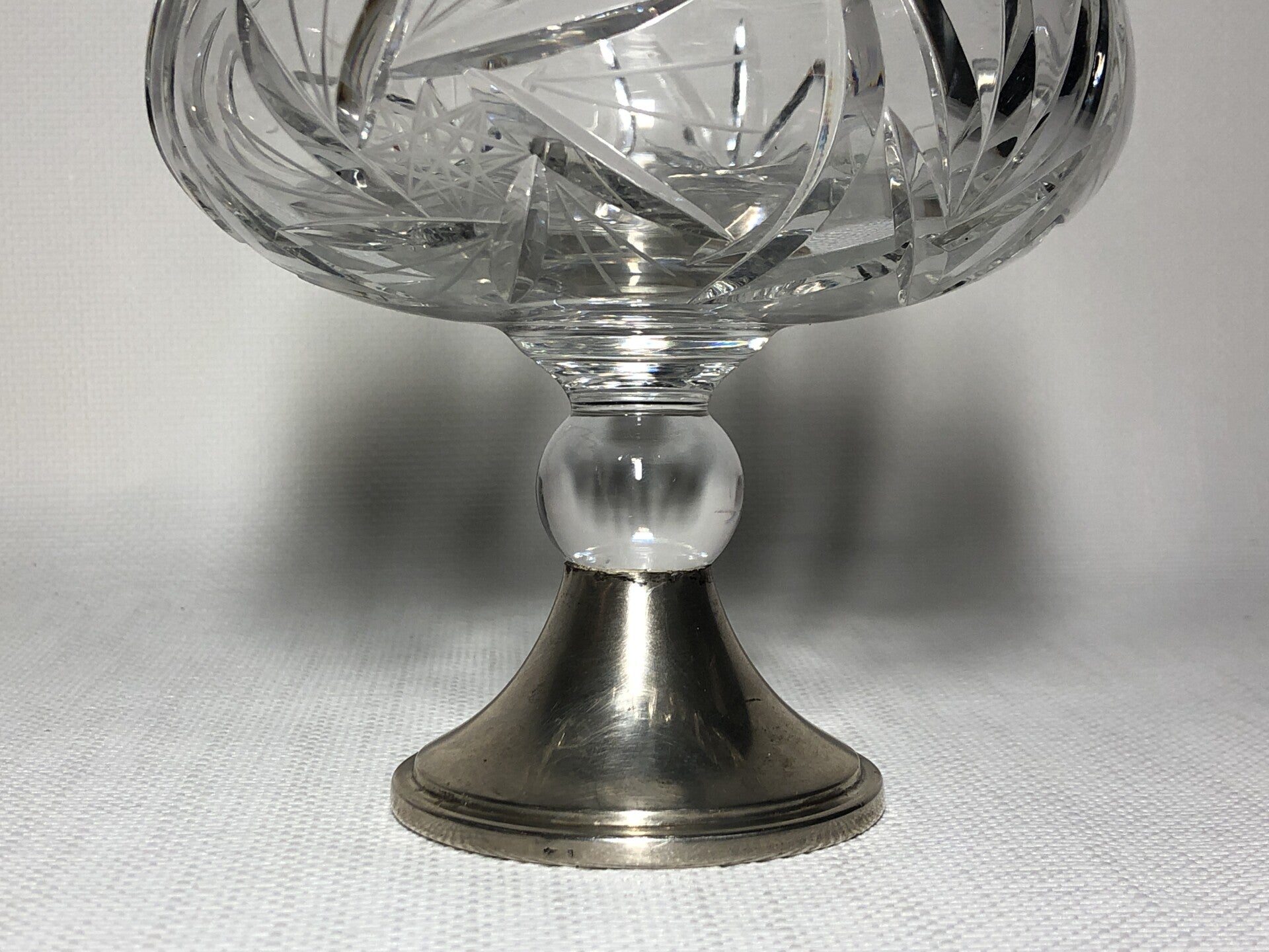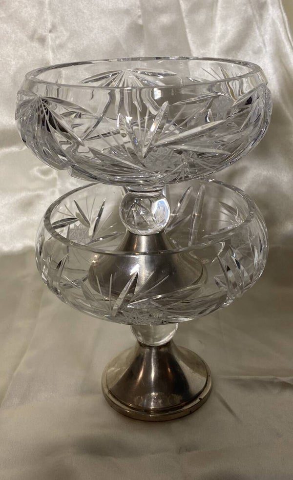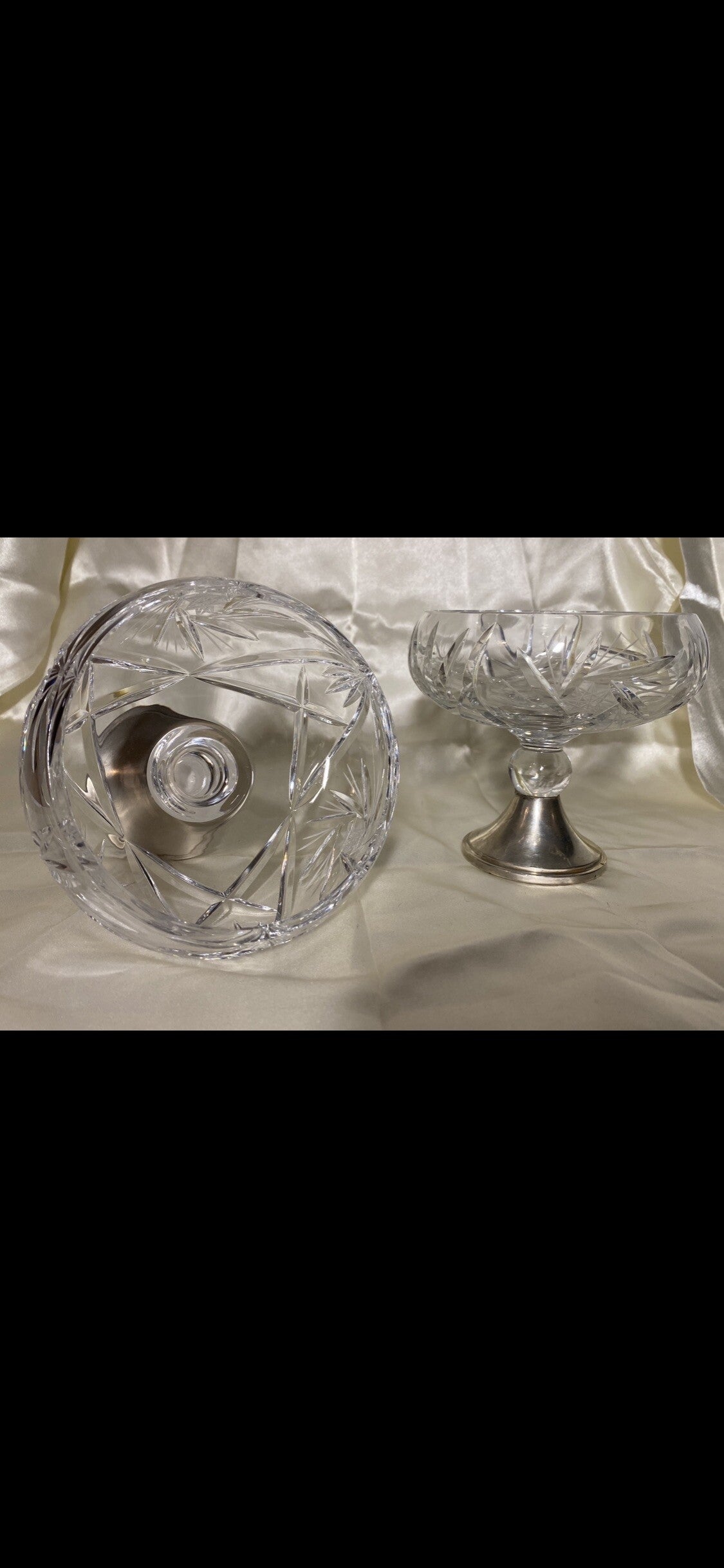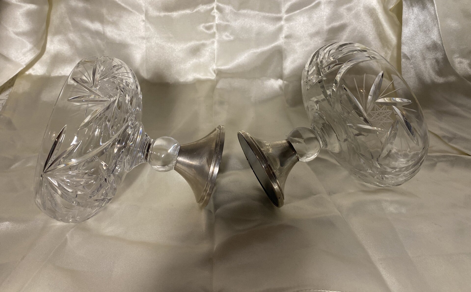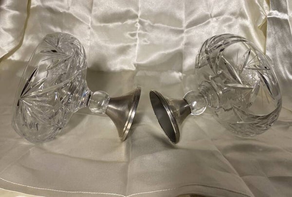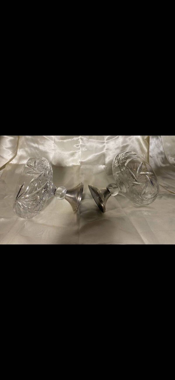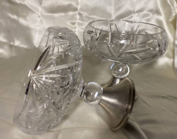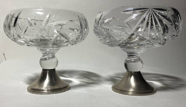 Twee kristallen schalen op zilveren voet. Afmetingen: hoogte: 13cm en breedt: 12cm.
