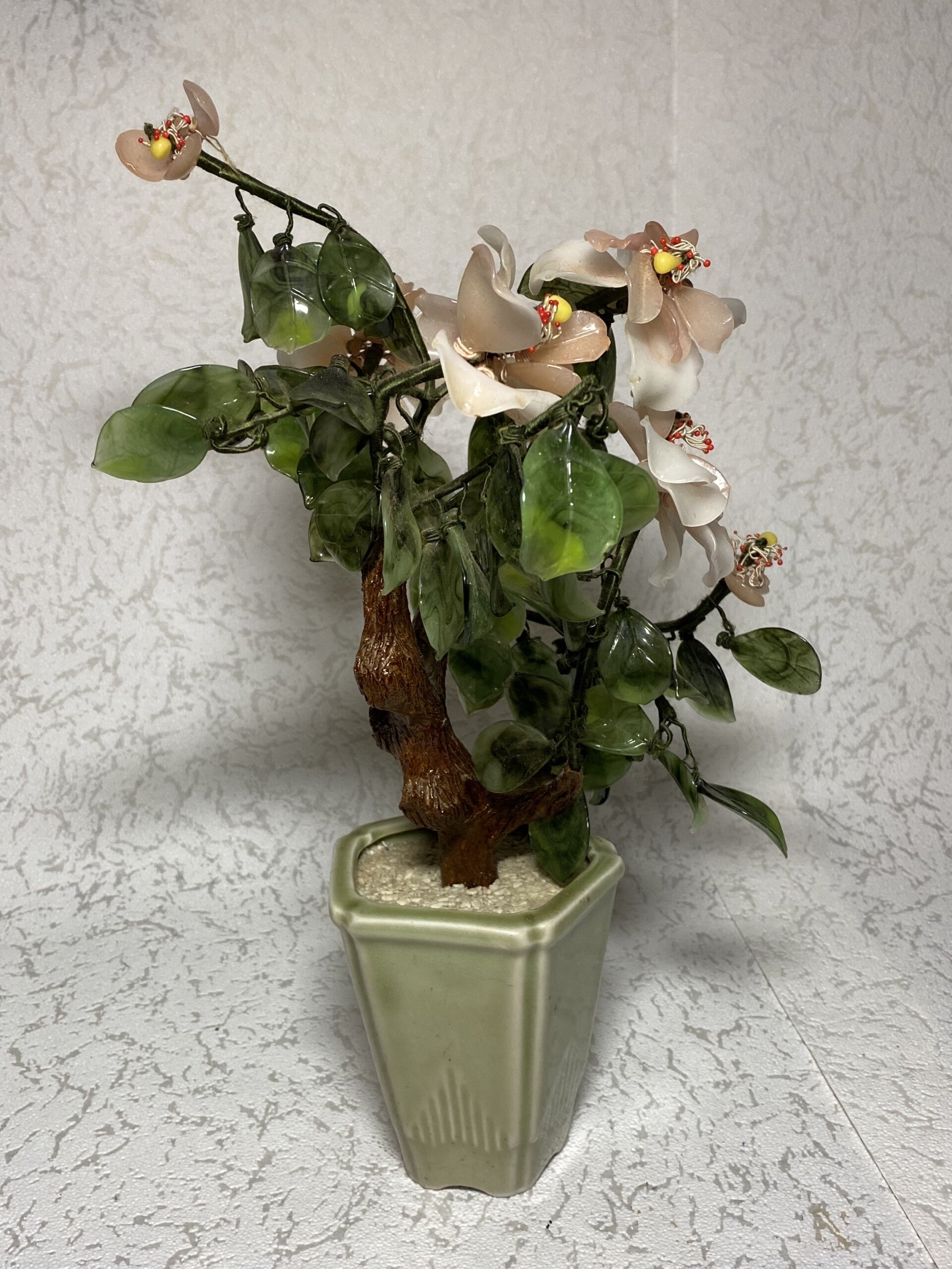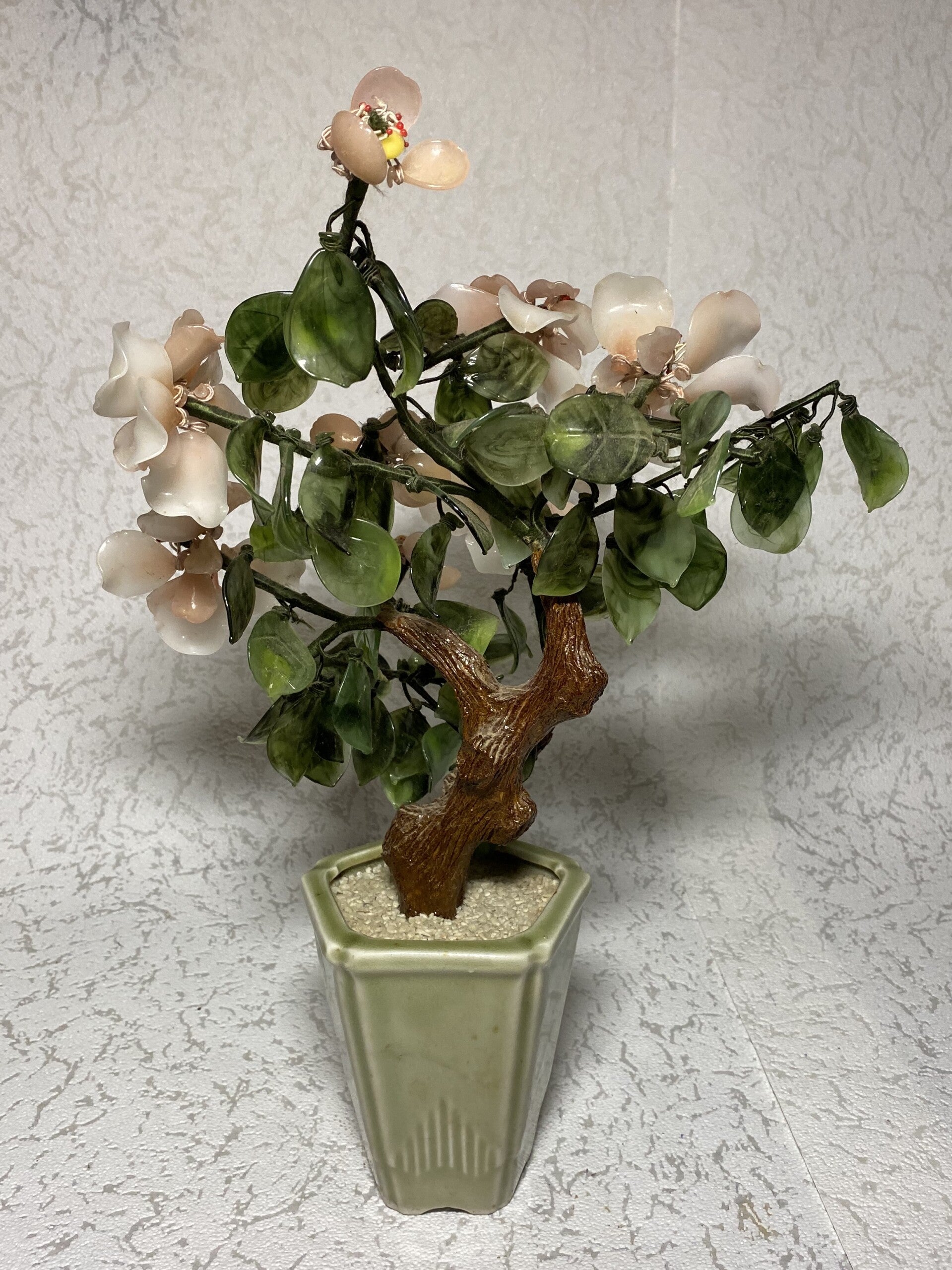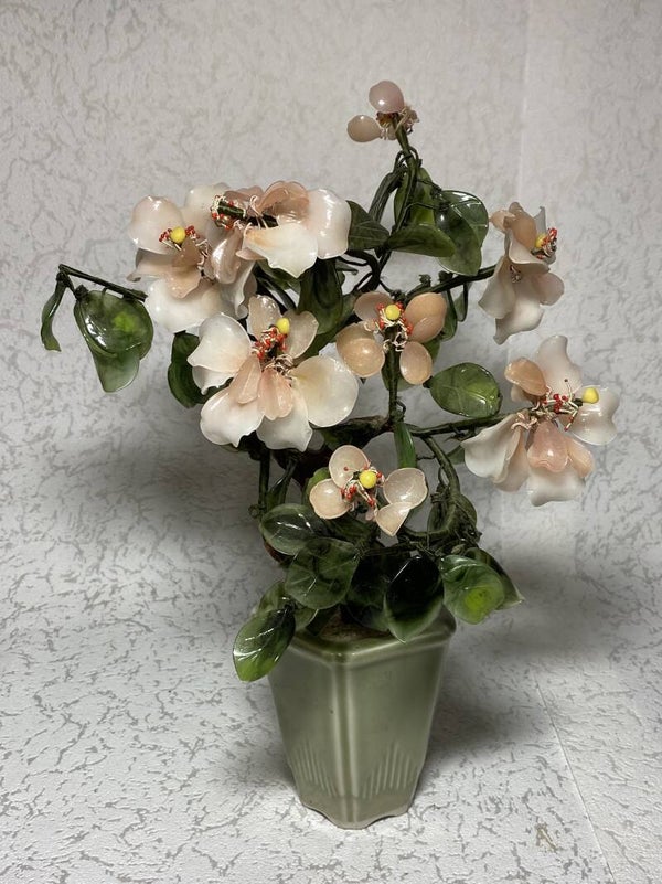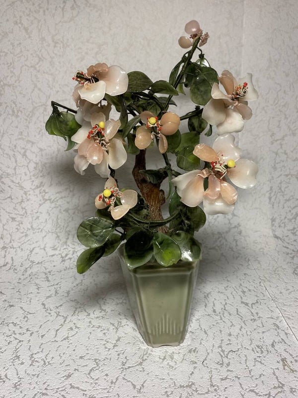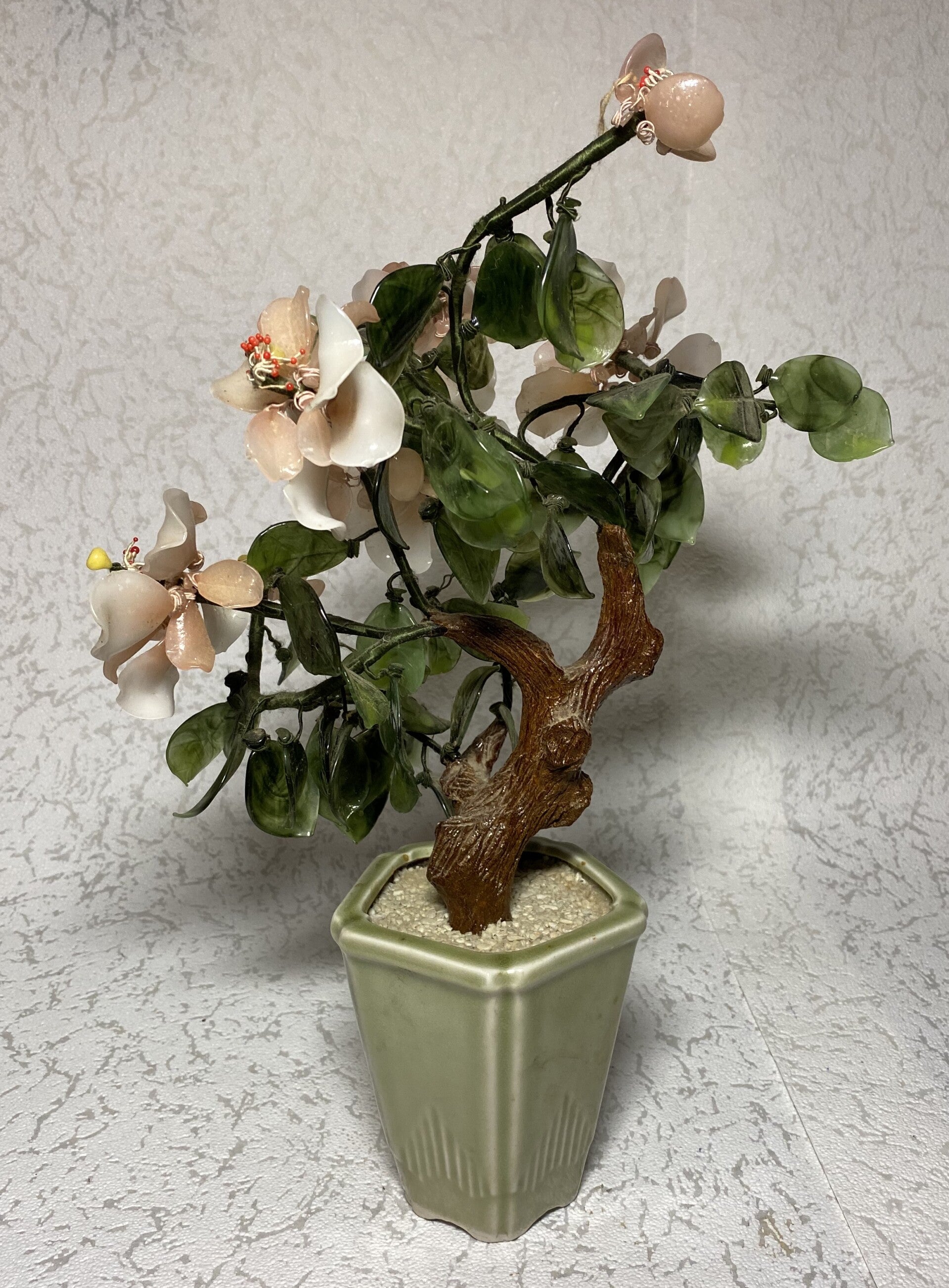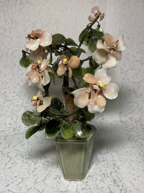 Chinese geluksboompje van jade nefriet en rozekwarts.
