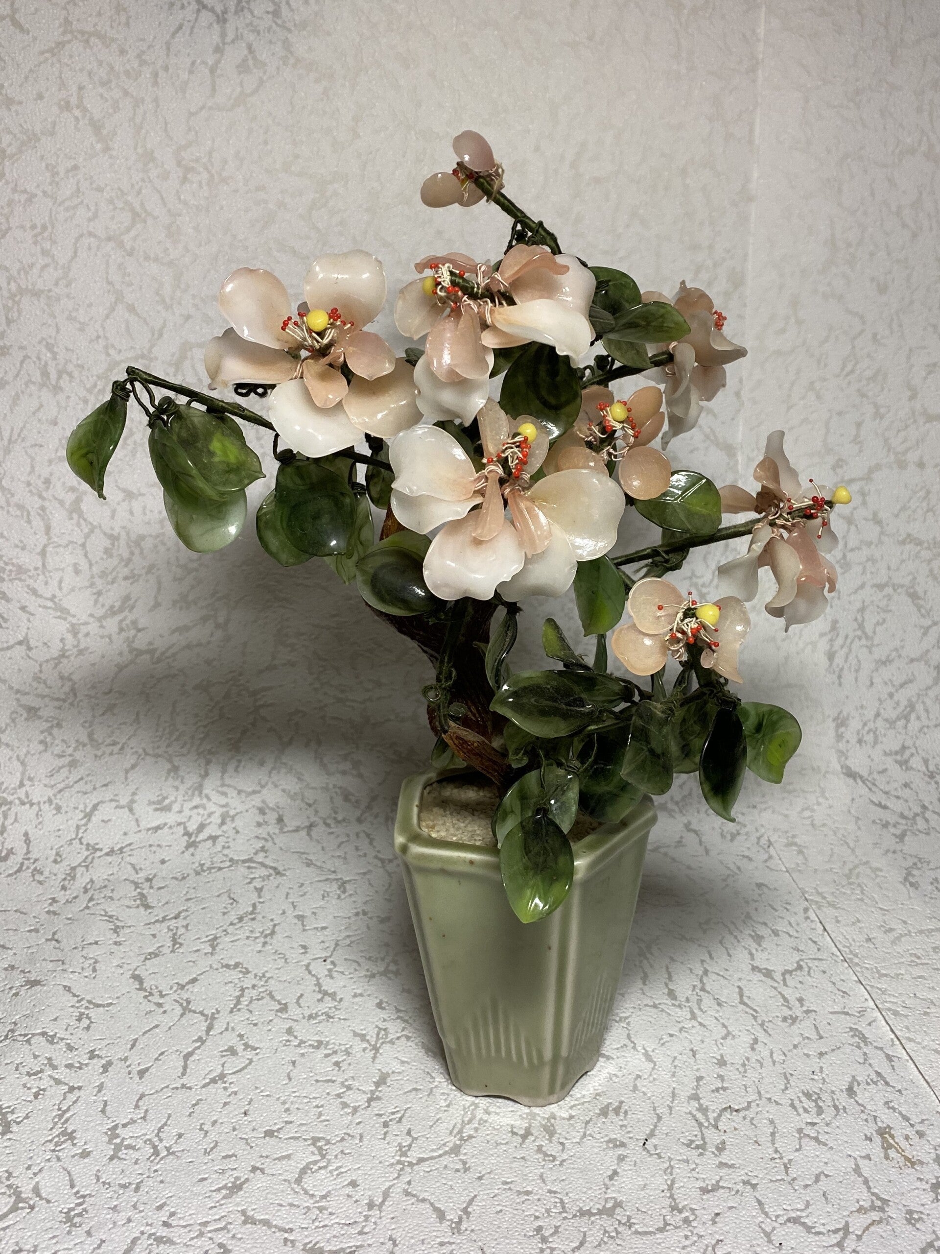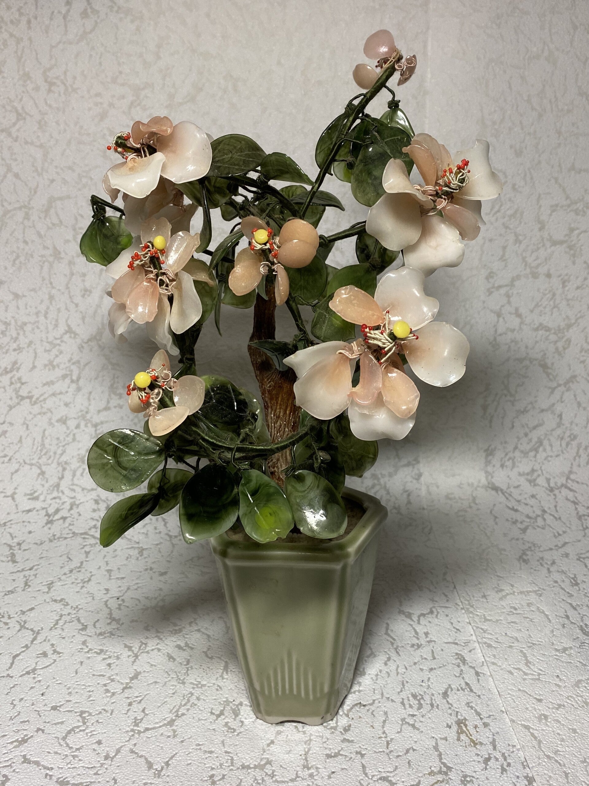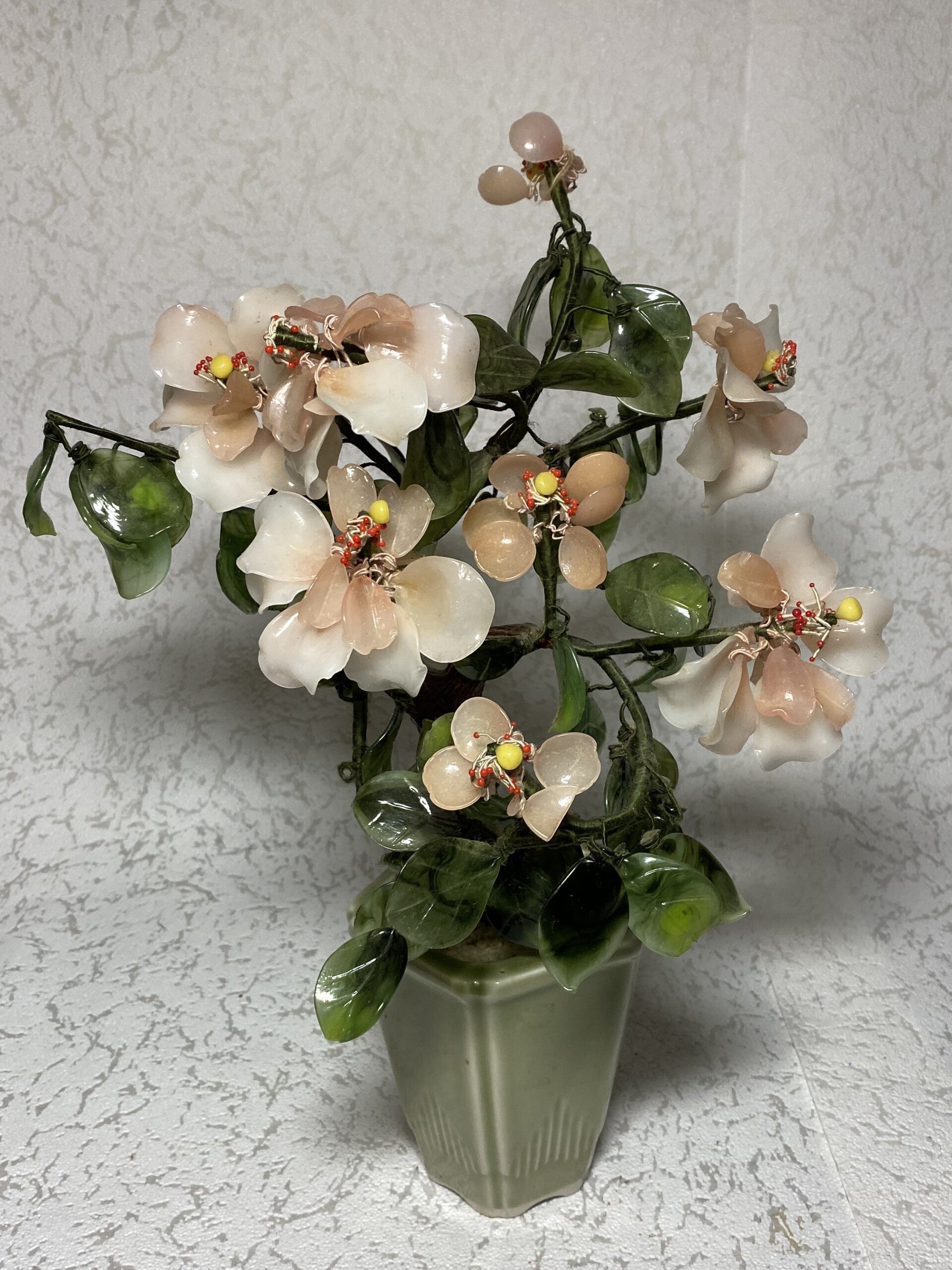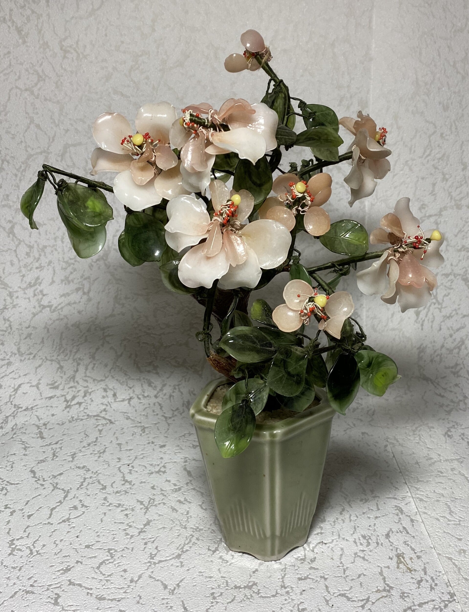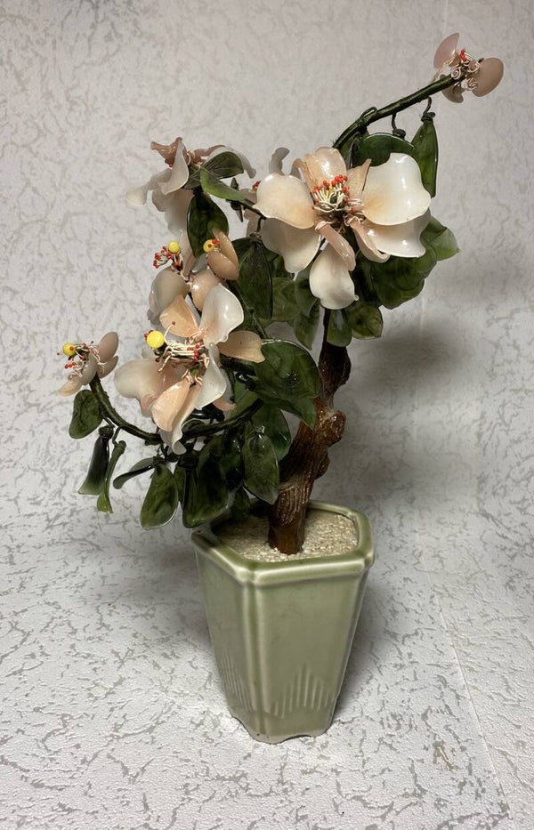 Chinese geluksboompje van jade nefriet en rozekwarts.