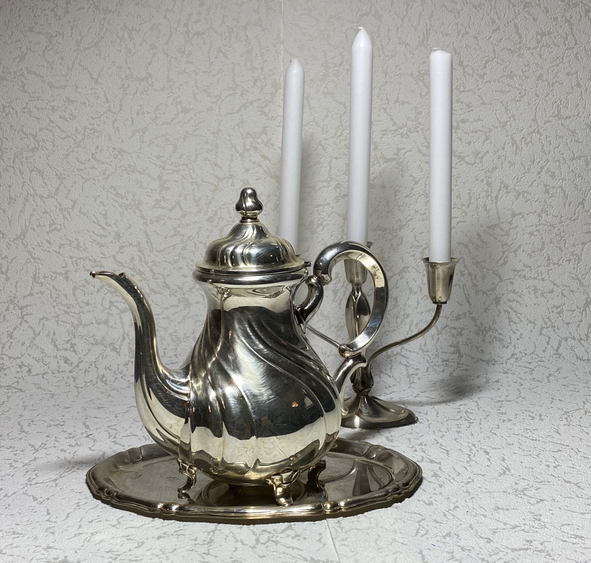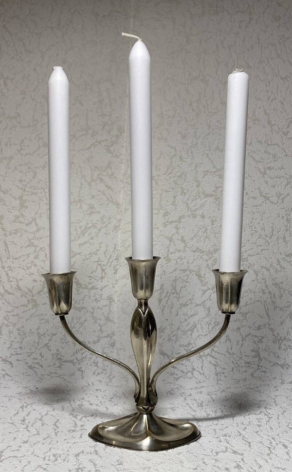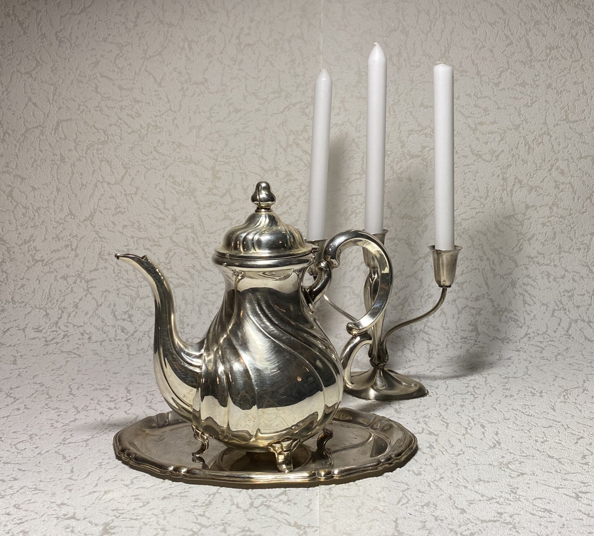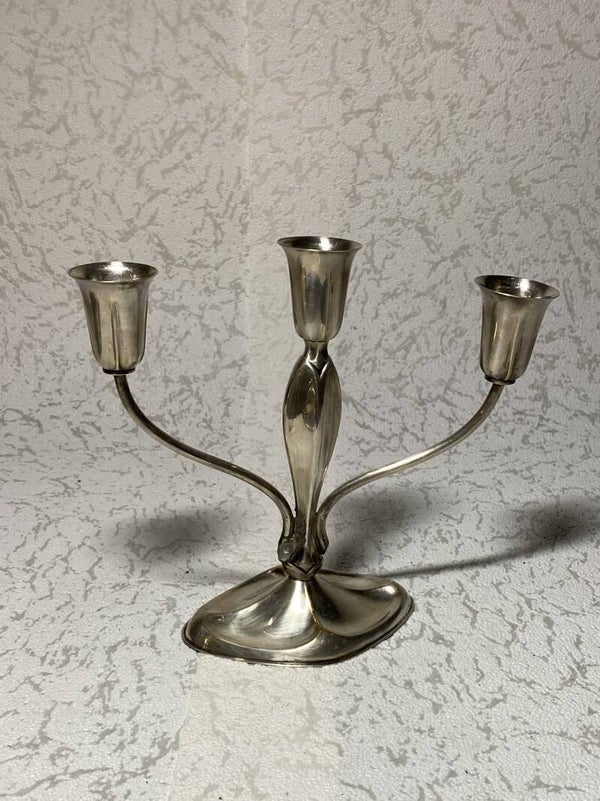 Verzilverde Art Nouveau koffiepot & dienblad, Lutz & Weiss 3-armige kandelaar uit 1925, fabriek gevestigt in 1882 Duitsland. Koffiepot H 24 B 26 cm Dienblad: 27 x 17 cm Kandelaar: H 17 x B 20 cm