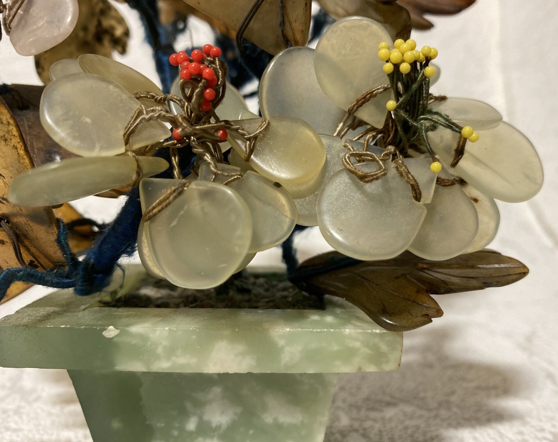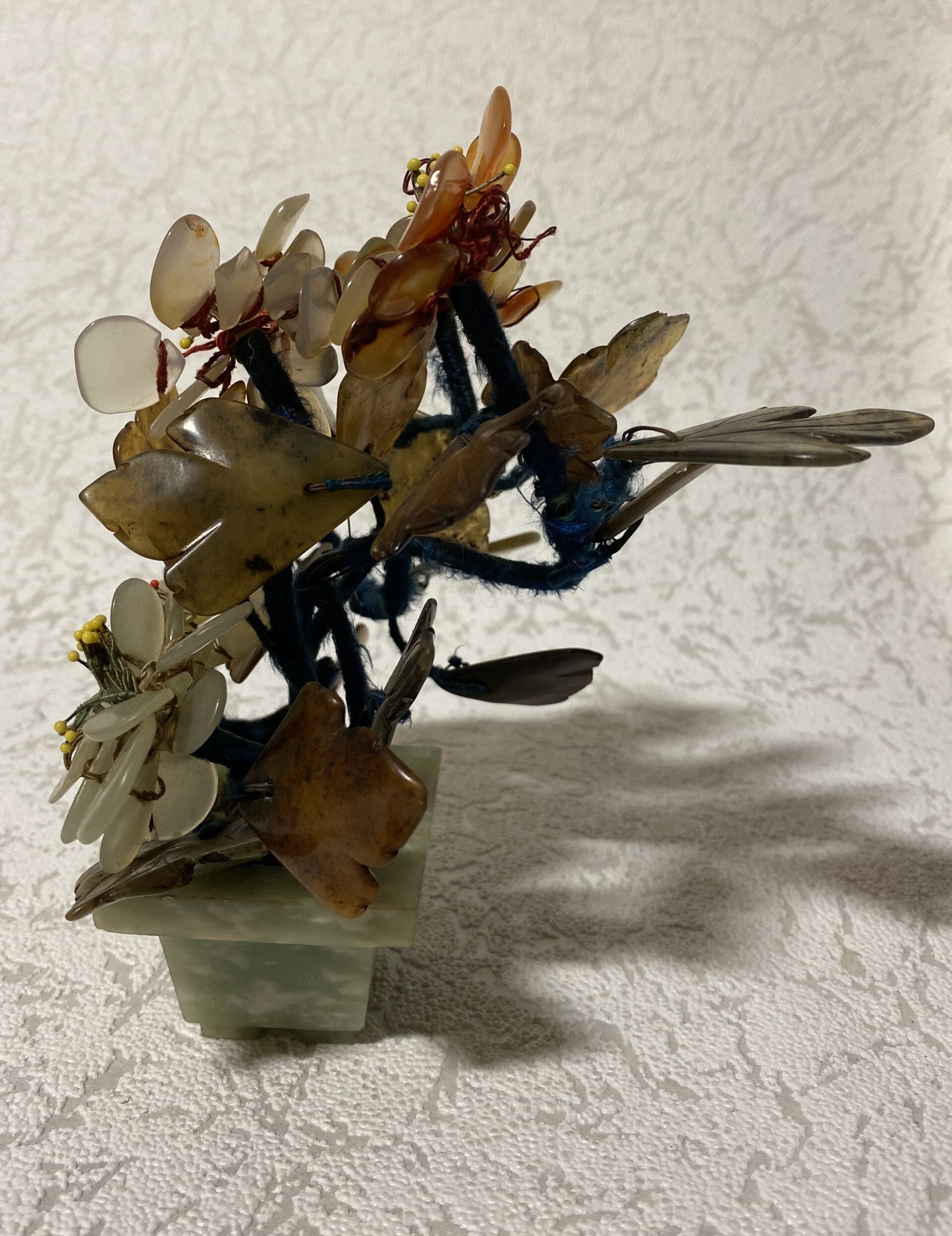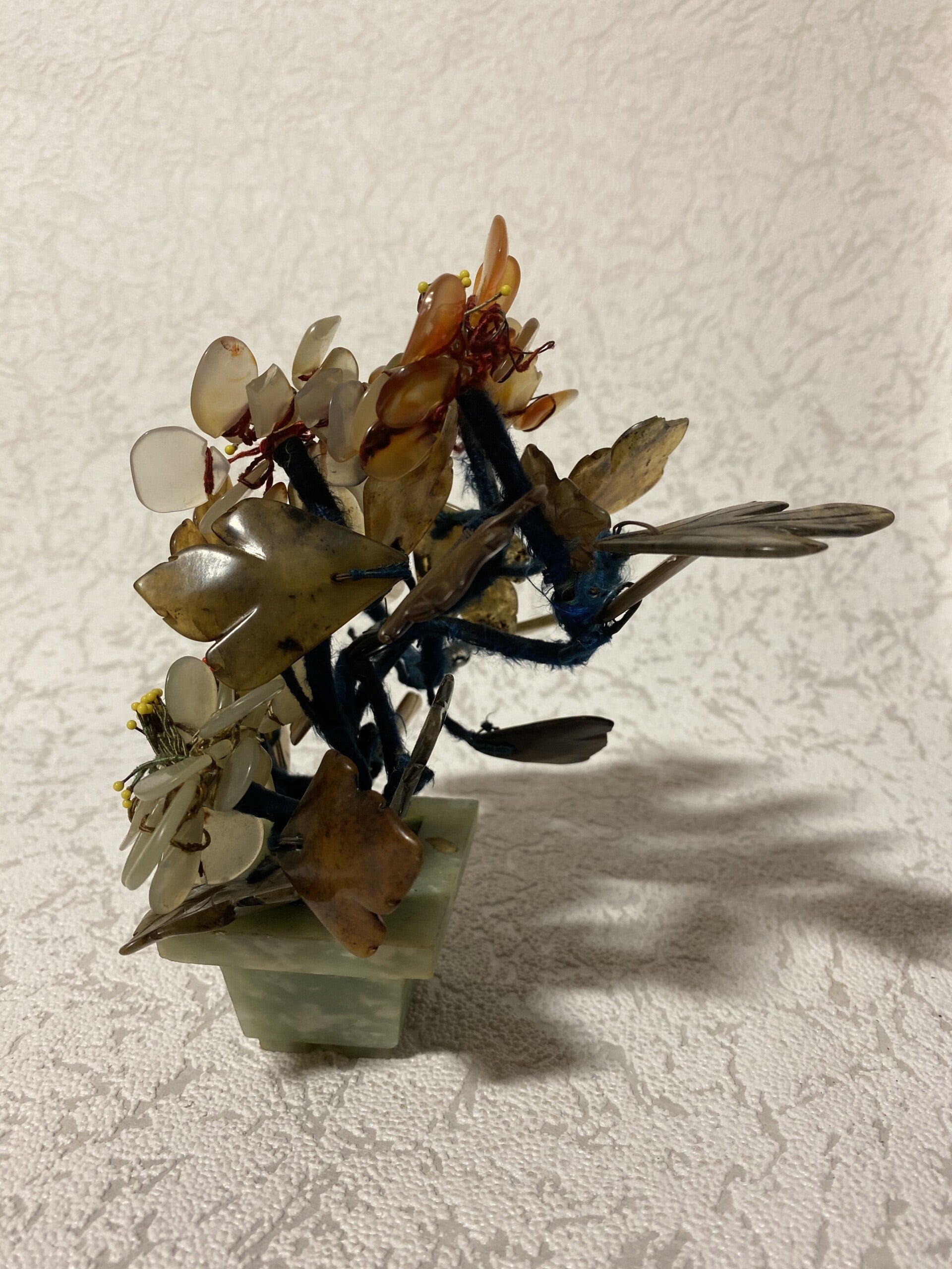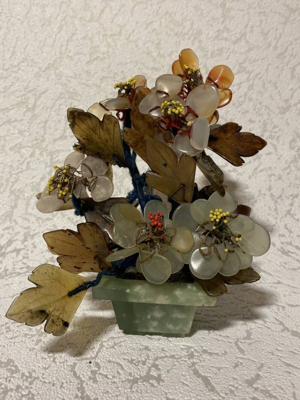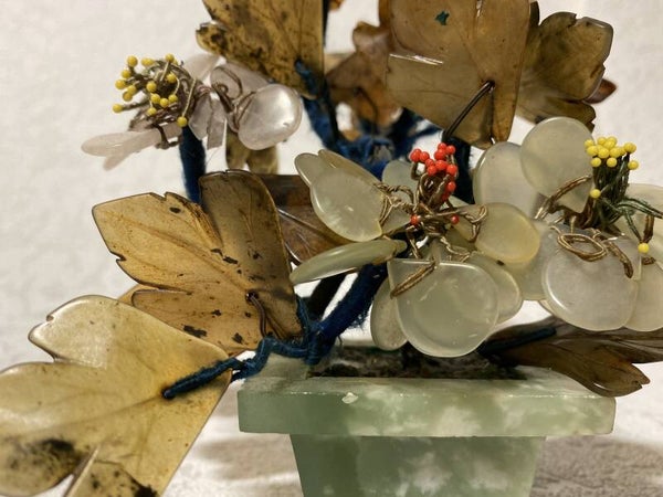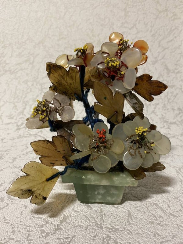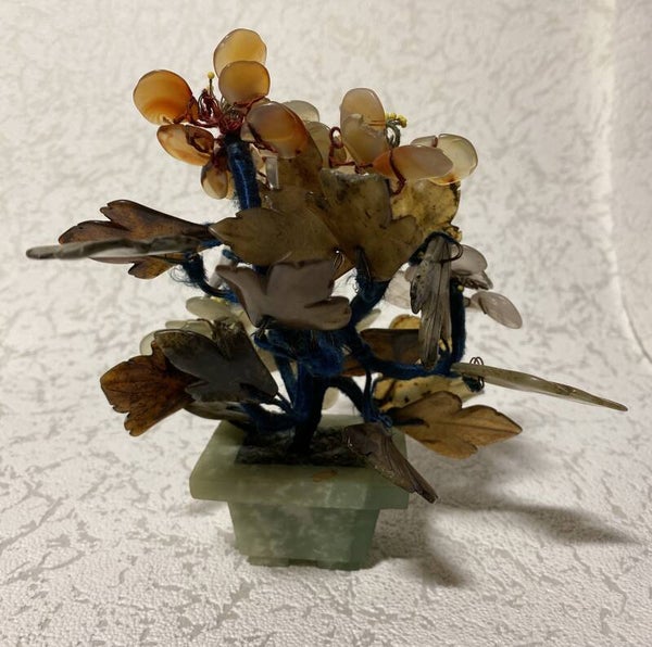 Edelstenen bonsai boompje, wat onder andere serpentijn en jade als bevat.