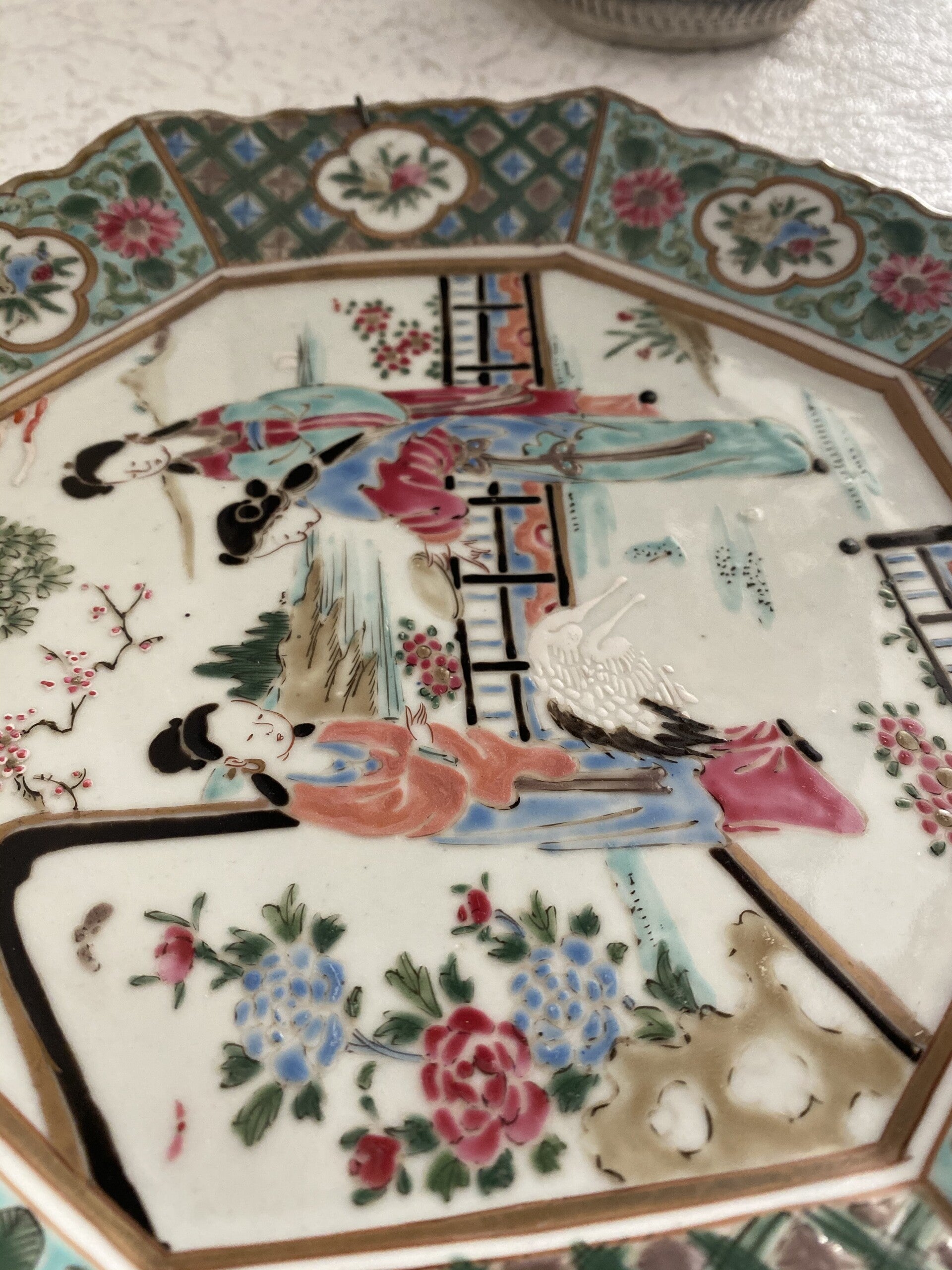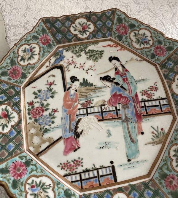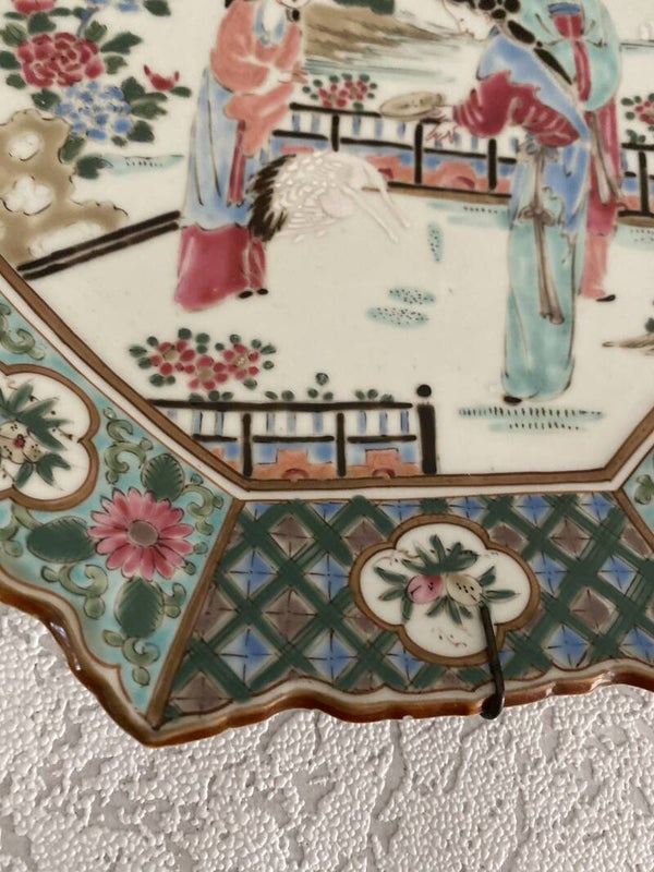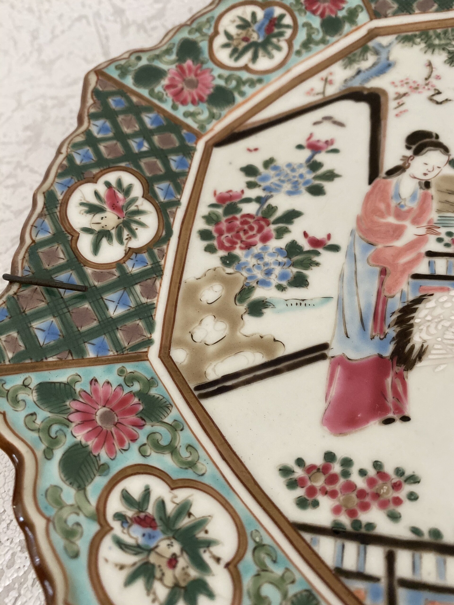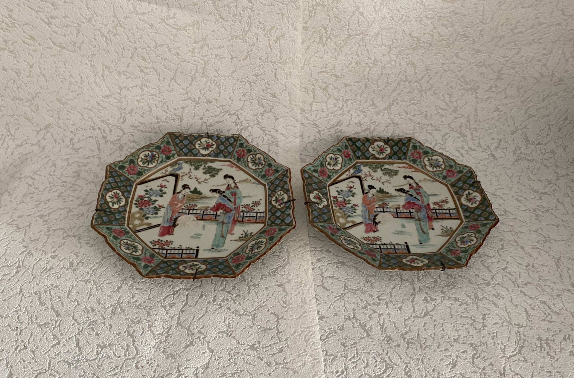 2 Japanse 'Famille Rose' porseleinen achthoekige wandborden uit de Meji periode.