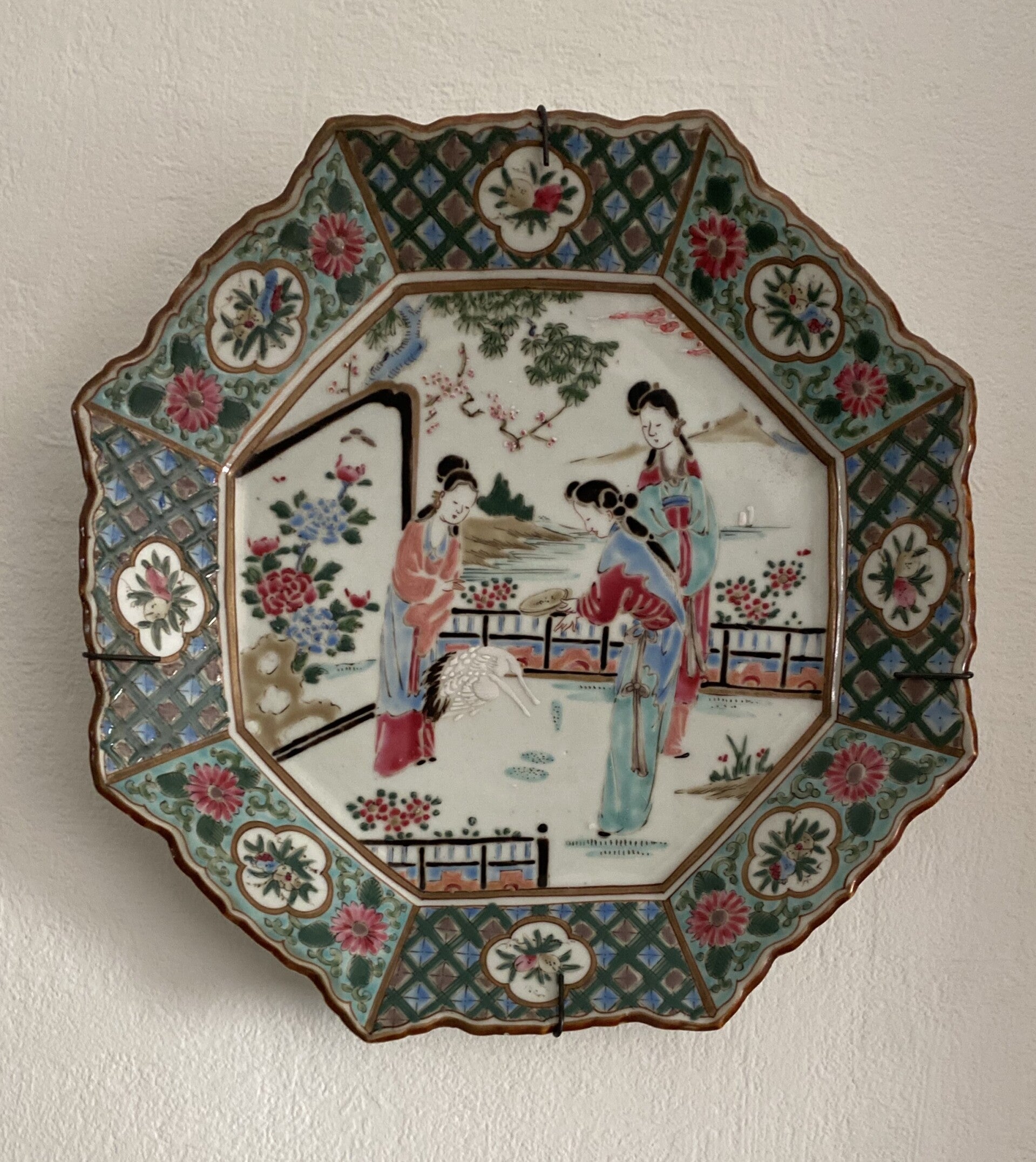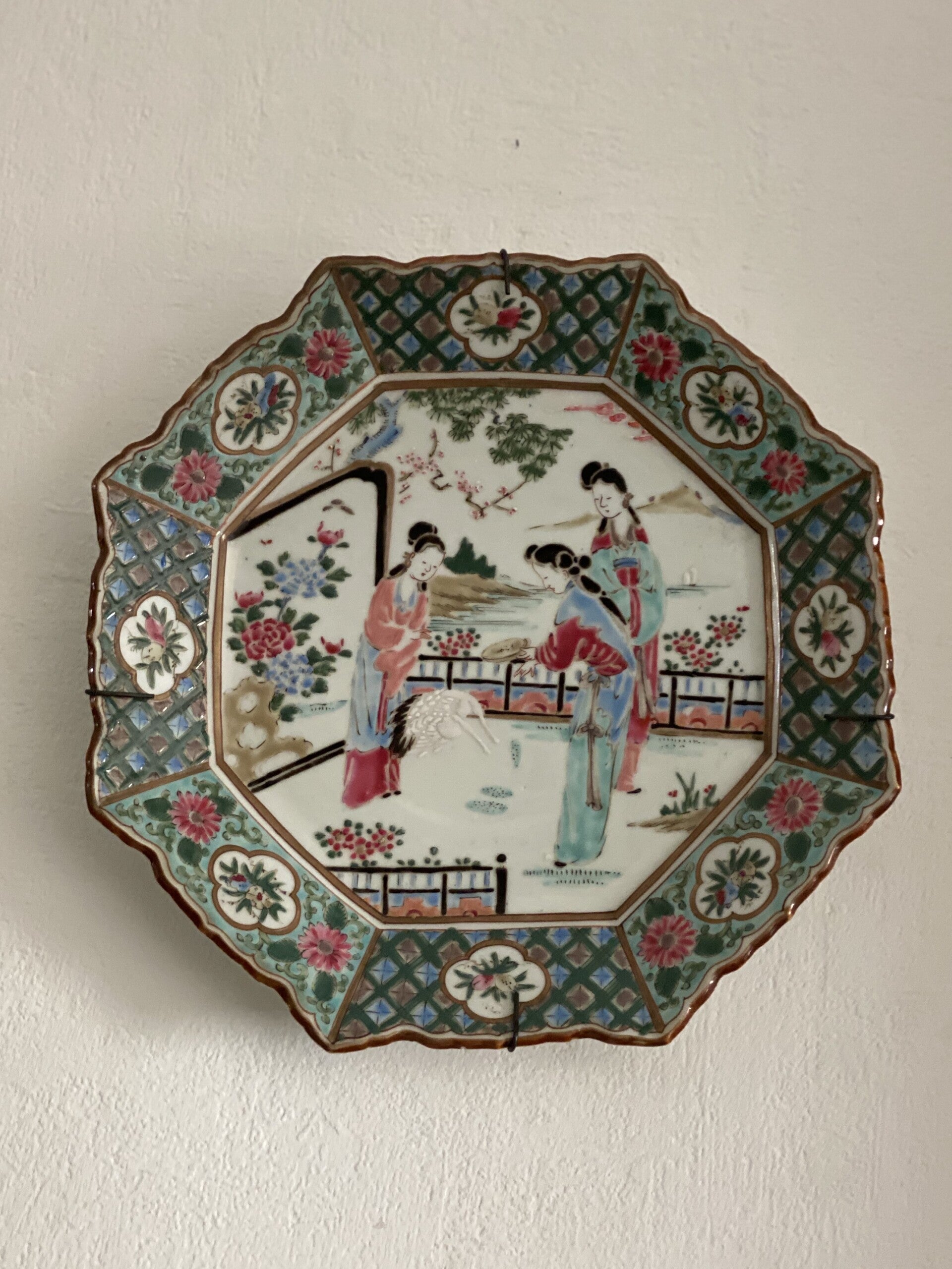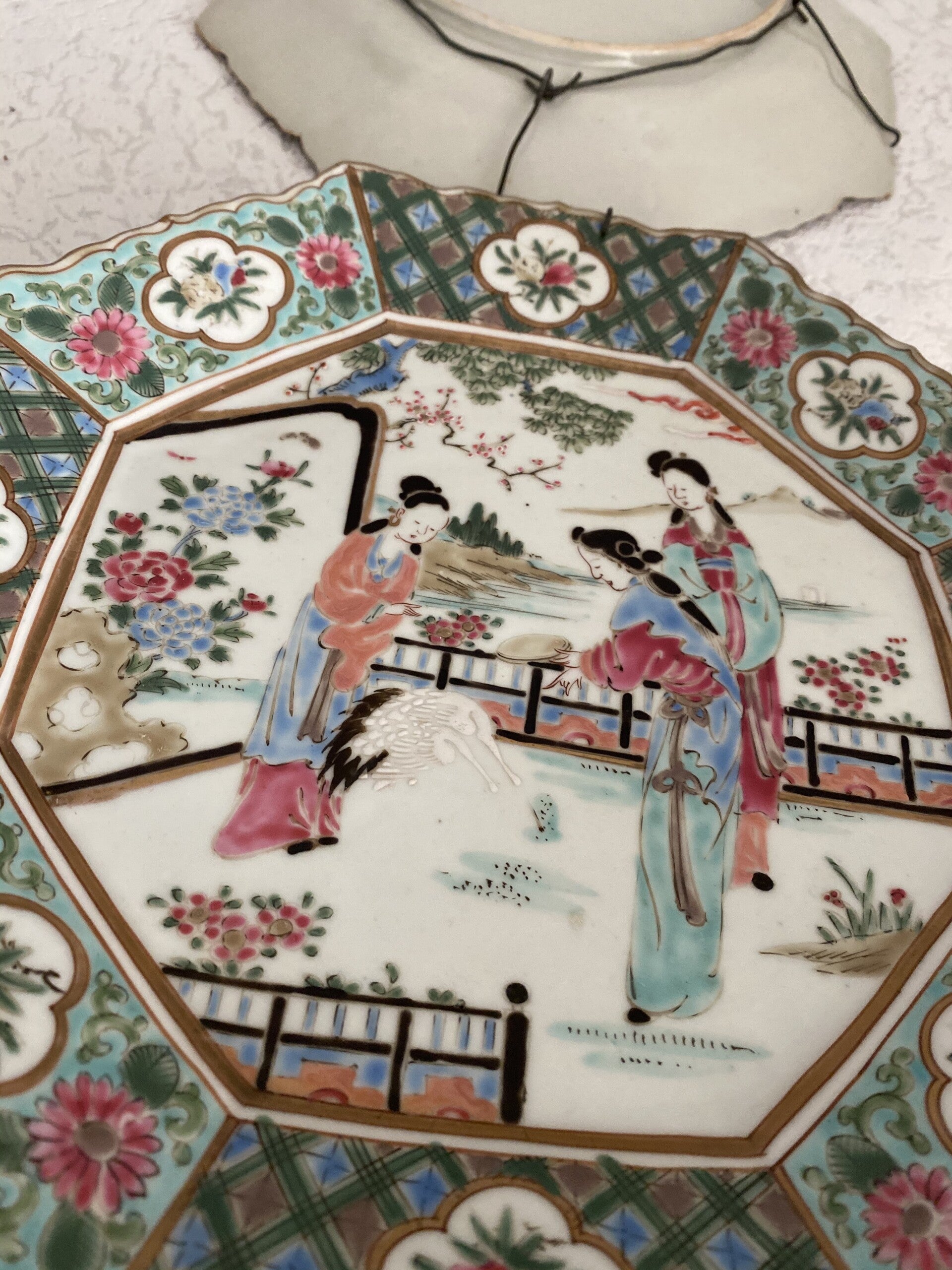 2 Japanse 'Famille Rose' porseleinen achthoekige wandborden uit de Meji periode.
