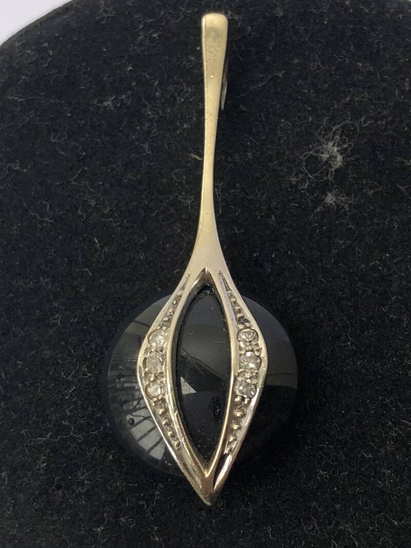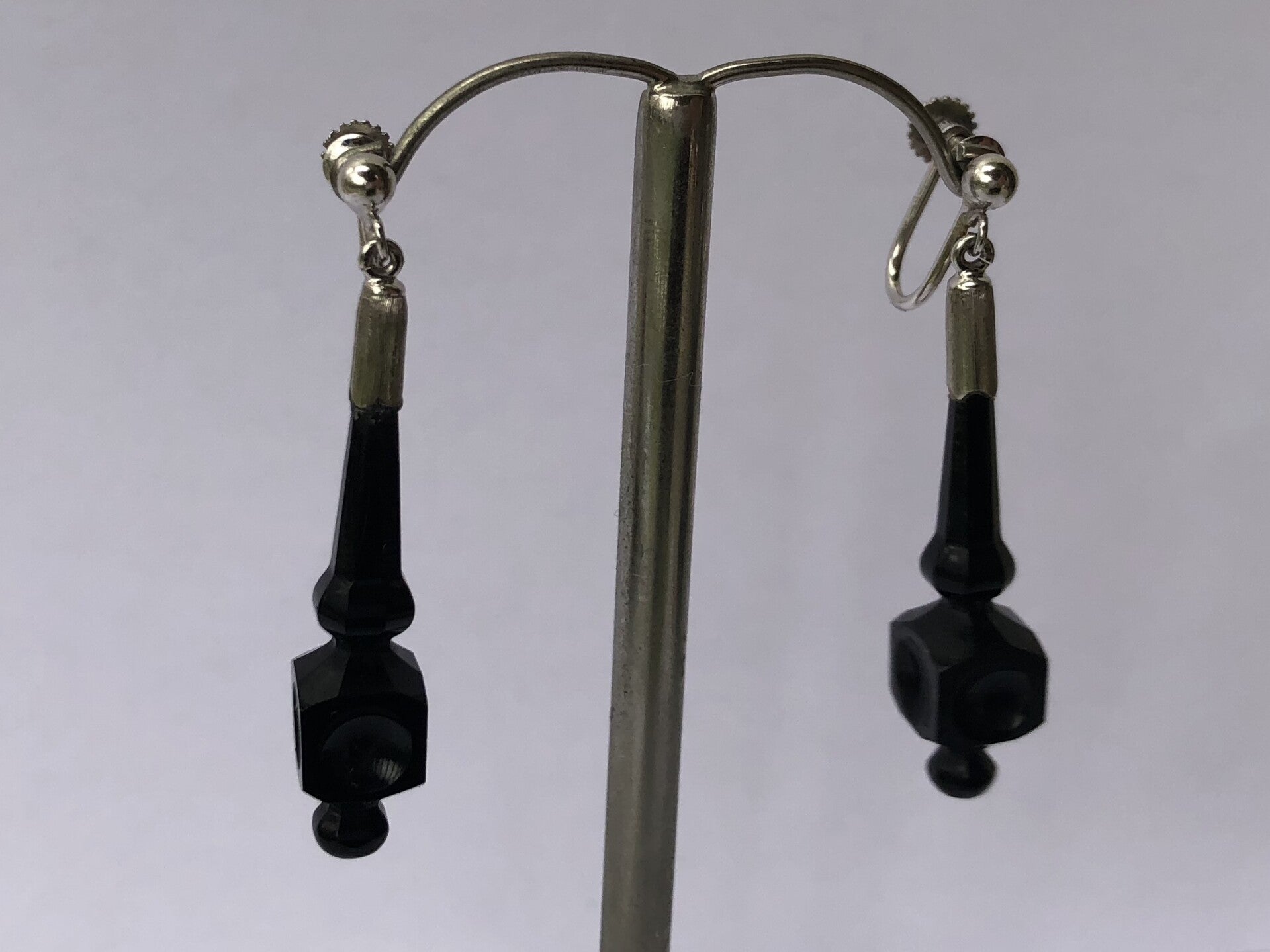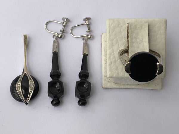 18k witgoud en Onyx set, bestaande uit, een ring, hanger en oorbellen.