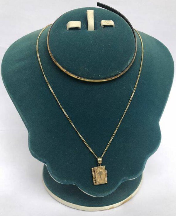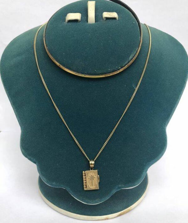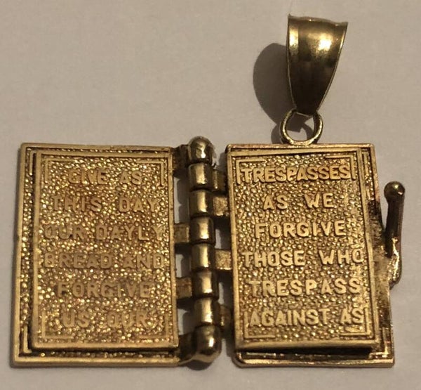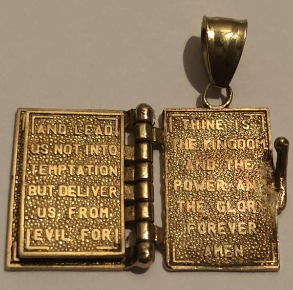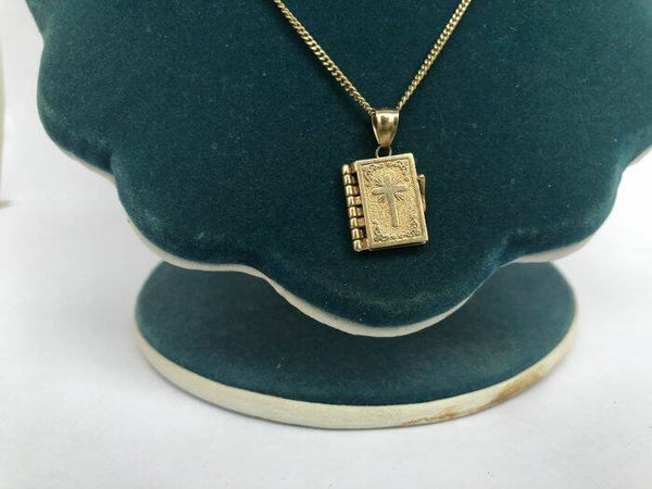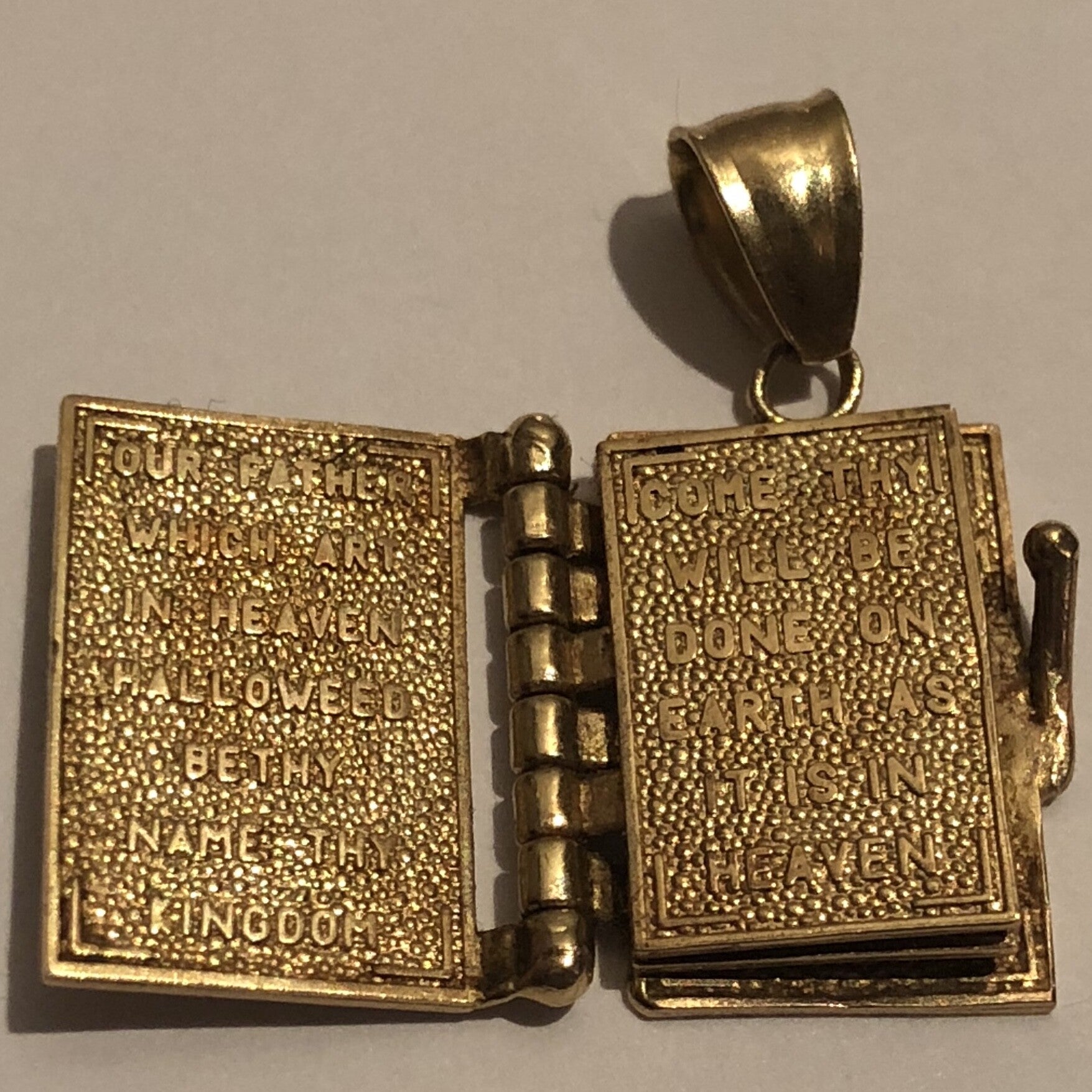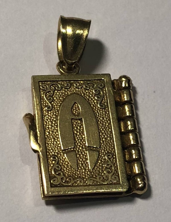 14-karaats gouden medaillon in de vorm van een boek, waarin een tekst dat lijkt op een bijbelverz.Boekgrootte: 1,4 x 1,2 cm
