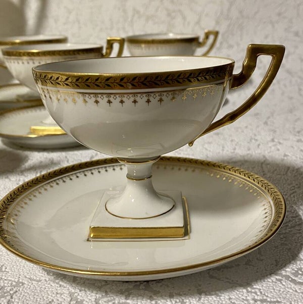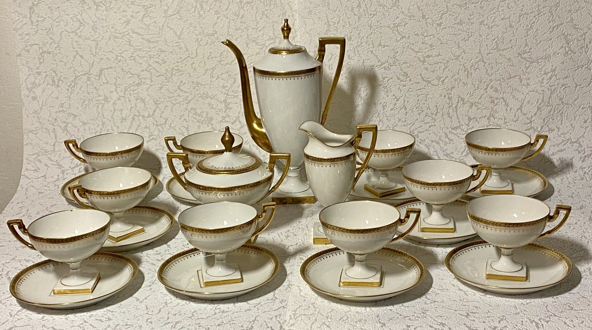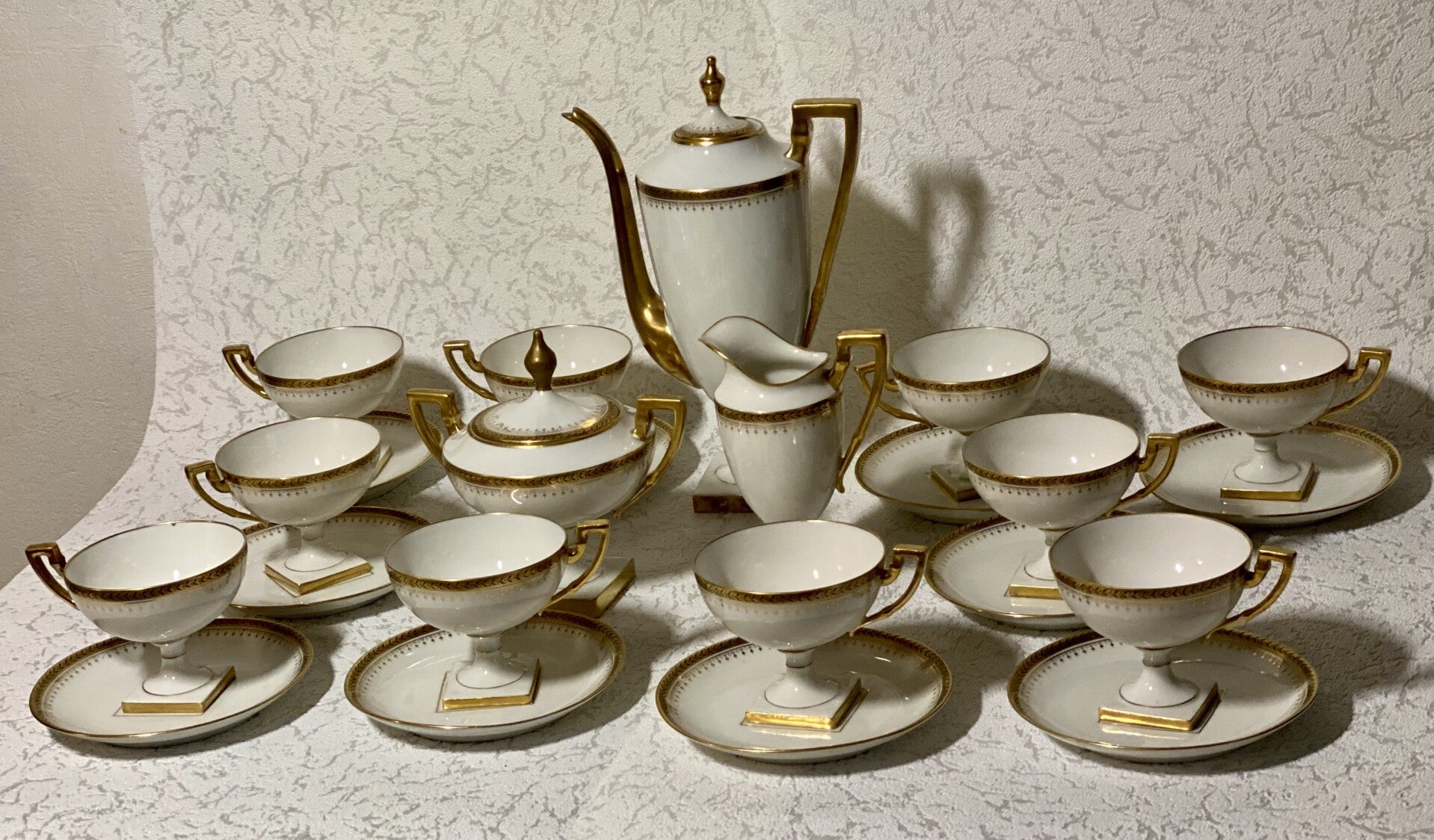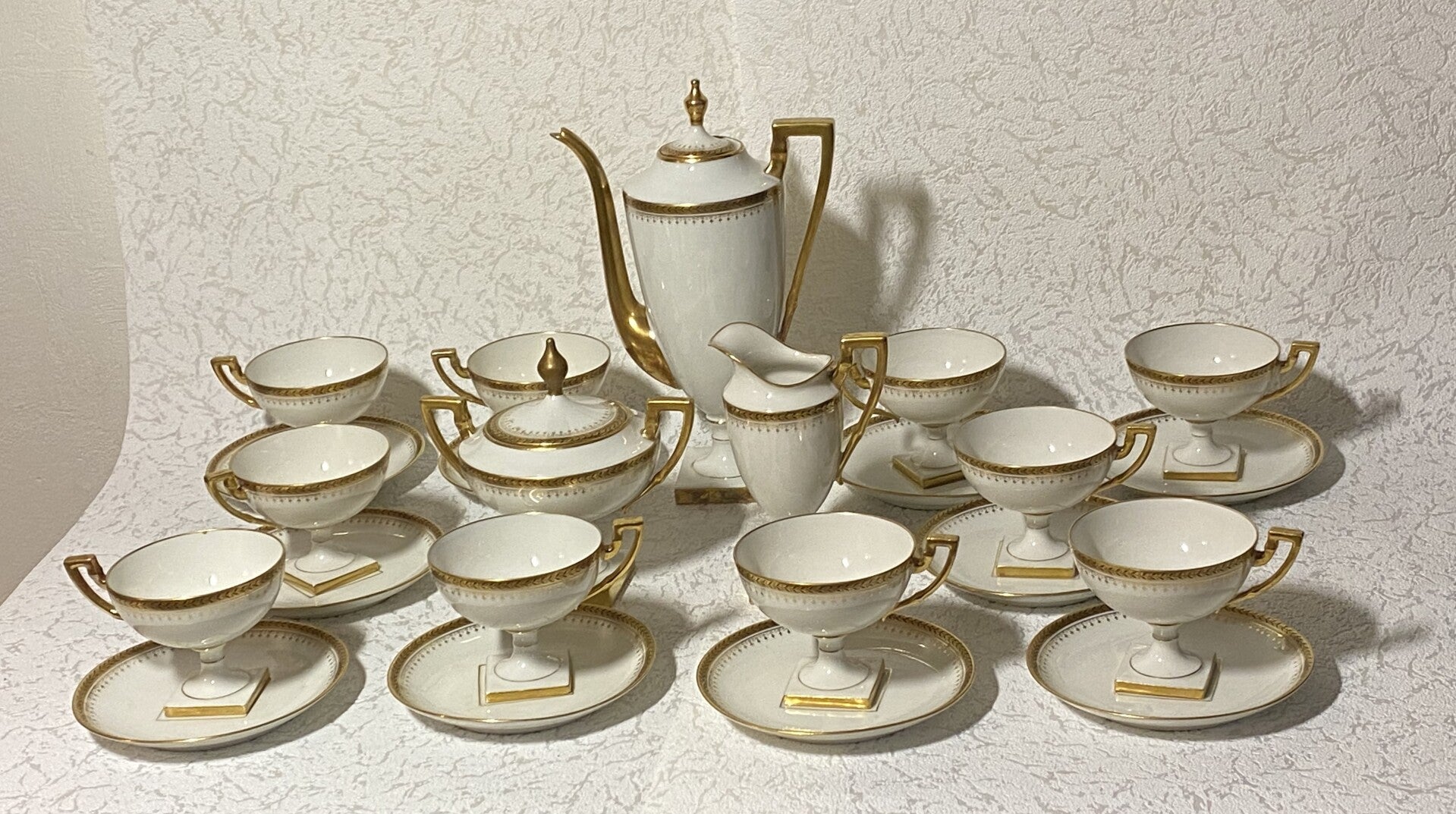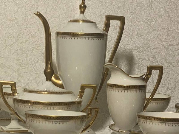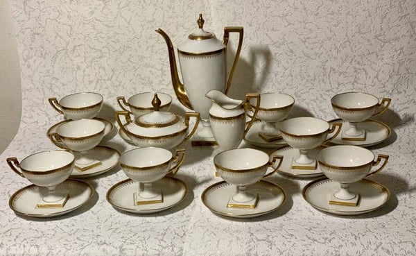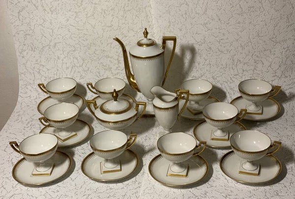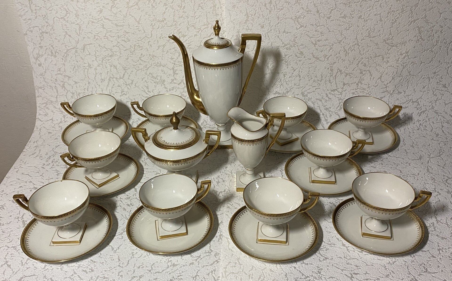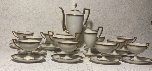 Porseleinen 'La Seynie' Limoges thee servies, bestaande uit: 10 koppen en schotels, een theepot, een roomkan en een suikerpot.