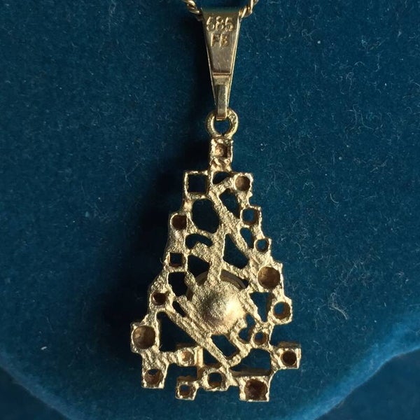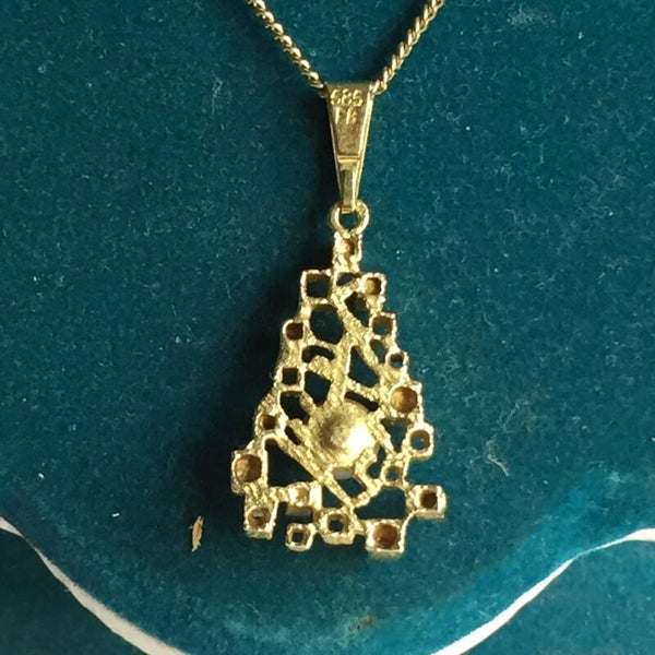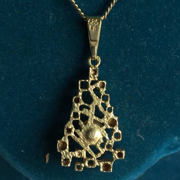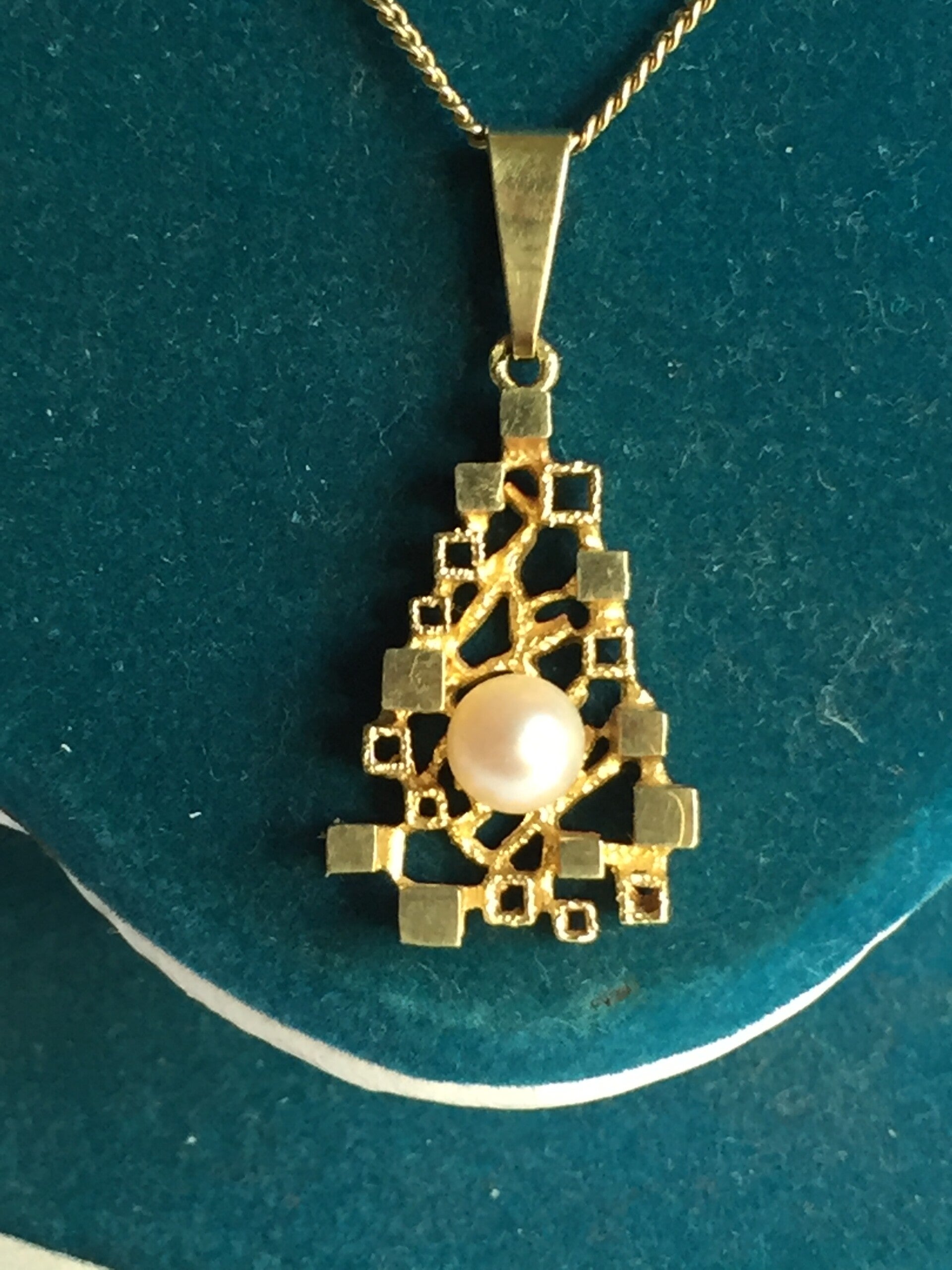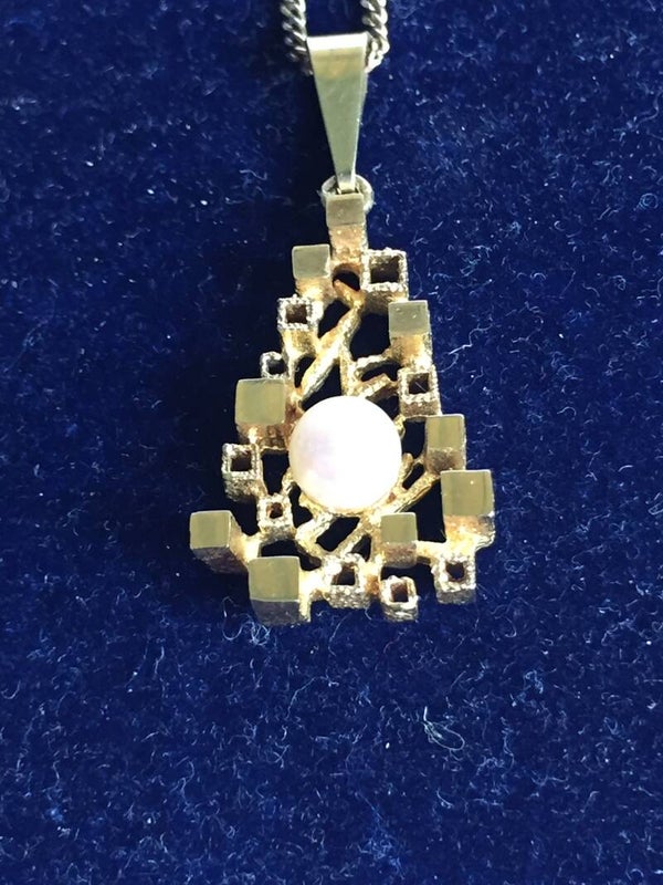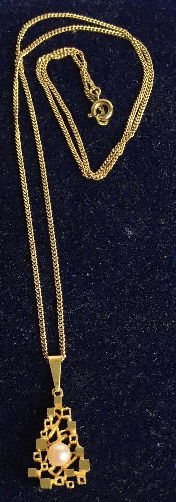 14 krt.gouden hanger bezet met een parel aan een 14 krt. gouden kettinkje.total brutogewicht 7 gramAfmetingen: ketting lengte 51 cm.hanger lengte 3 cmbreedte 1.3 cm