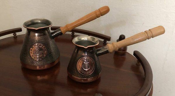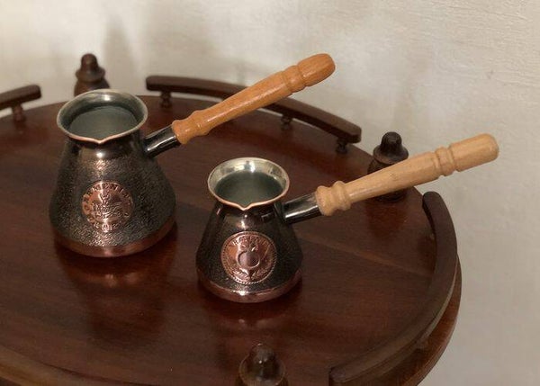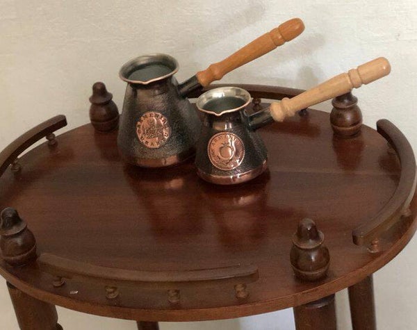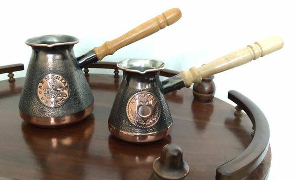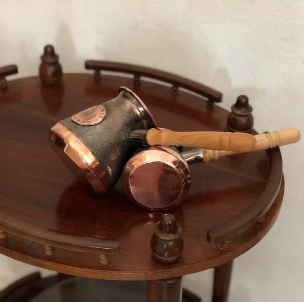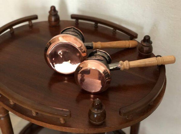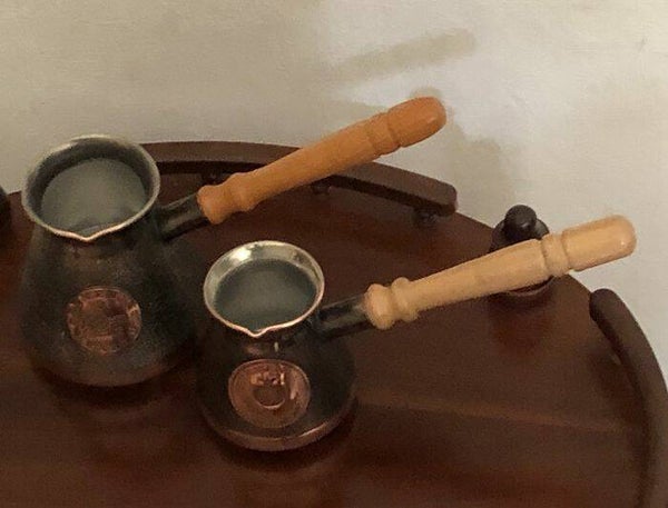 Twee ongebruikte Armeense koperen java/ koffie potten/ kannen met houten handvatten.