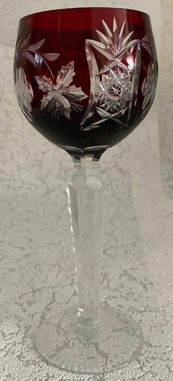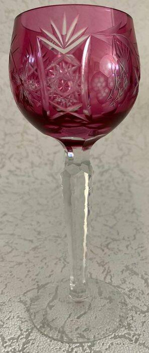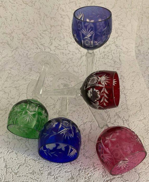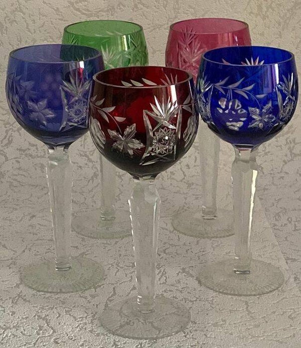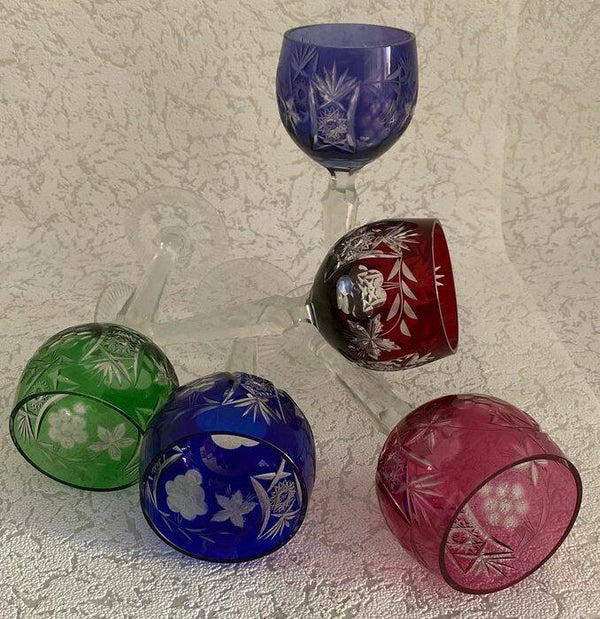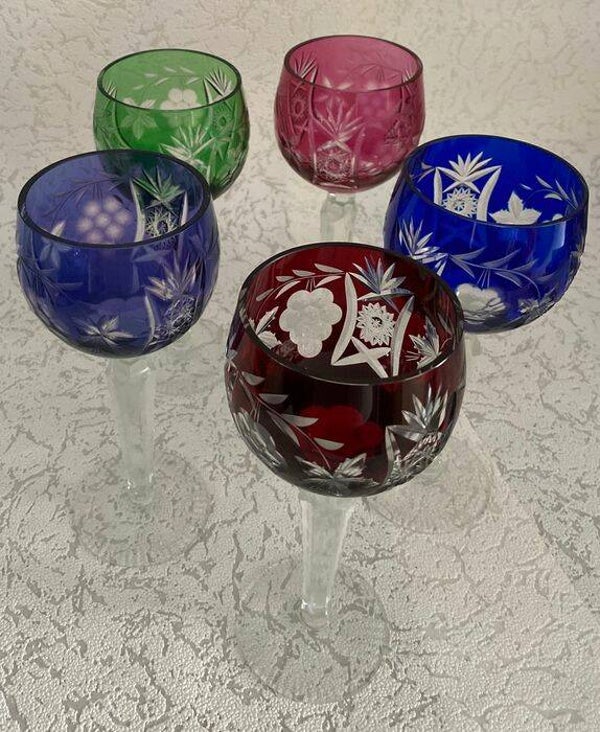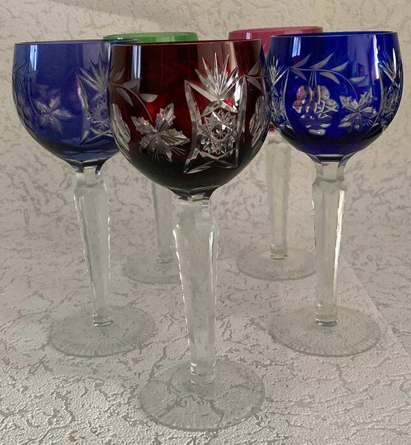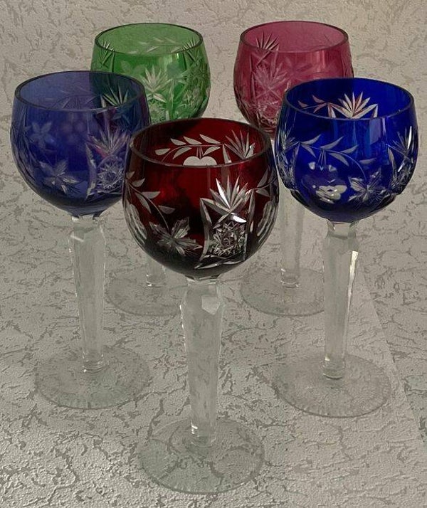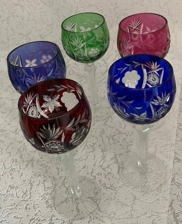5 gekleurde en geslepen kristallen wijnglazen in de kleuren geel, rood en bordeaux, aquamarijn, chartreuse. Afmetingen: hoogte: ca. 20cm en breedte: 7cm.