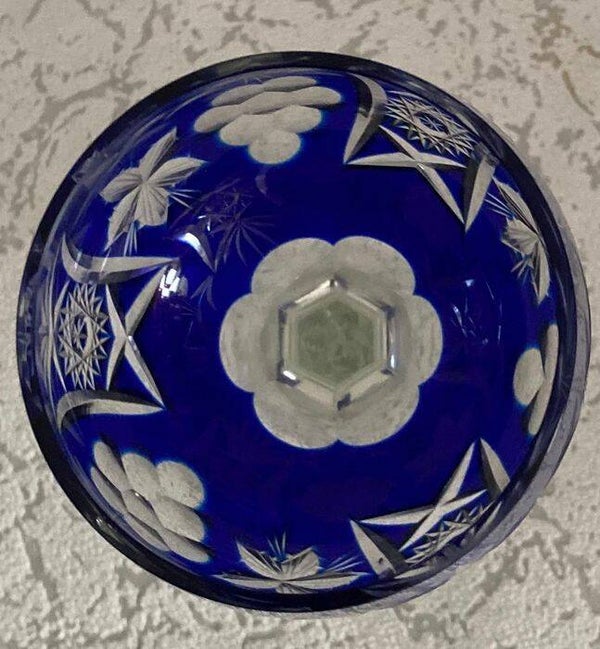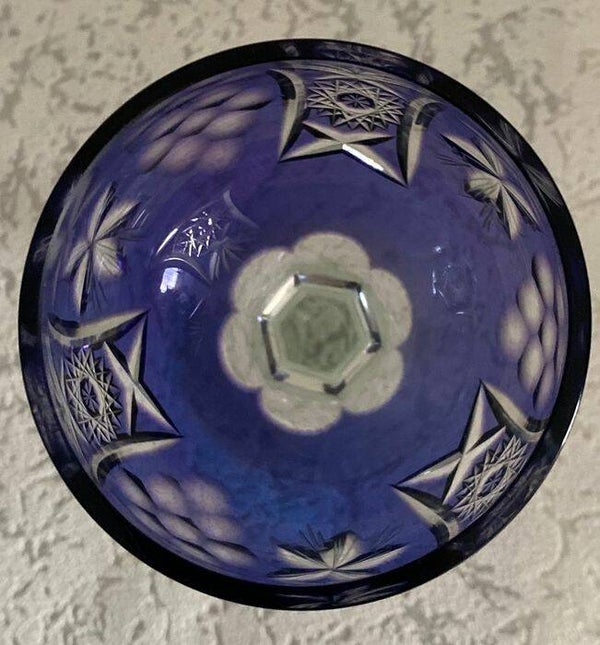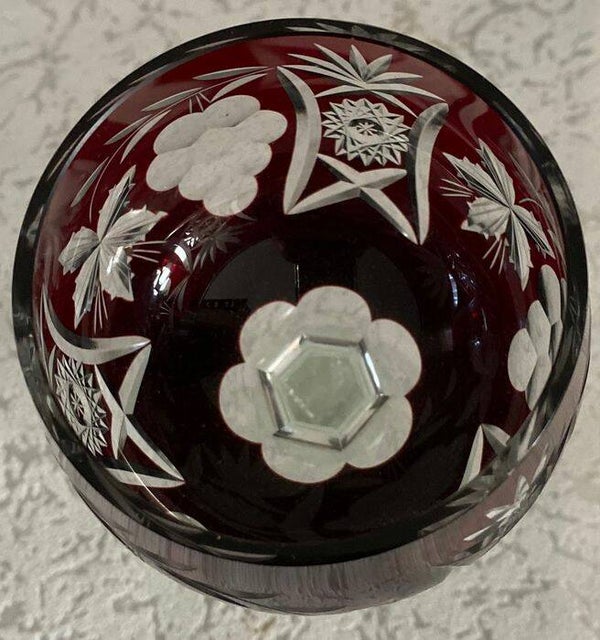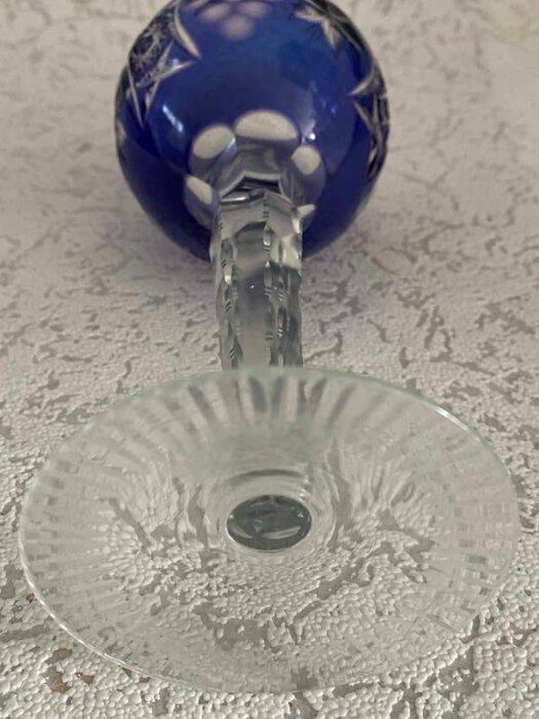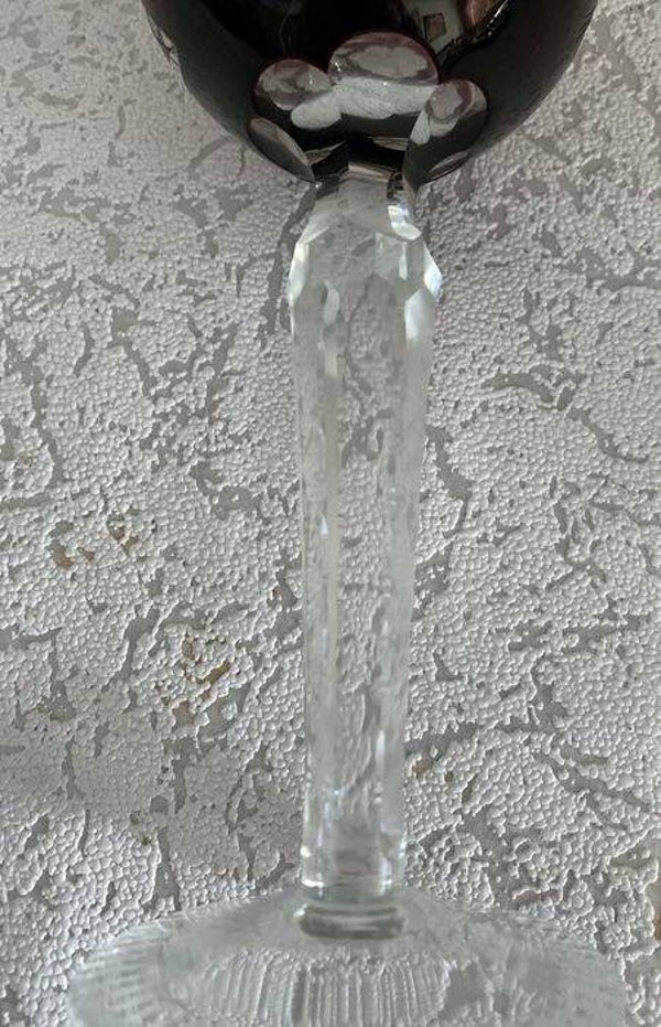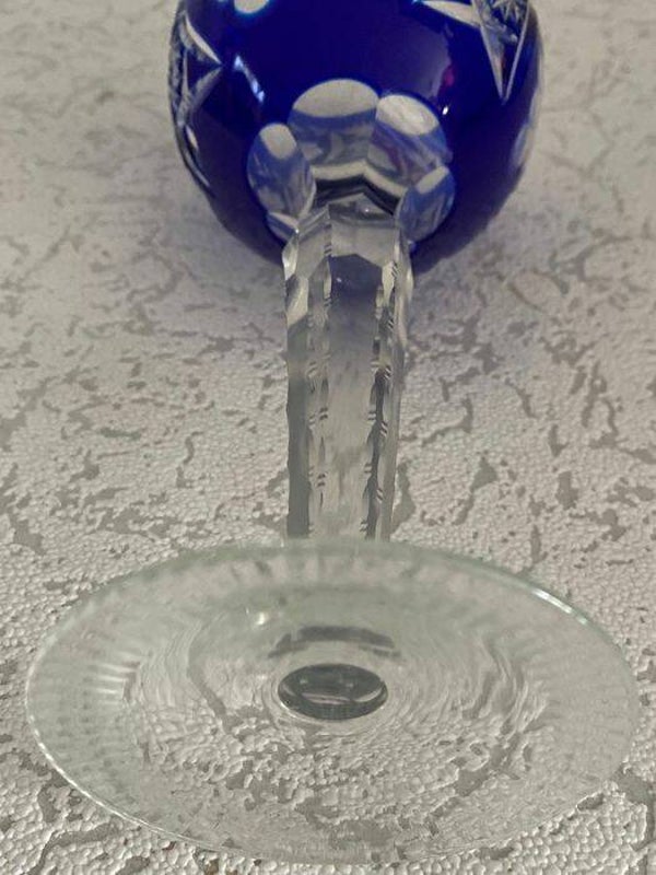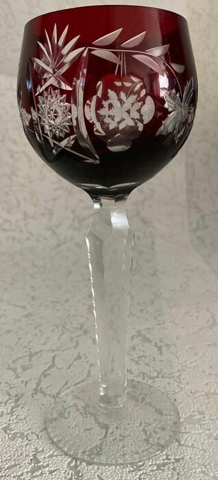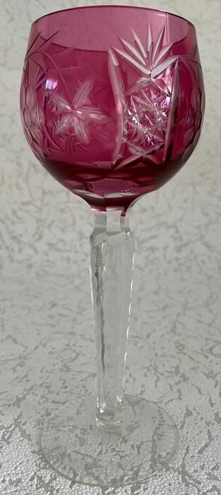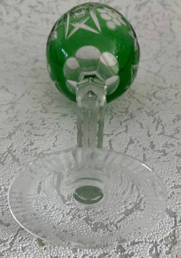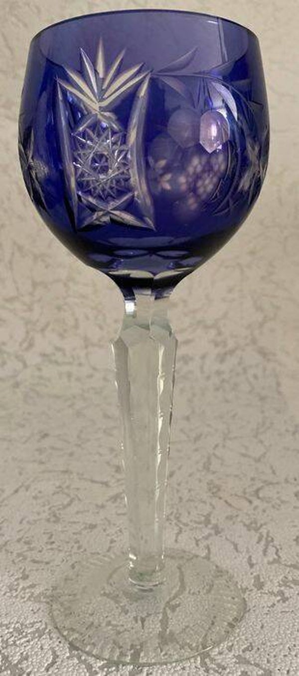 5 gekleurde en geslepen kristallen wijnglazen in de kleuren geel, rood en bordeaux, aquamarijn, chartreuse. Afmetingen: hoogte: ca. 20cm en breedte: 7cm.