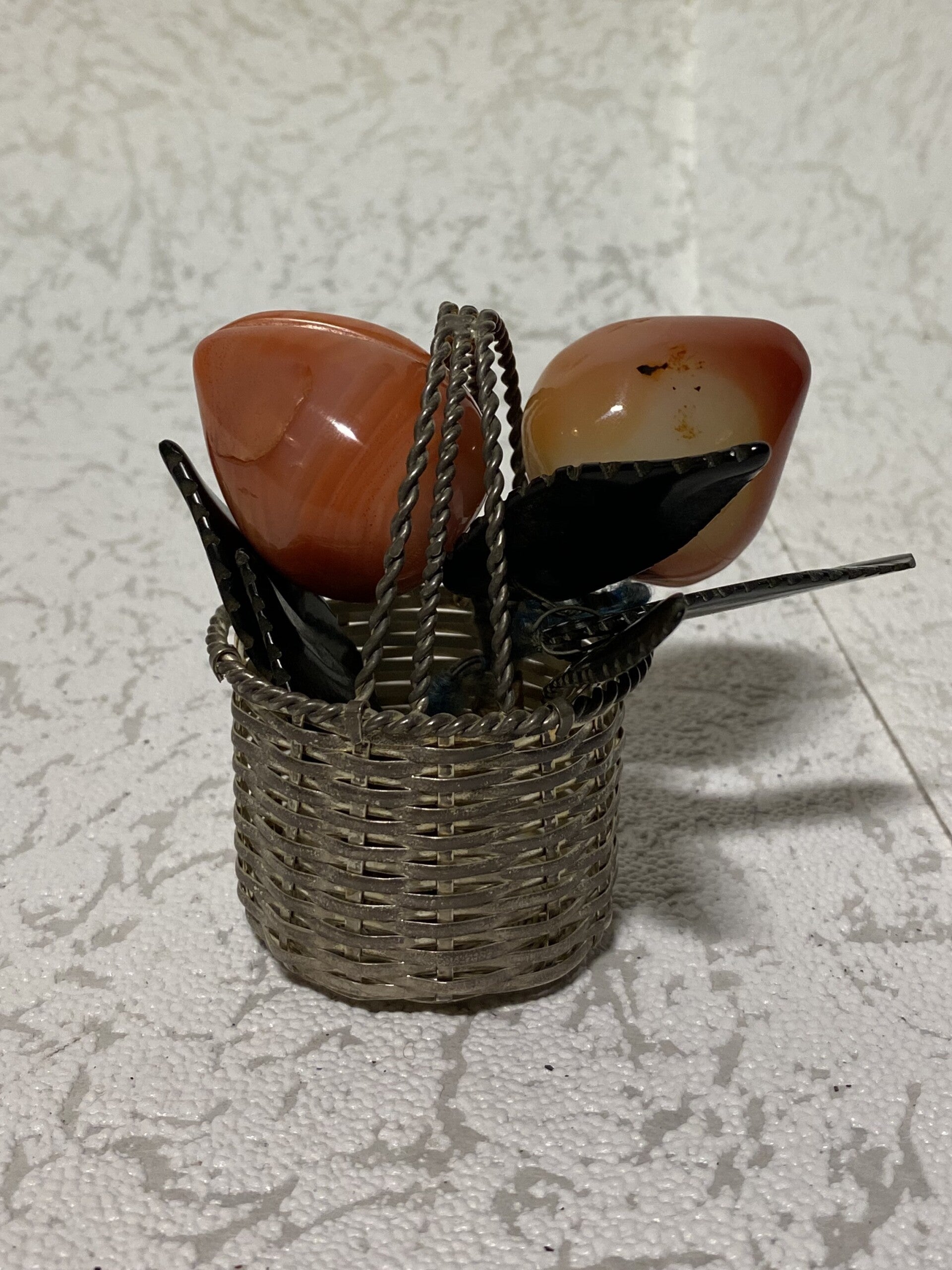 Afmetingen: wijnmanden: lengte: 25 cm, breedte: 9 cm, hoogte: 18 cm.Zoetigheids schalen: 8,5 x 5 cm x 6 cm8,5 cm x 6 cm