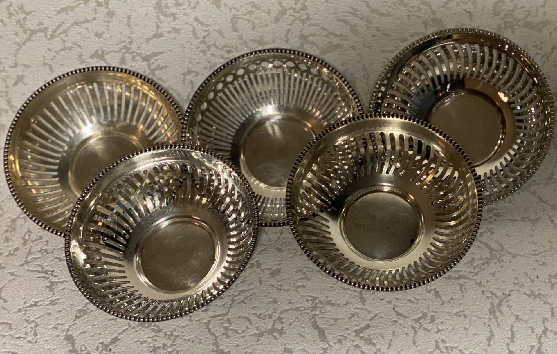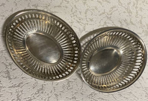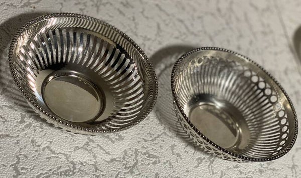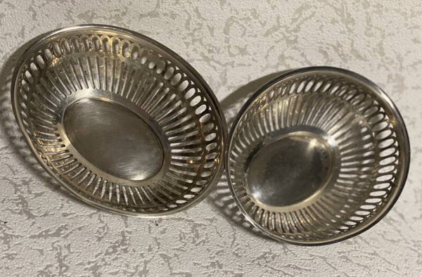 1 grote verzilverde broodmandje en 7 kleine verzilverde bonbonmandjes.