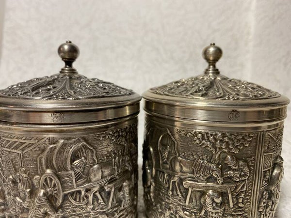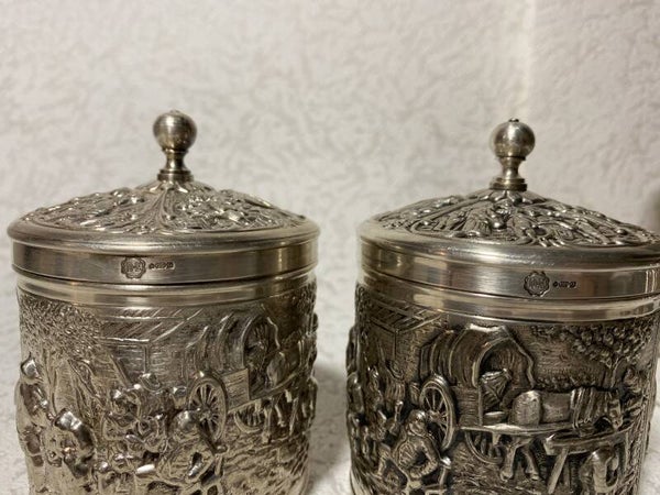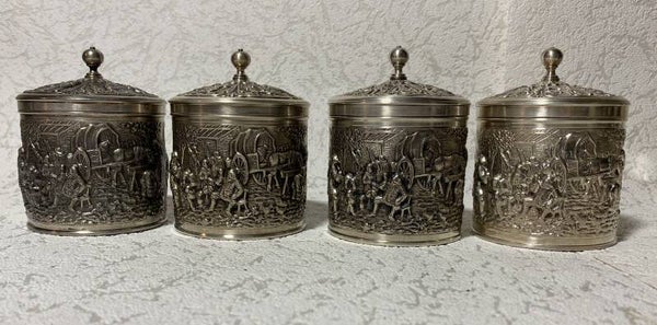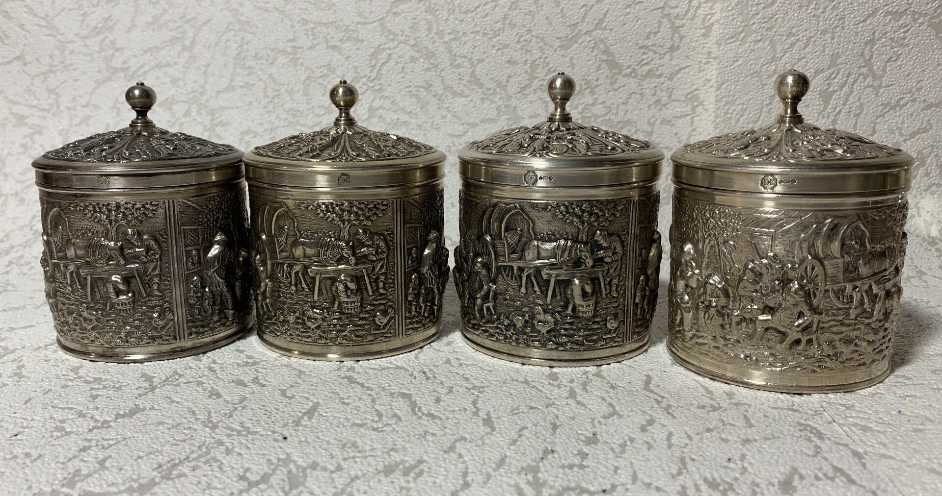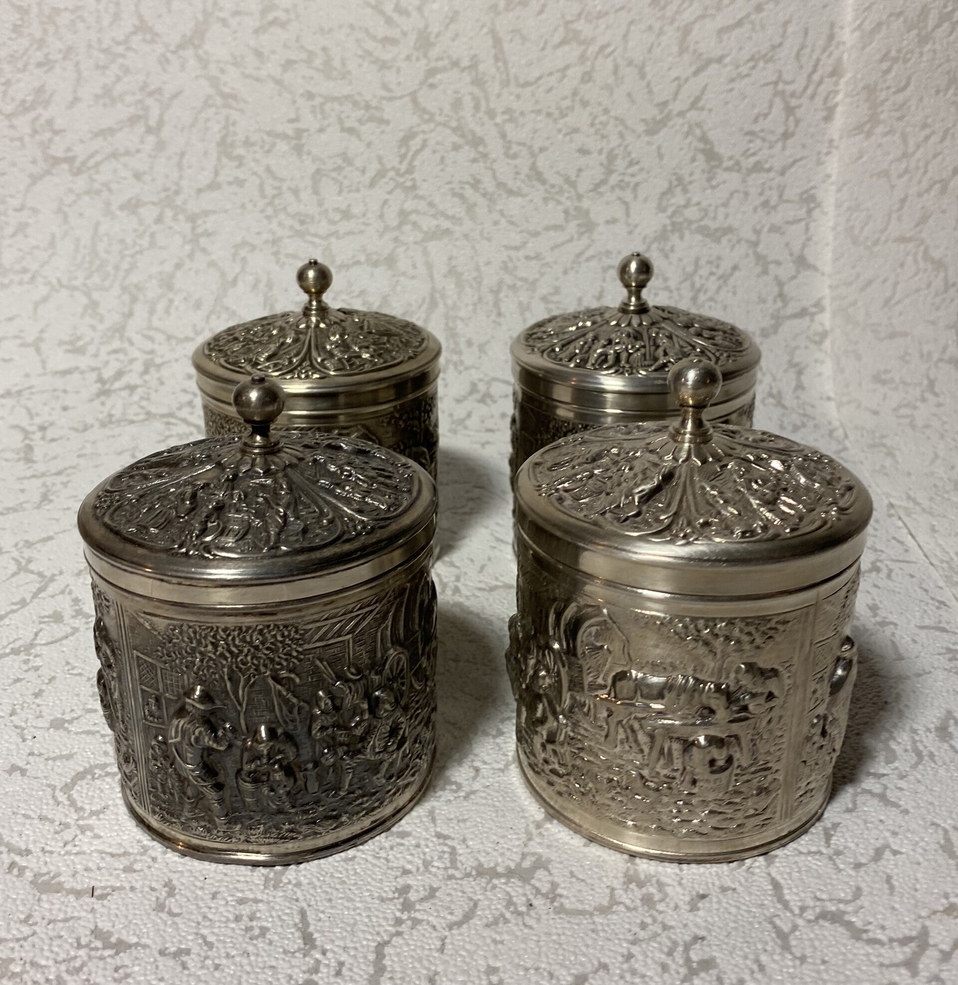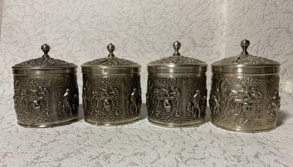 4 verzilverde Douwe Egberts theebussen met deksels. Alle theebussen verbeelden dezelfde scenarios.