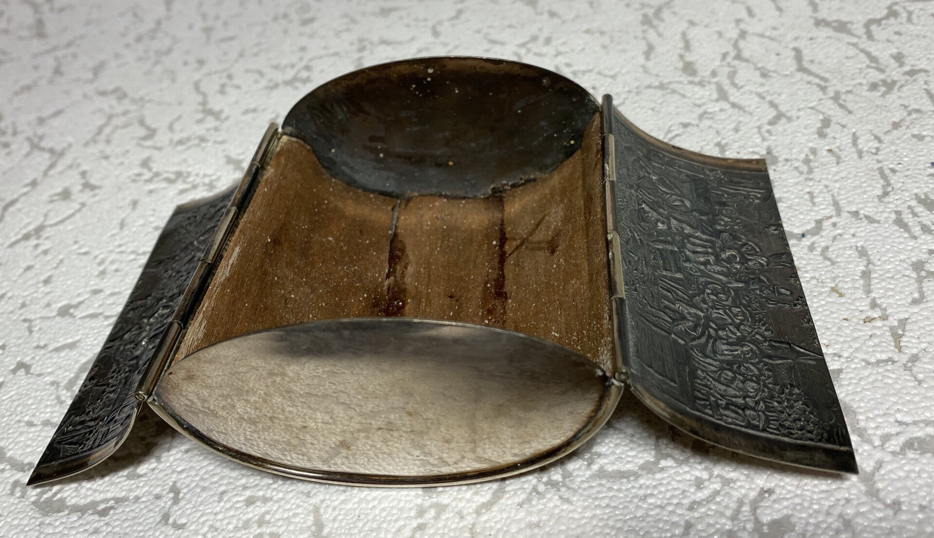 Verzilverde sigarettendoos van Herbert Hooijkaas.