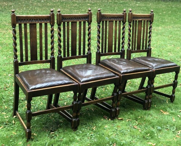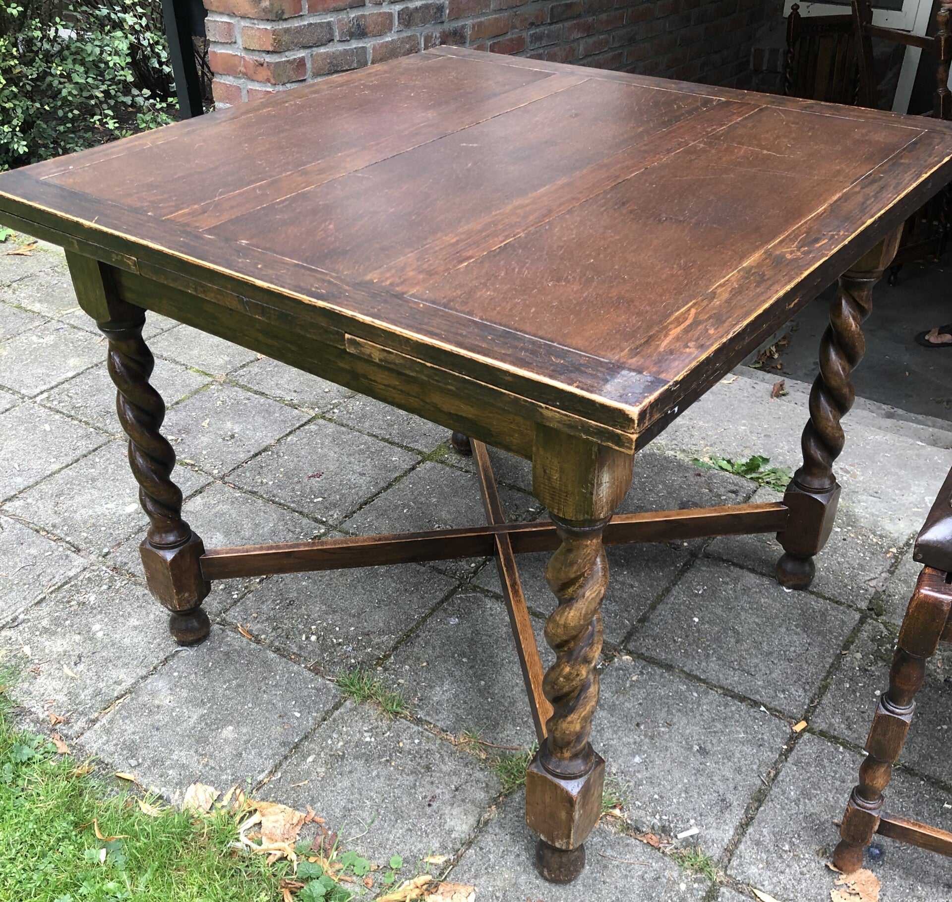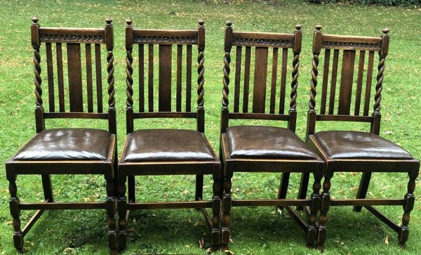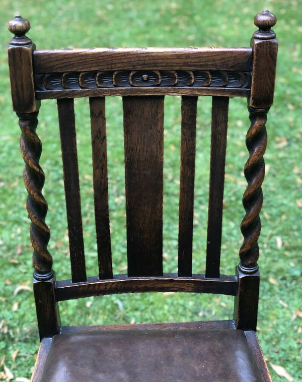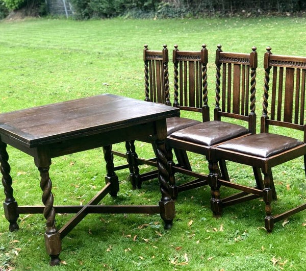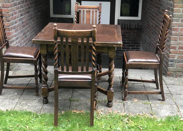 Engelse (draw leaf) eikenhouten trekblad dineertafel met bijbehorende leren stoelen allemaal in barley twist stijl. 1920-1940.