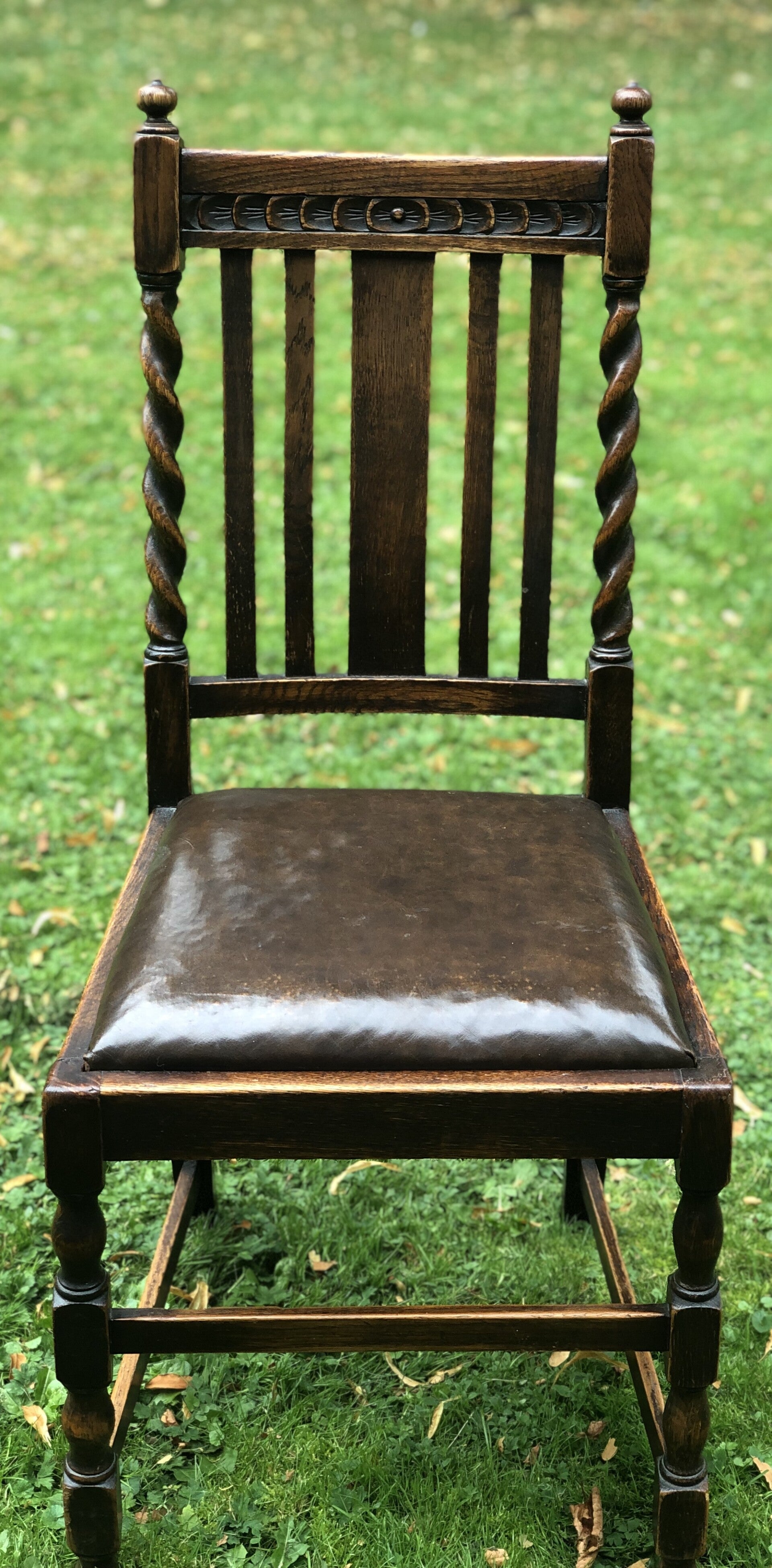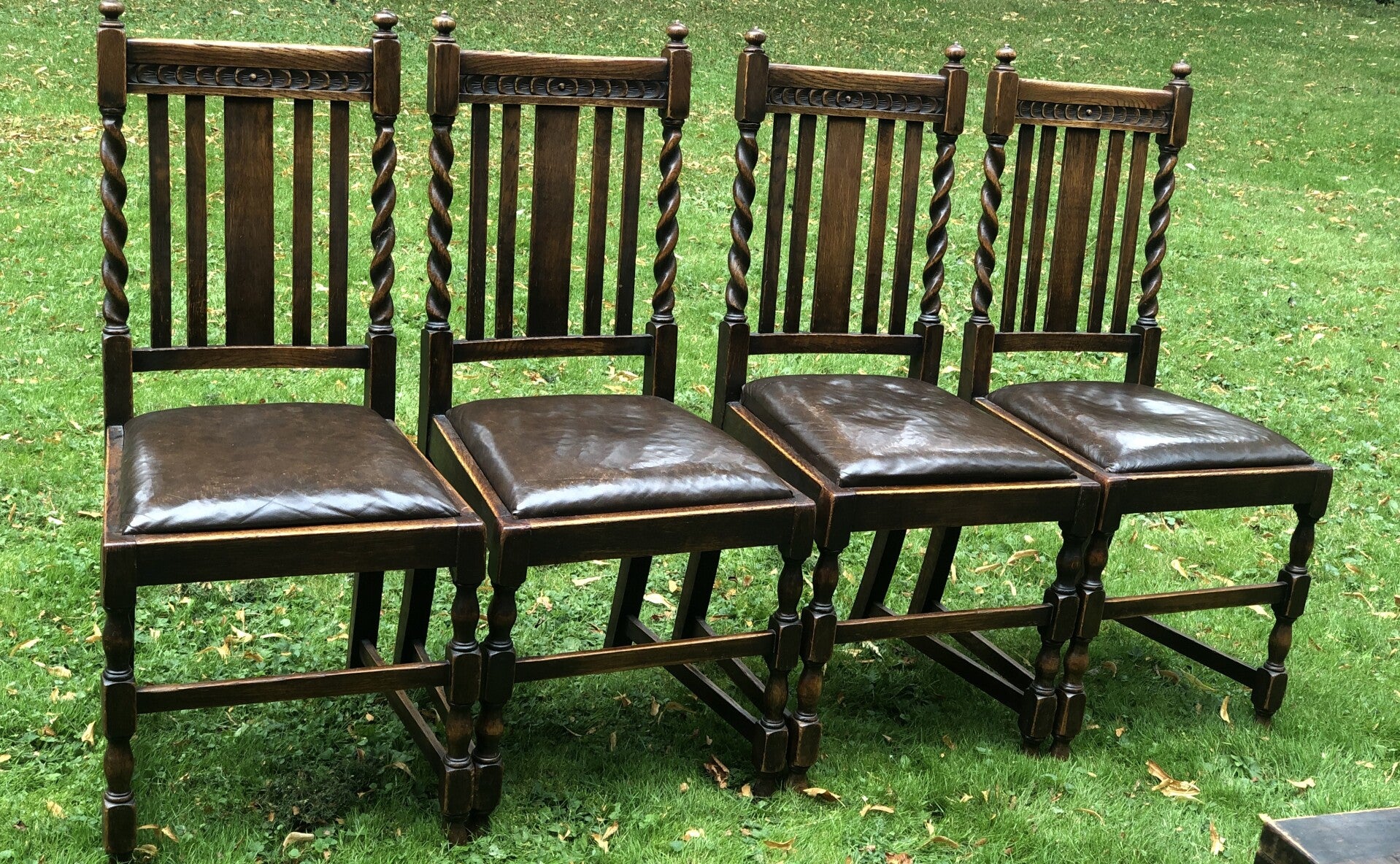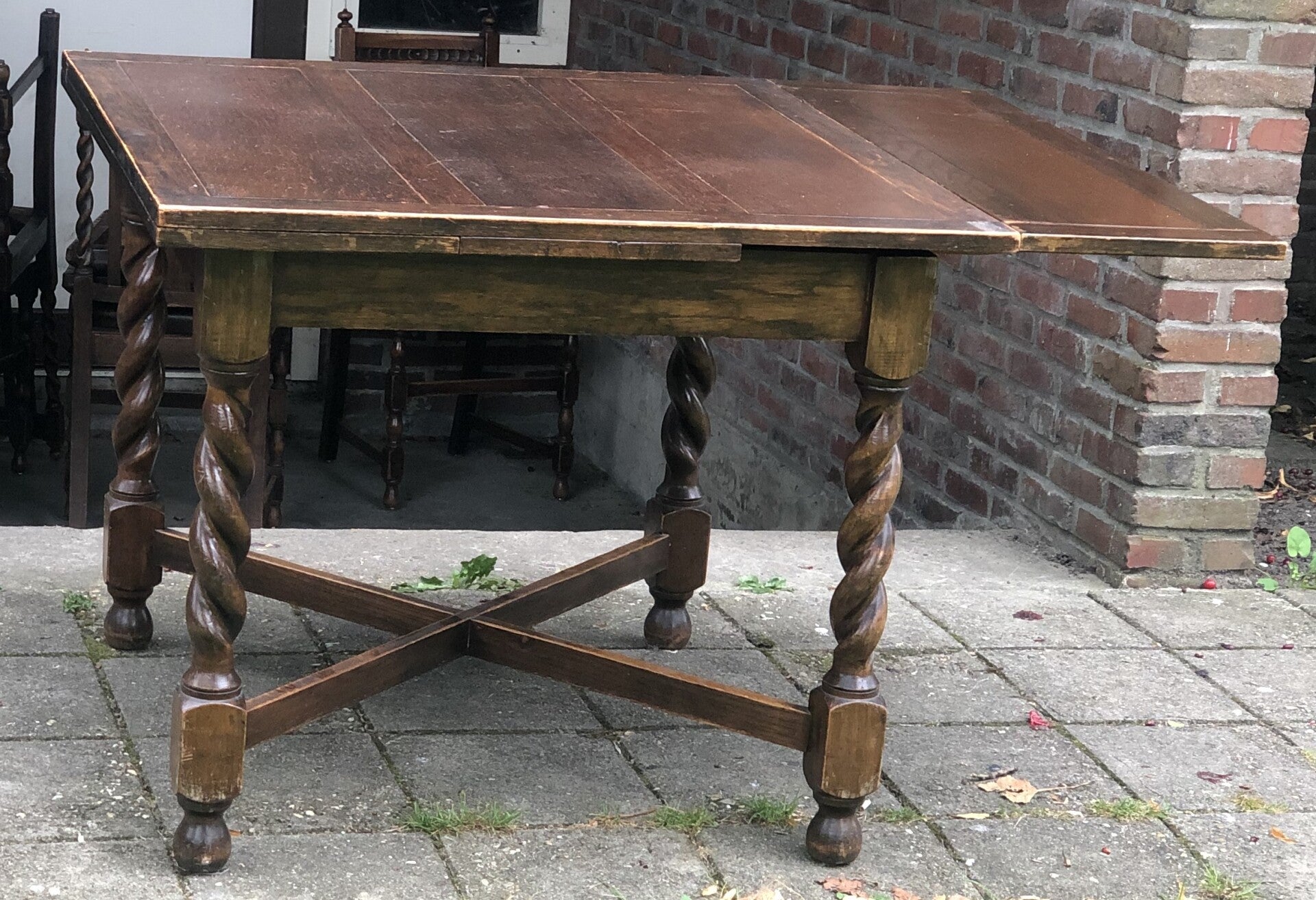 Engelse (draw leaf) eikenhouten trekblad dineertafel met bijbehorende leren stoelen allemaal in barley twist stijl. 1920-1940.