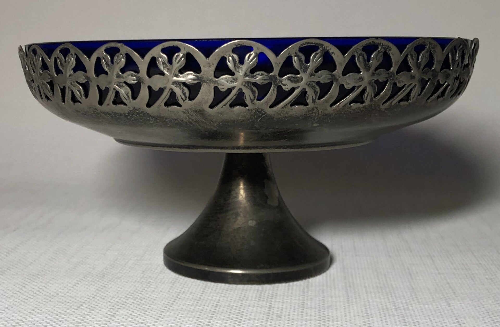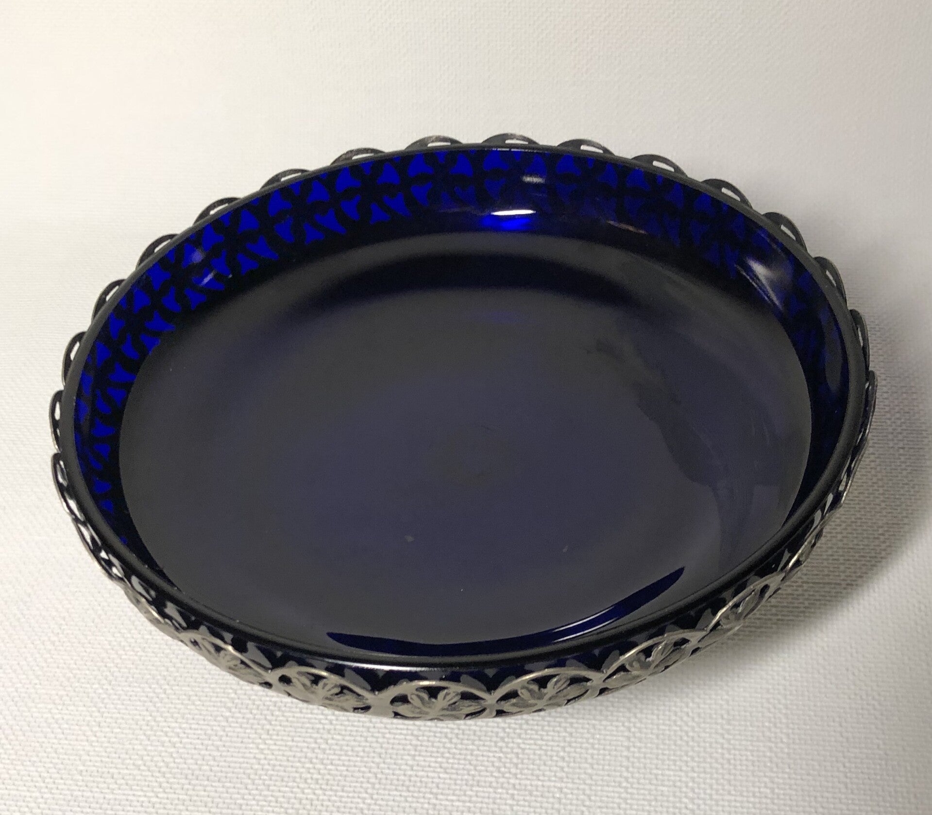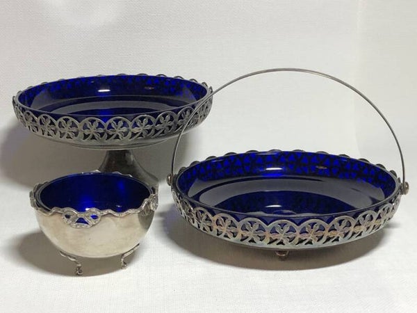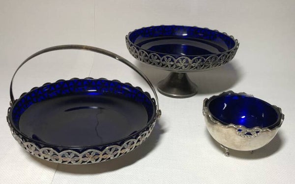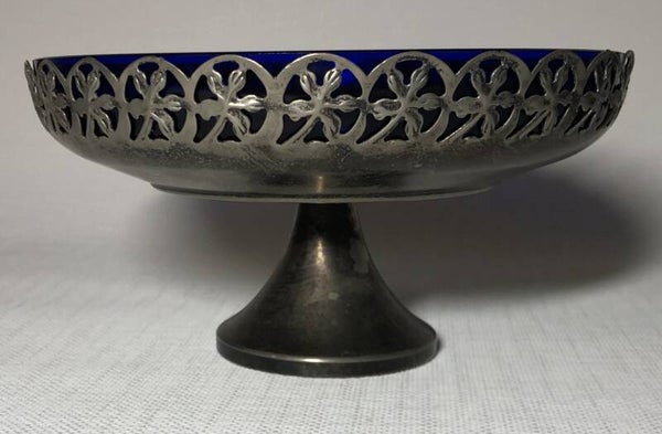 Glazen kobalt in verzilverde schaal op voet.