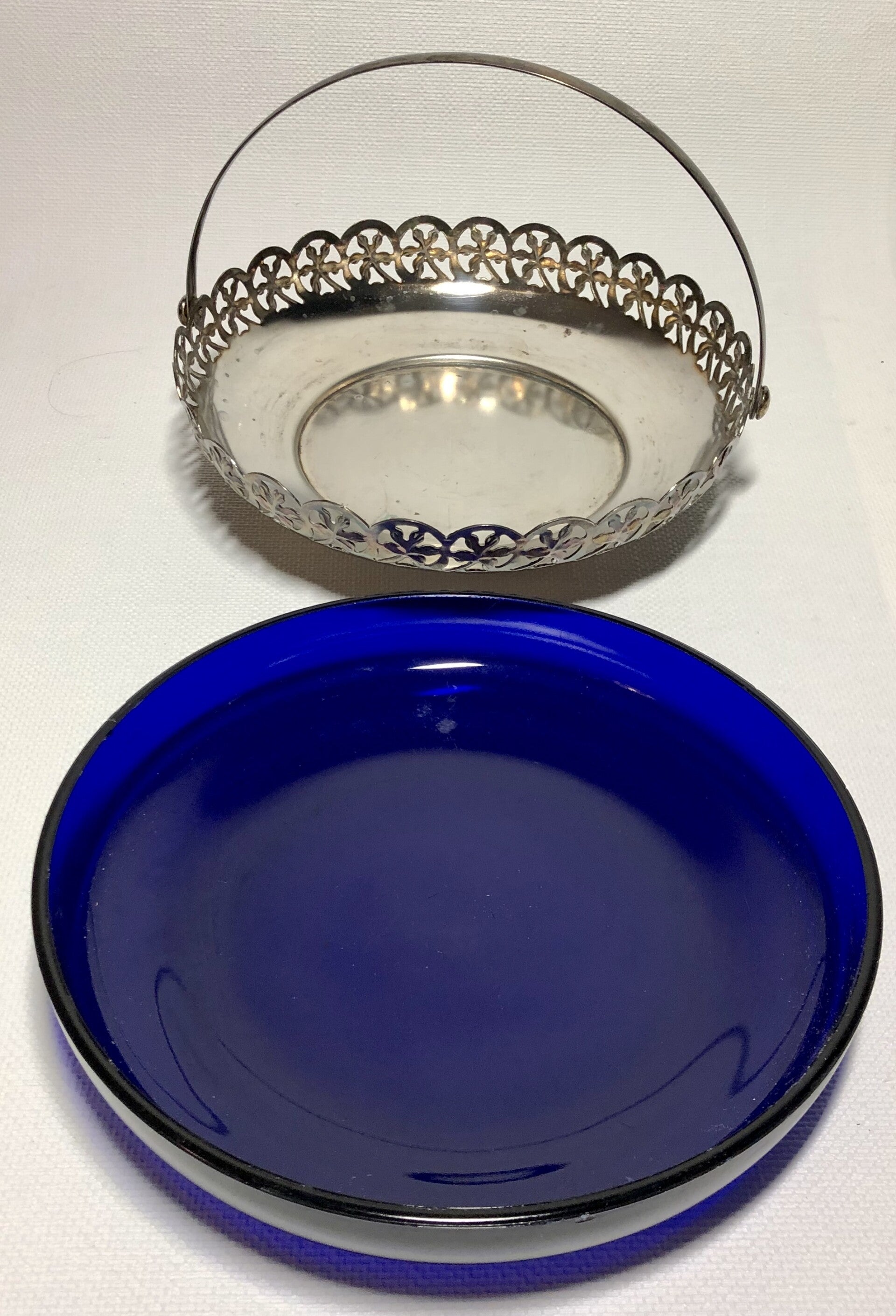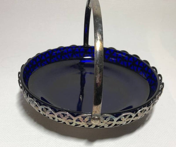 Glazen kobalt in verzilverde schaal met handvat.