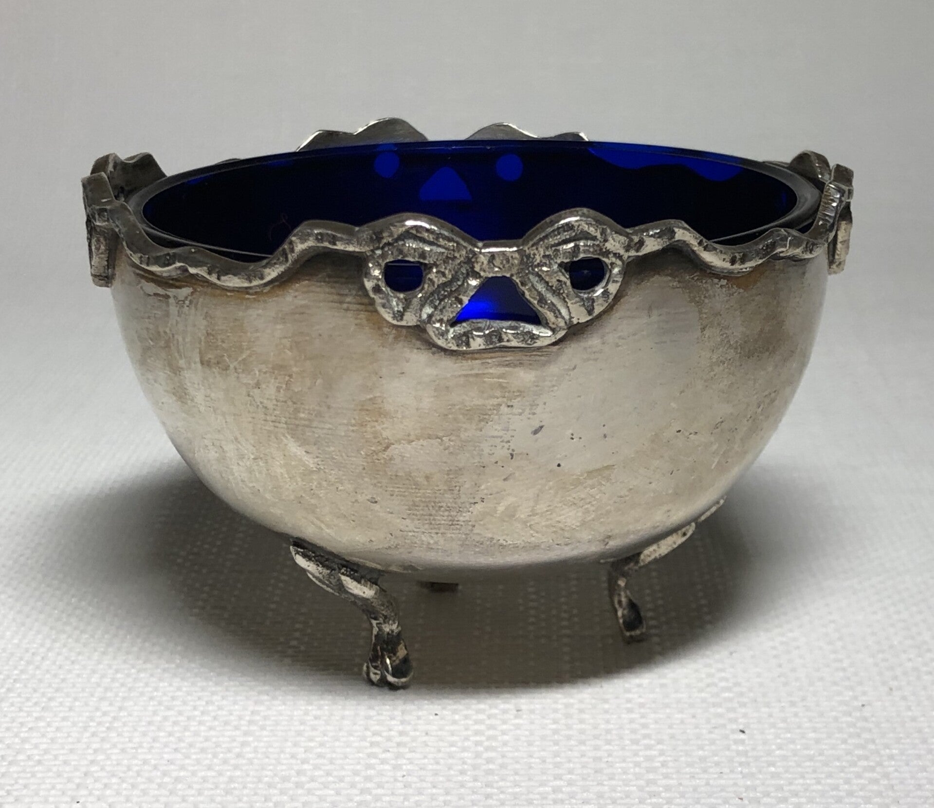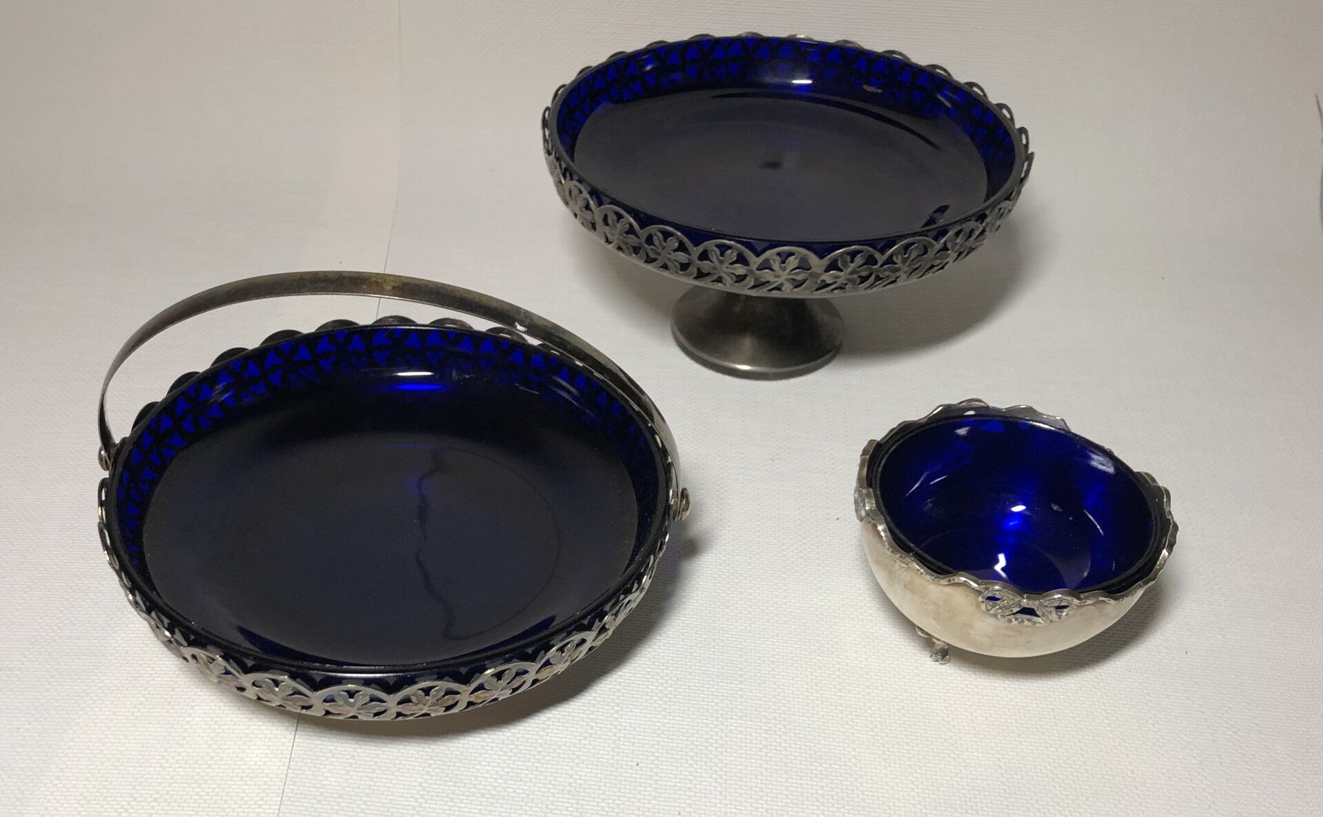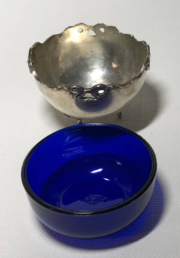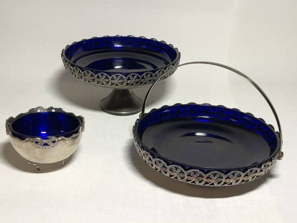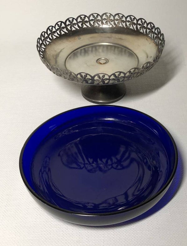 Glazen kobalt in 3 voets verzilverde bonbonschaaltje.
