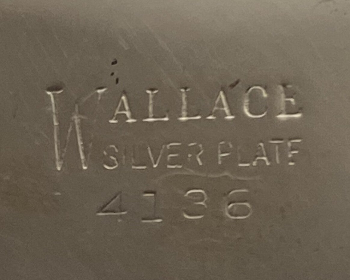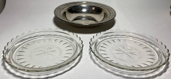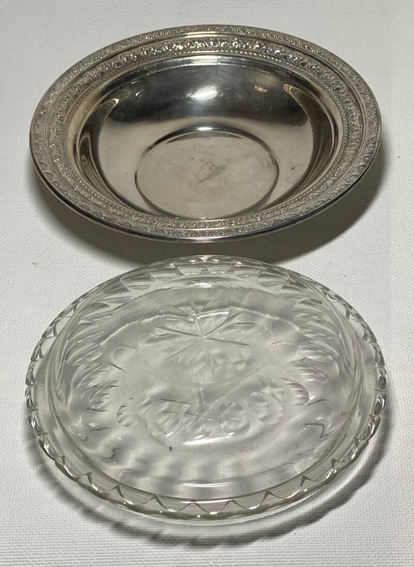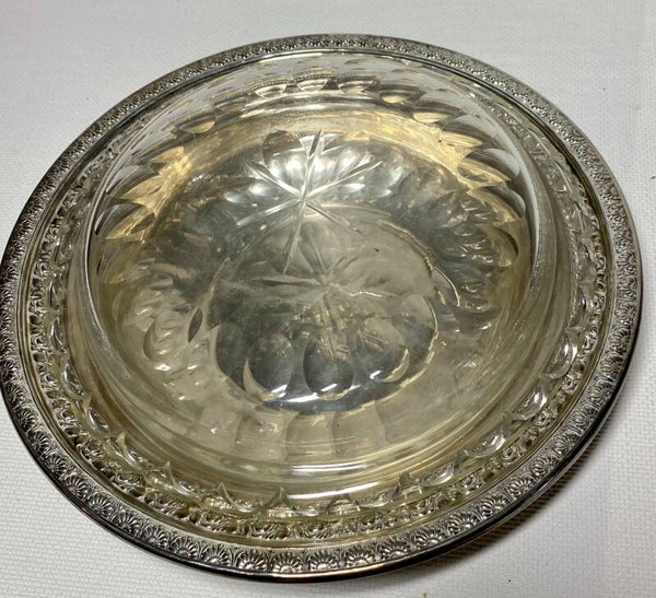 Gegraveerde verzilverde schaal met kristallen decoratie.