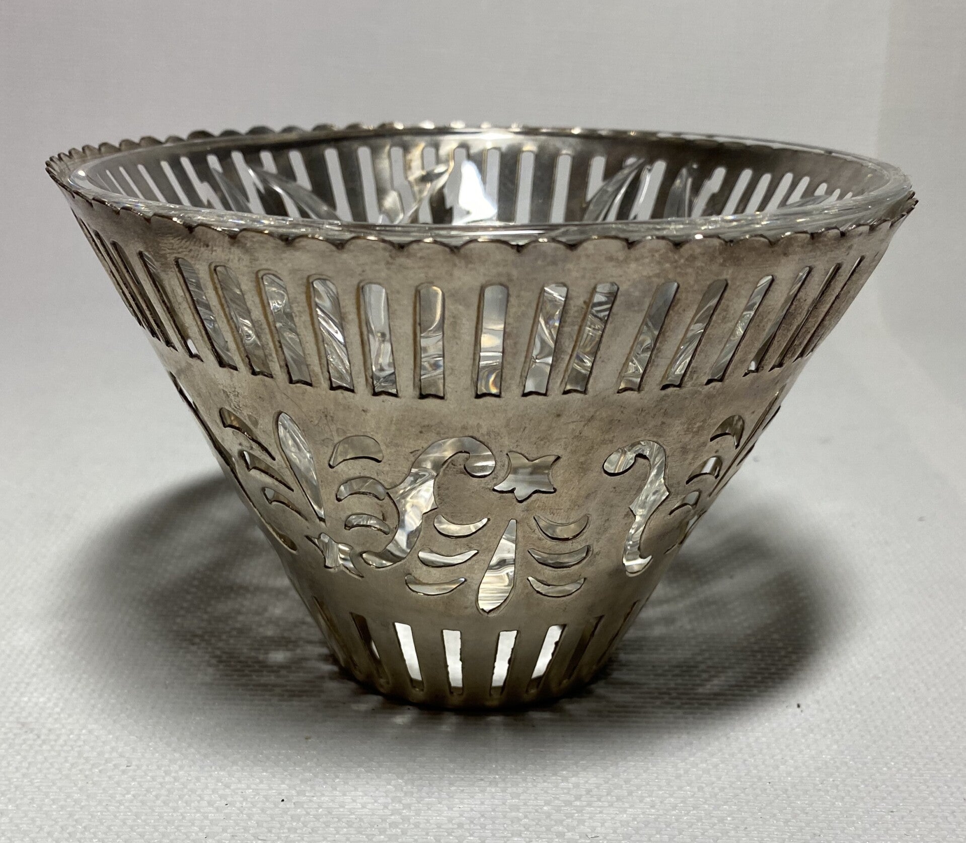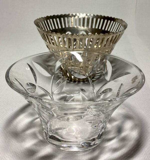 Verzilverde schaal met inhoud kristal.